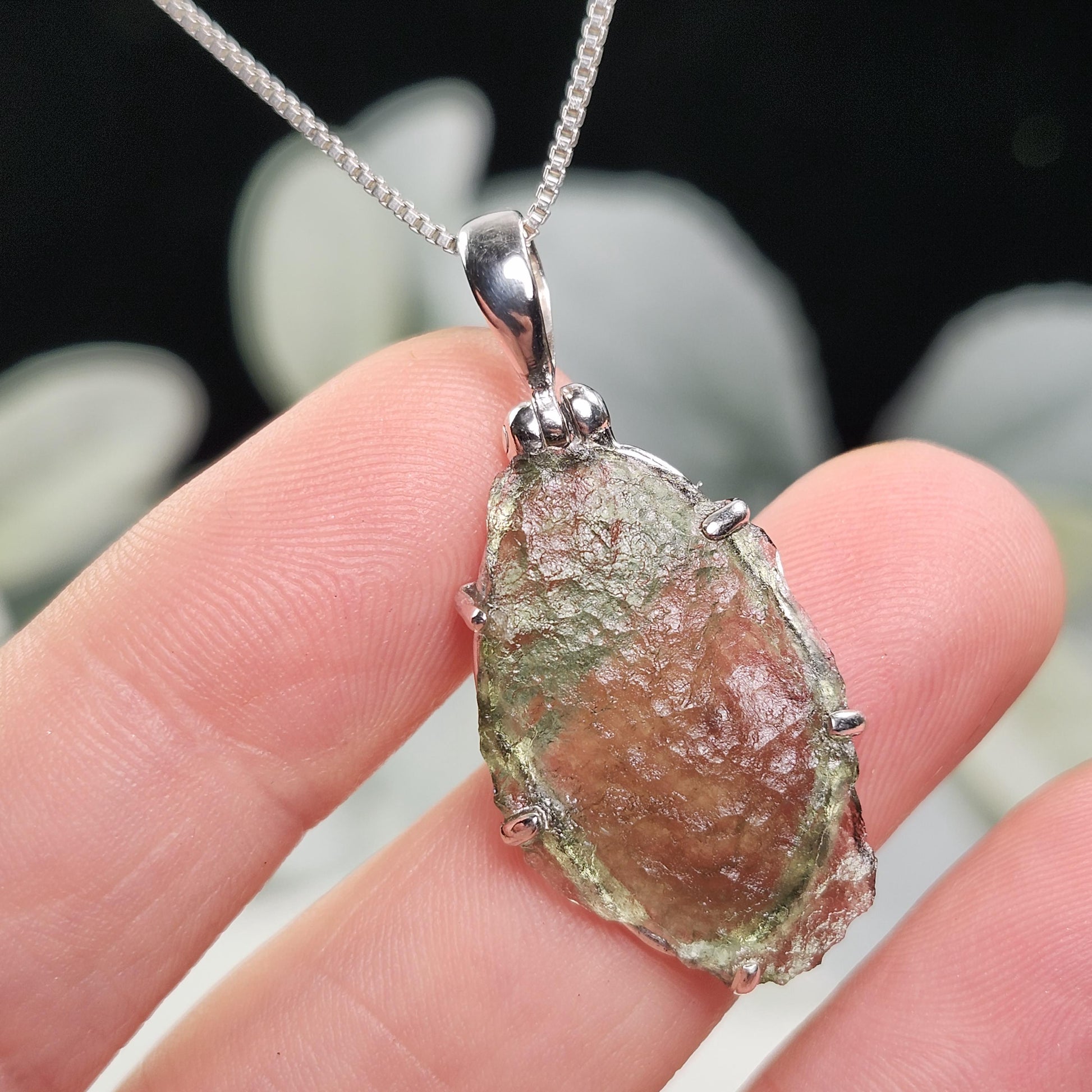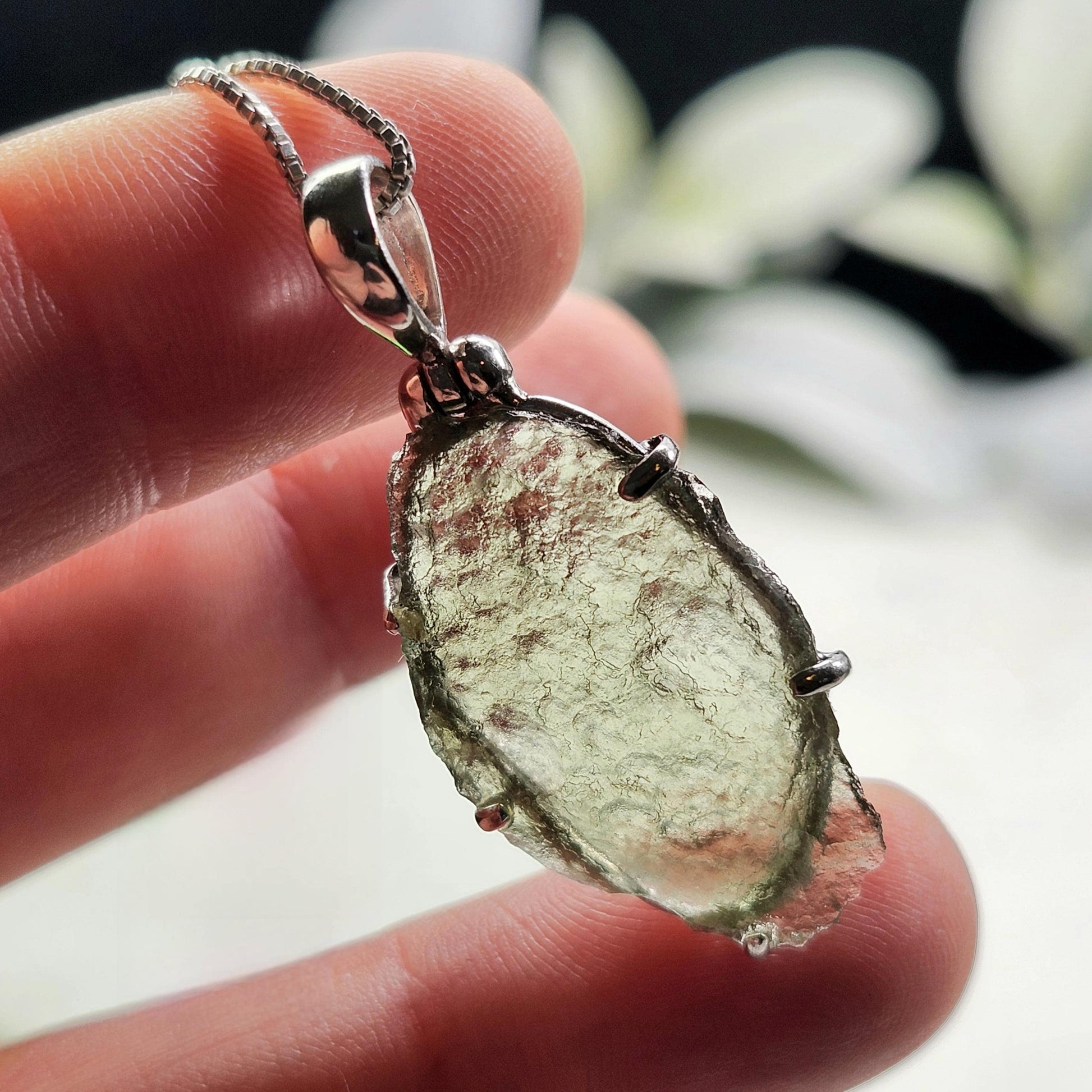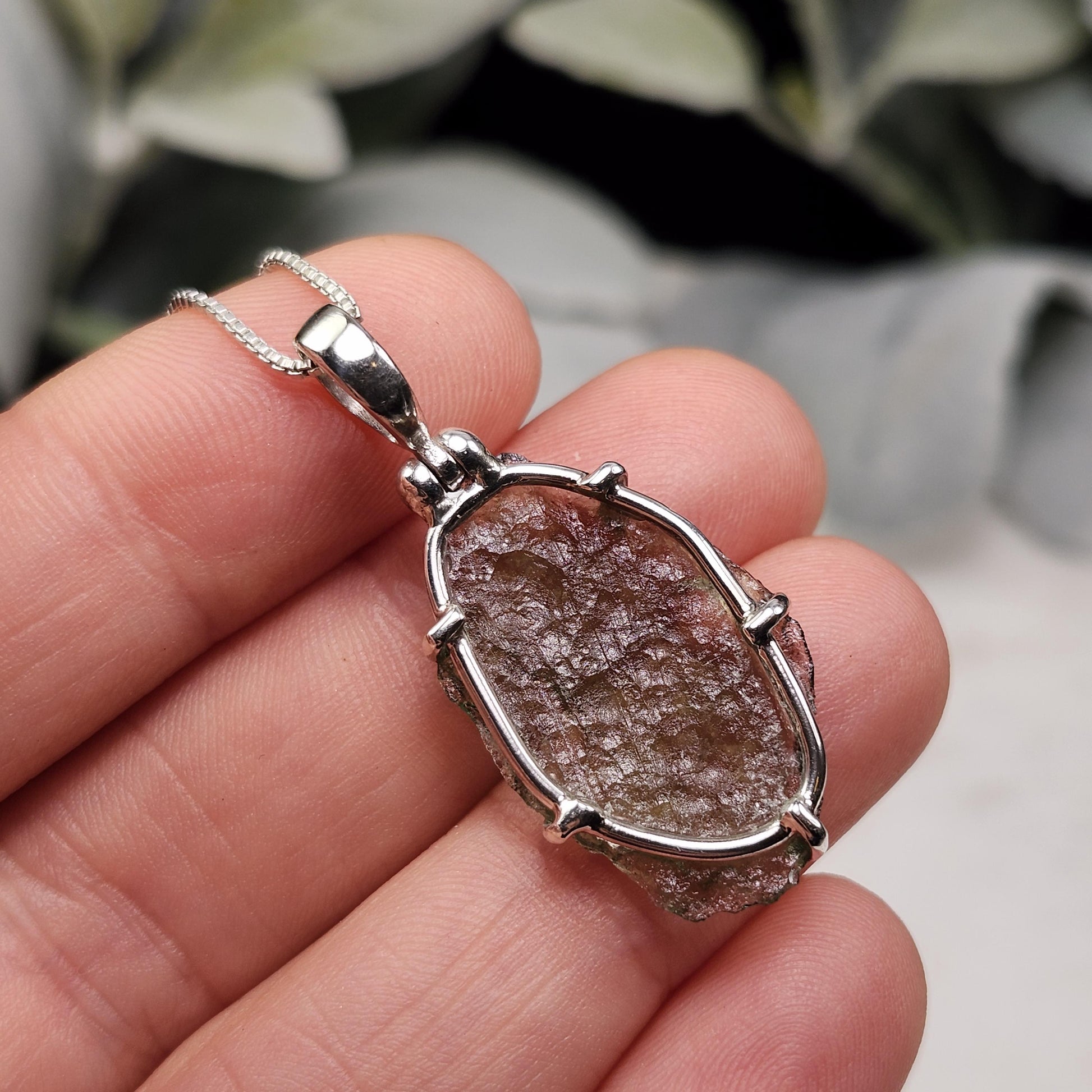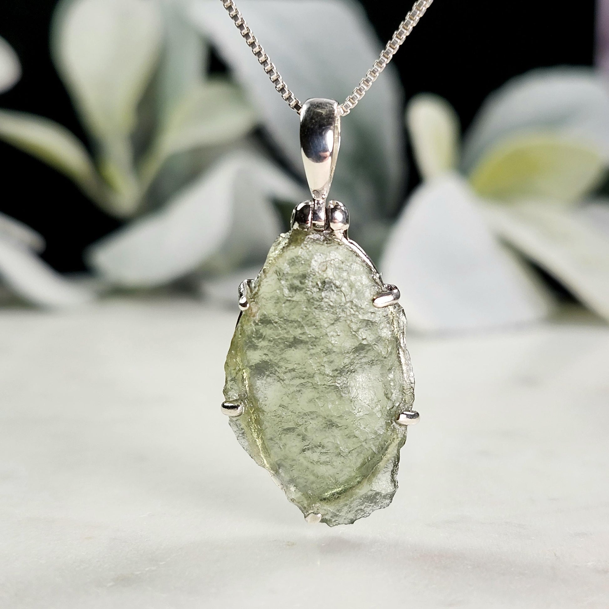 This Moldavite tektite exhibits a classic green coloring with pitting on its raw surface. This crystal has been custom created into a sturdy piece of jewelry using .925 Sterling Silver. This pendant measures approximately 35mm by 17mm. The silver chain used in the photos is to help envision how this pendant will look while adorned but is not included in the listing.