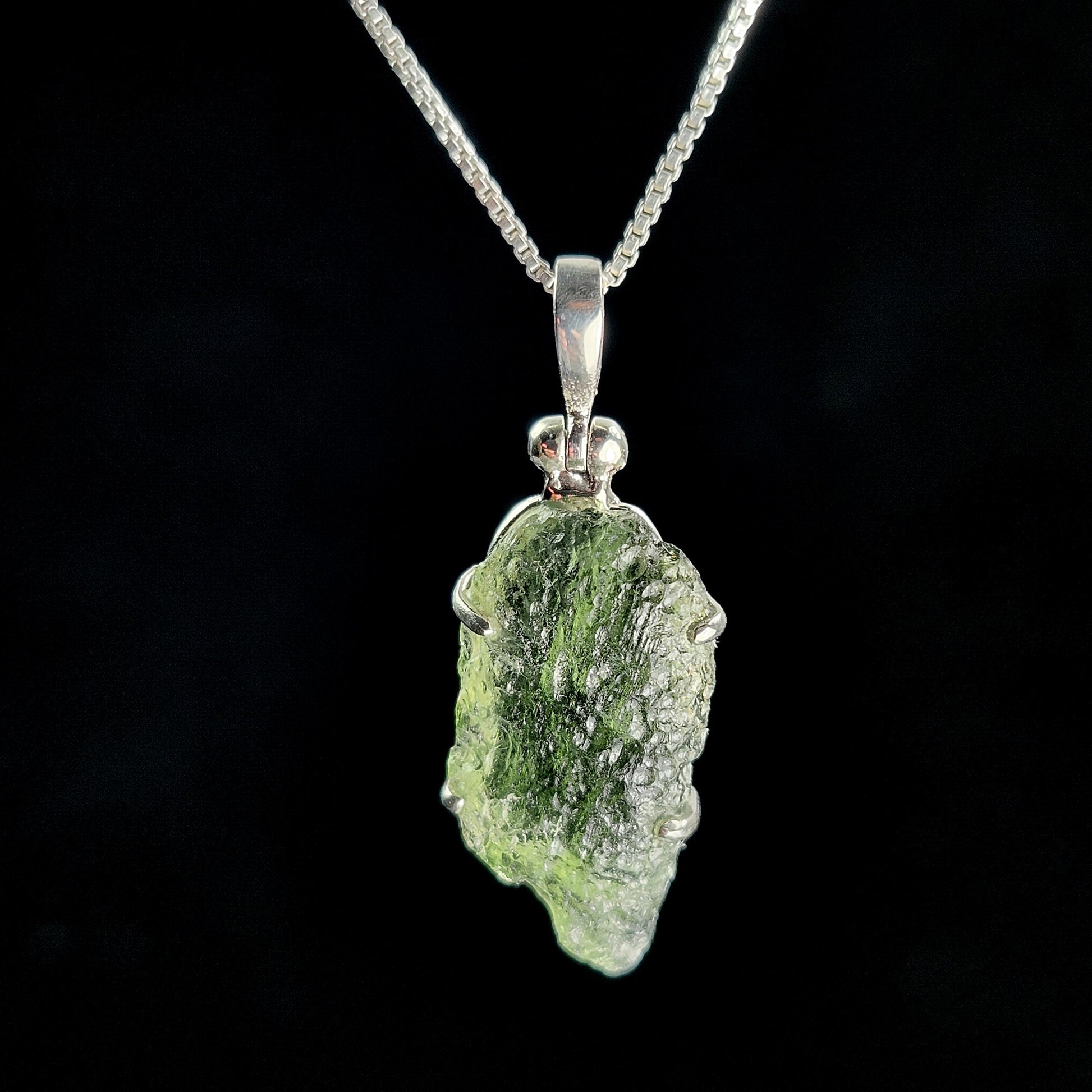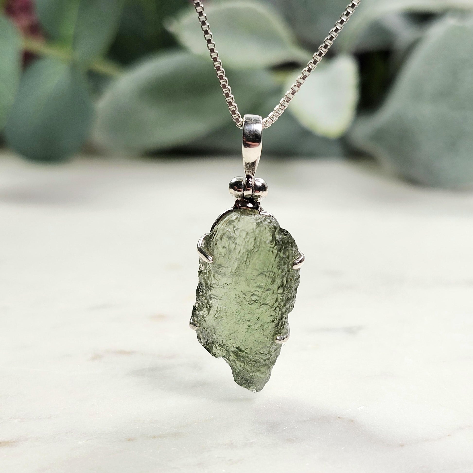 This Moldavite tektite exhibits a classic green coloring with pitting on its raw surface. This crystal has been custom created into a sturdy piece of jewelry using .925 Sterling Silver. This pendant measures approximately 32mm by 12mm. The silver chain used in the photos is to help envision how this pendant will look while adorned but is not included in the listing.