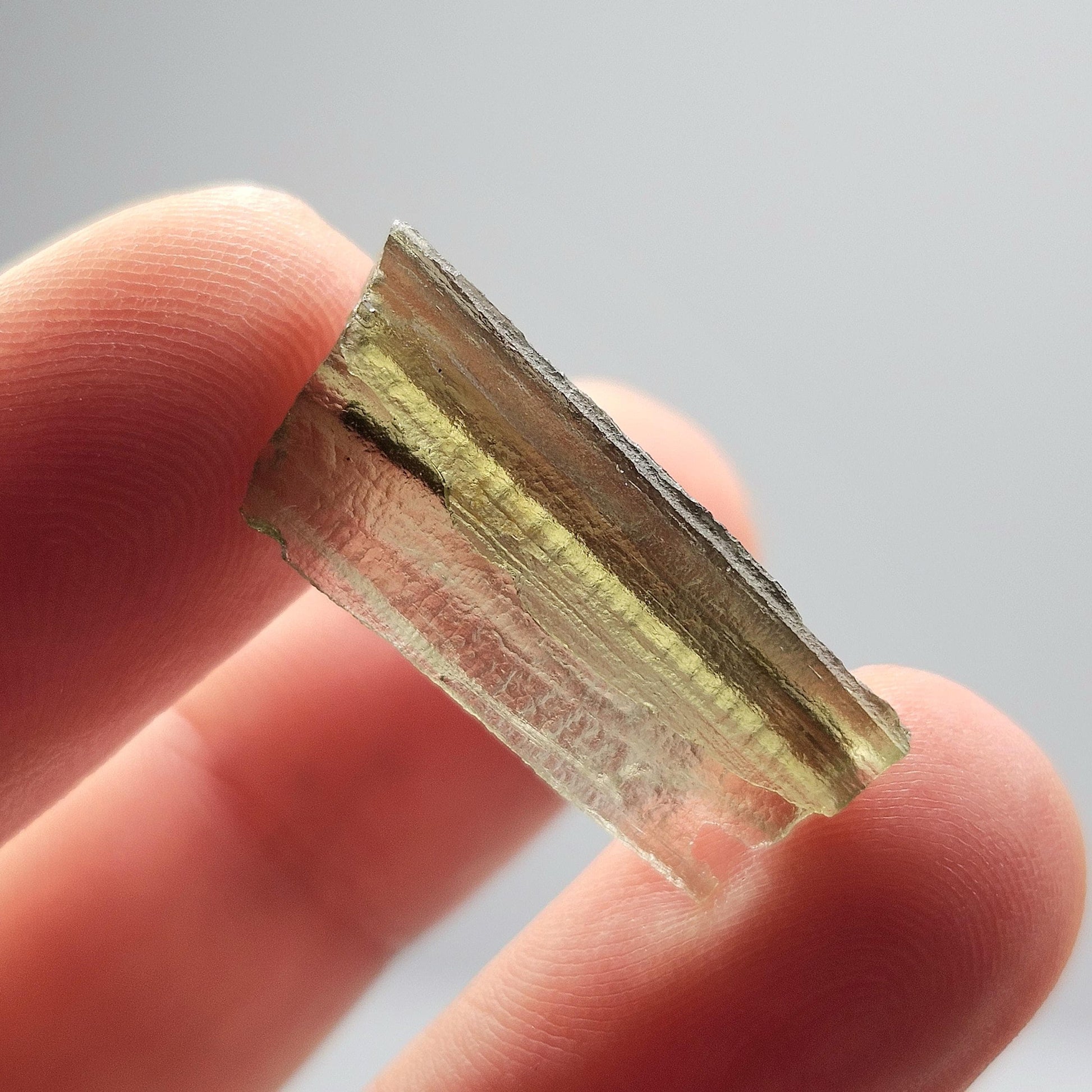 This authentic Moldavite tektite from the Czech Republic exhibits striations and a green translucence. This specimen measures 22mm by 10mm by 4mm and weighs 1.2 grams.