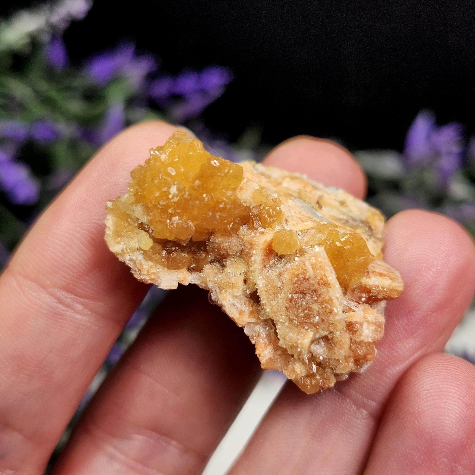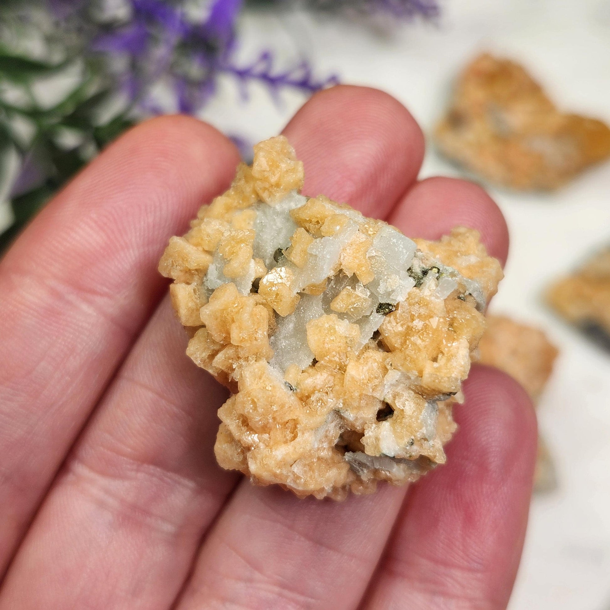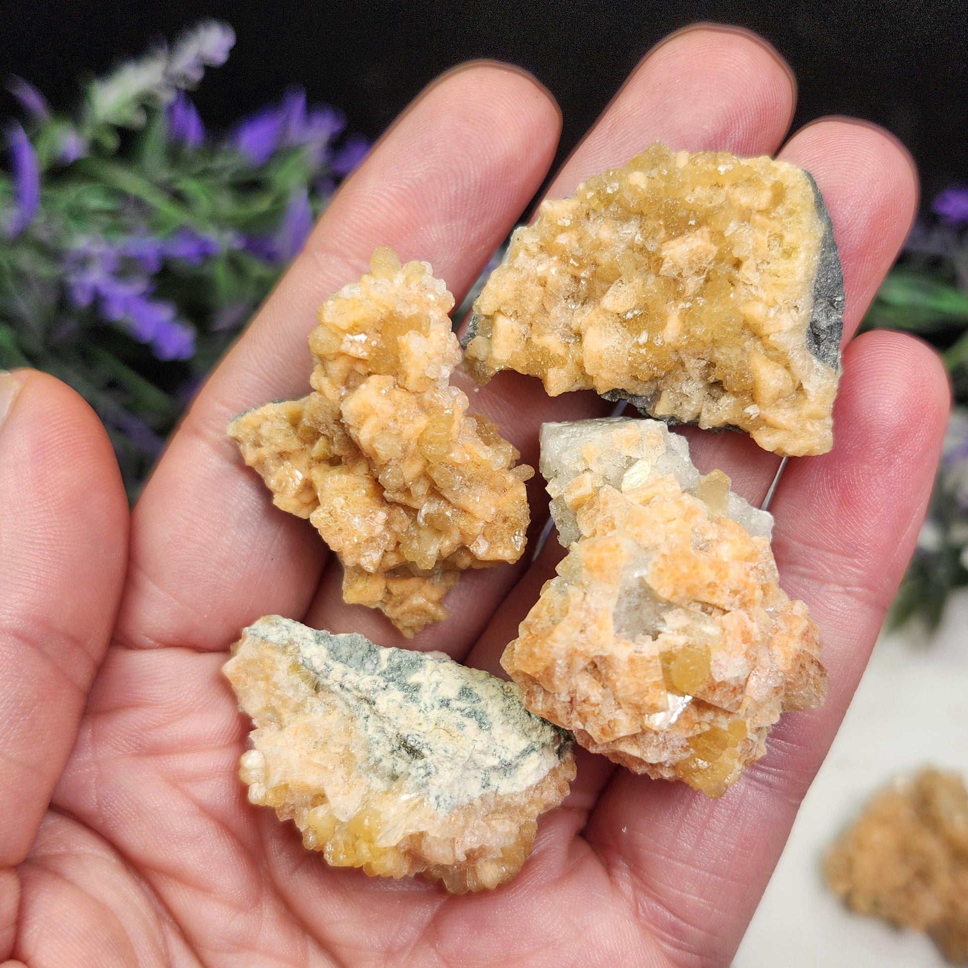 These gemstone clusters feature orange Gmelinite crystallization along with peachy colored or blue-grey colored Chabazite that has cubic growth. These combination minerals from are from Kazakhstan and have freeform shapes. Each specimen measures 1 inch and up.