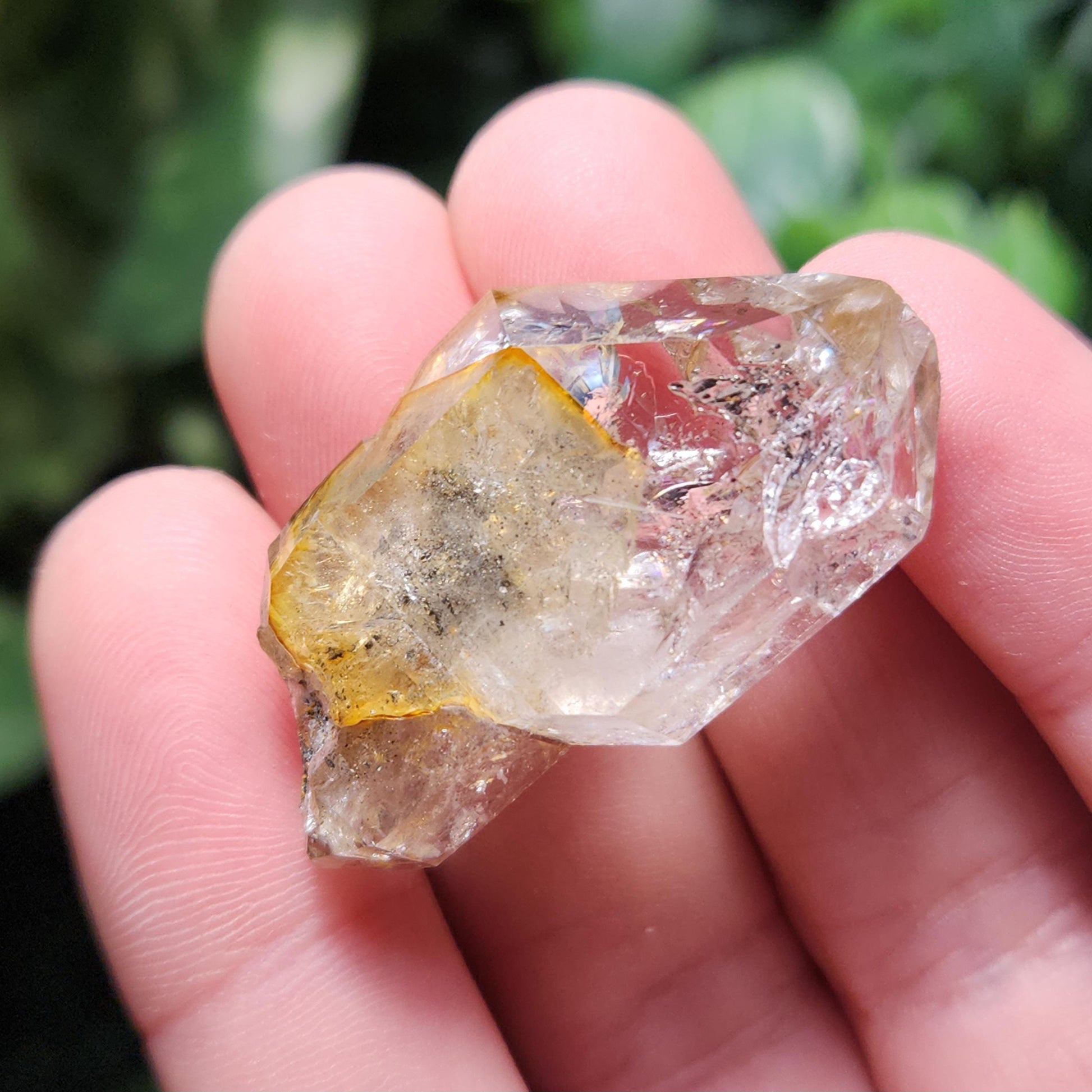 This unique Herkimer Diamond Quartz was mined from the Herkimer, New York area. It has a glowing translucence with a hint of golden coloring. This specimen measures approximately 35mm by 21mm and weighs 12.7 grams.