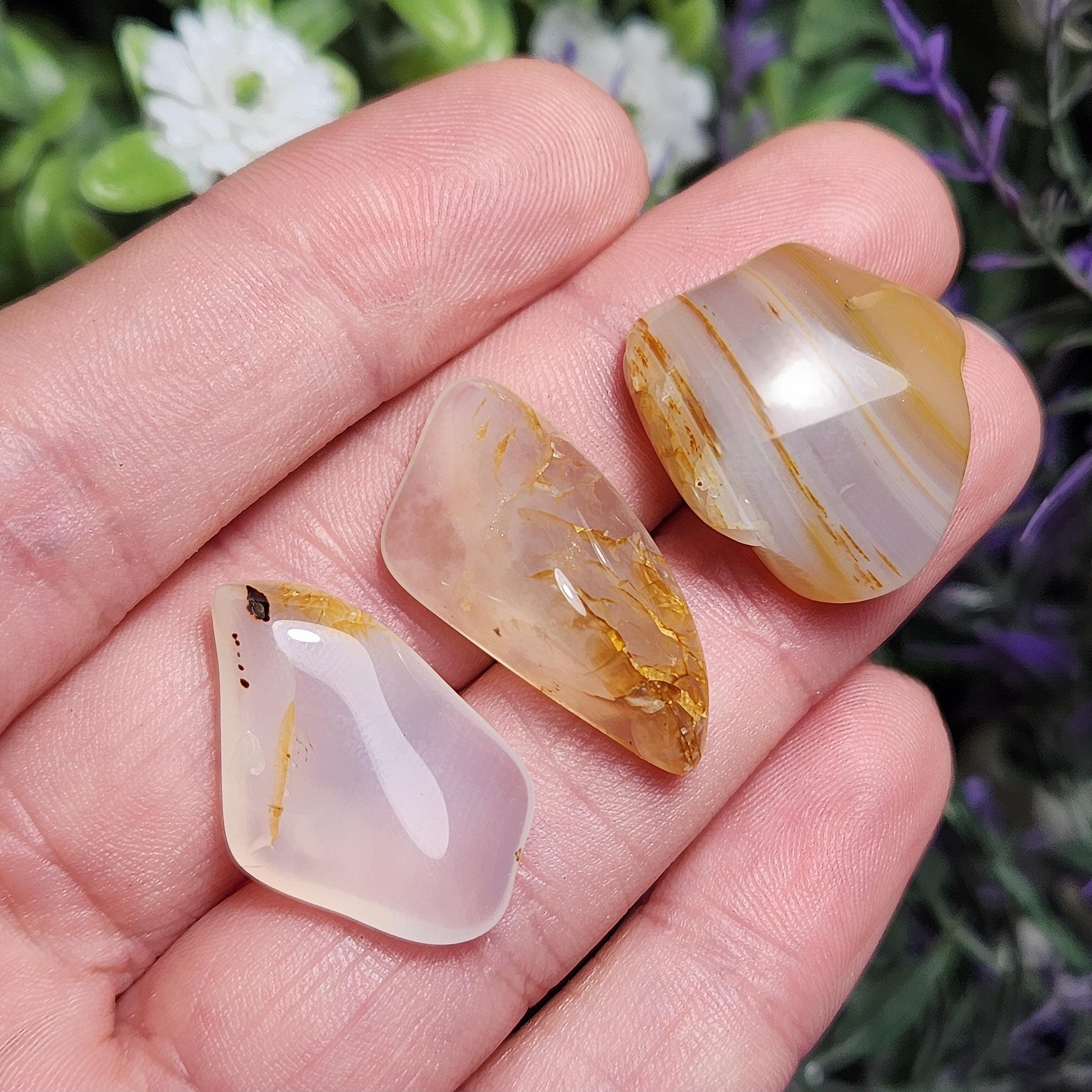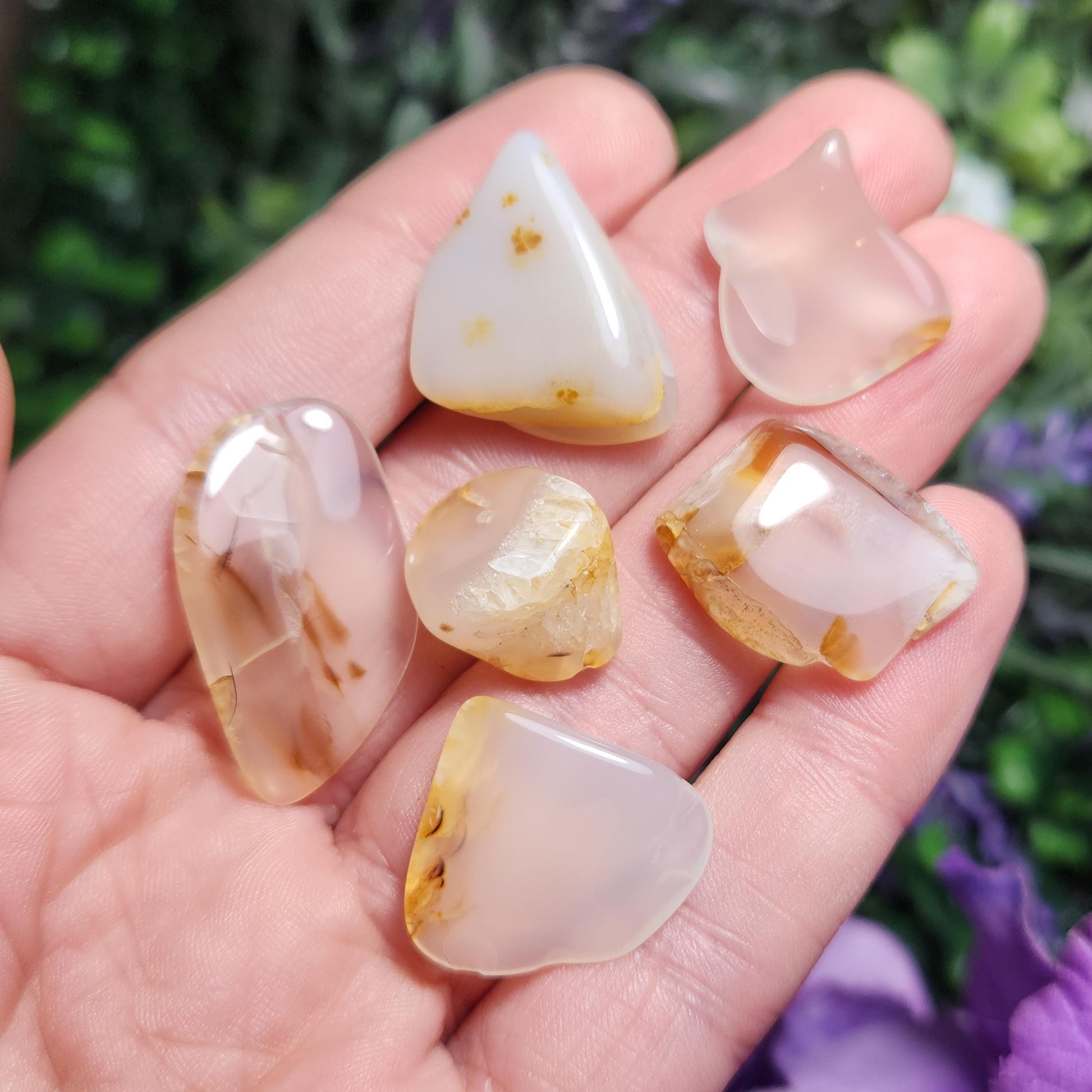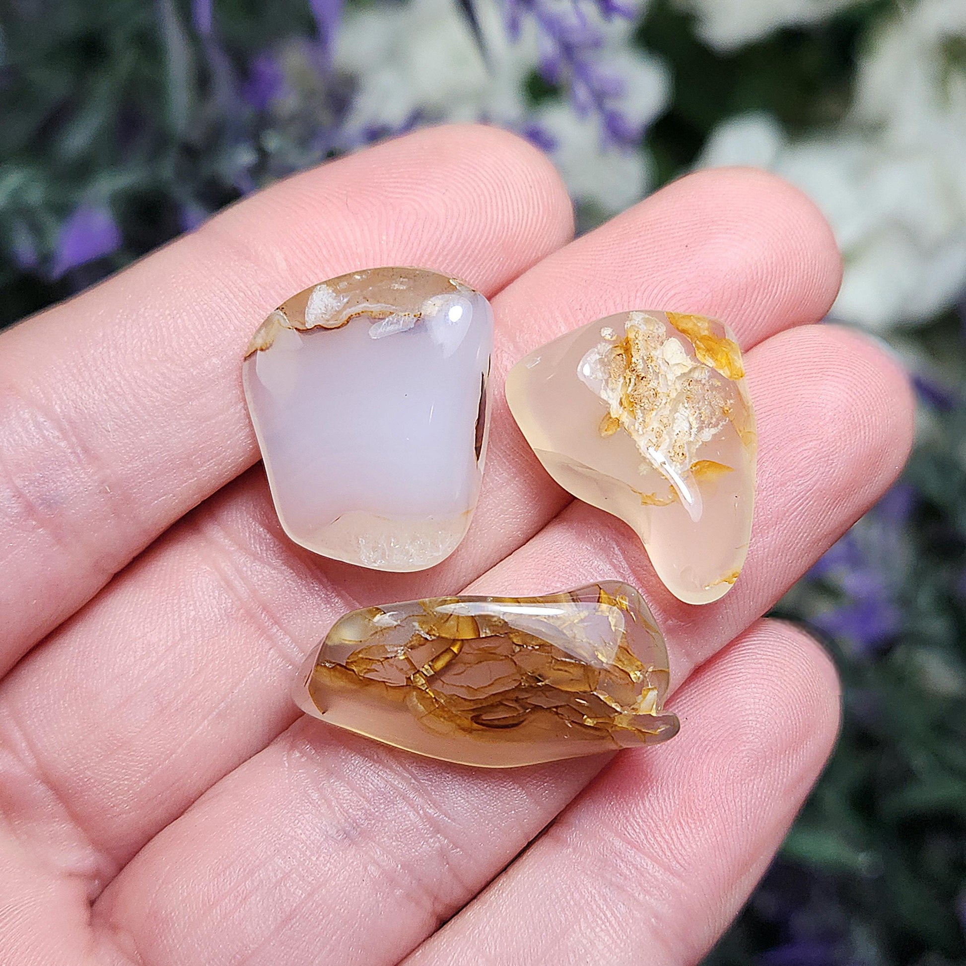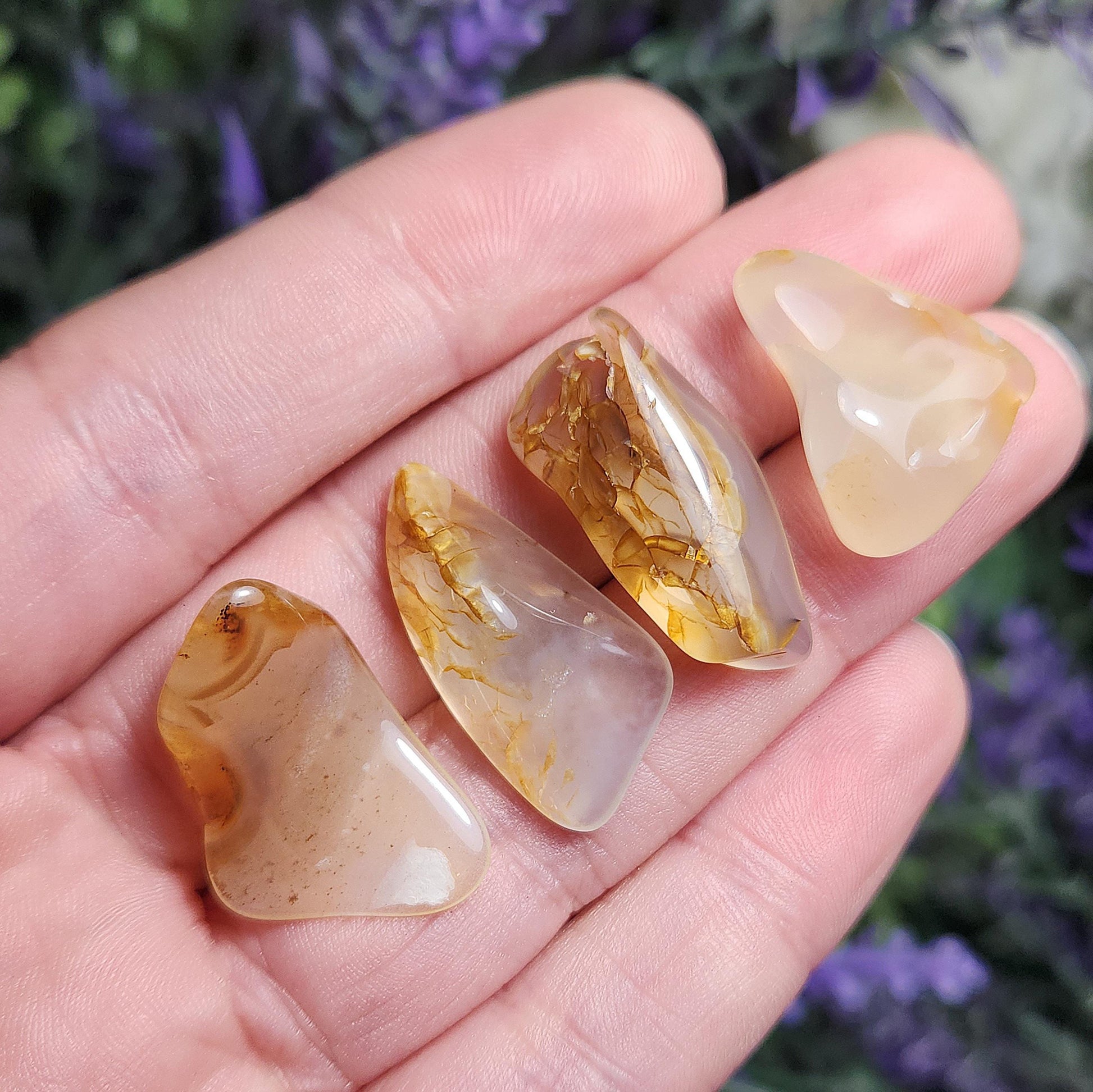 These tumbled Agate stones from Montana have a milky translucence and exhibit golden dendritic inclusions within their depths.