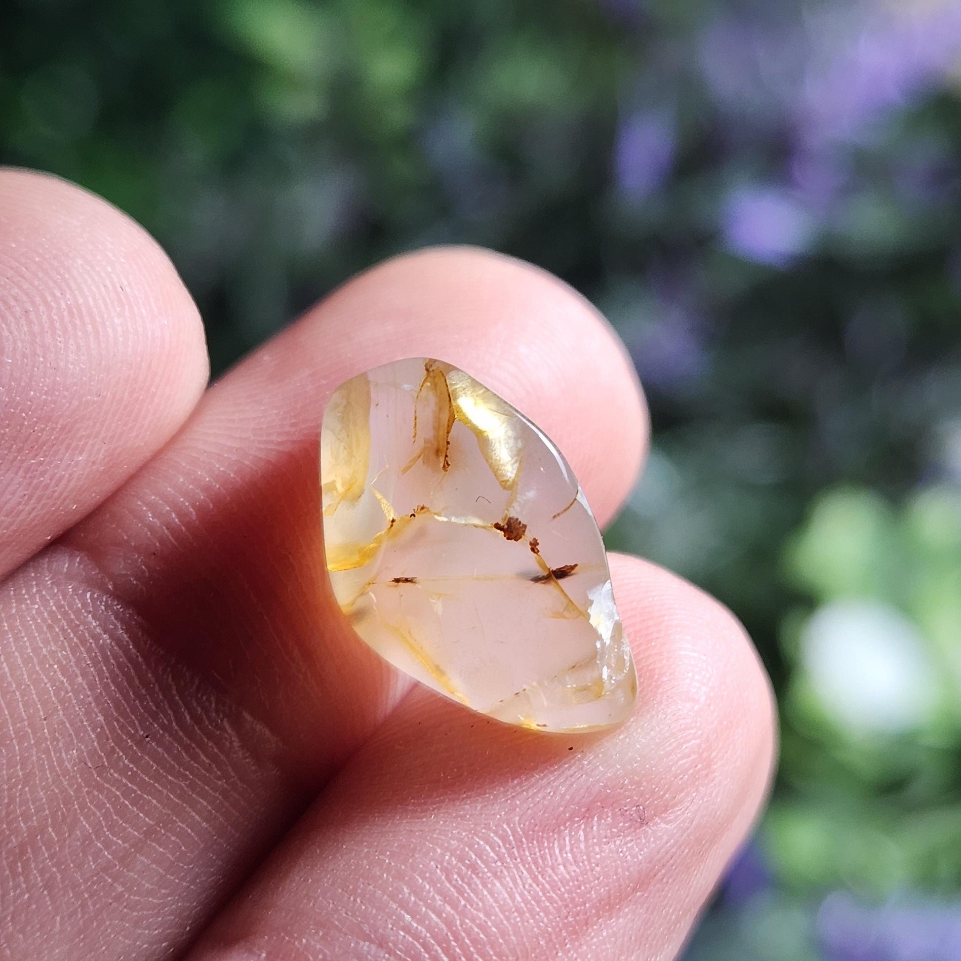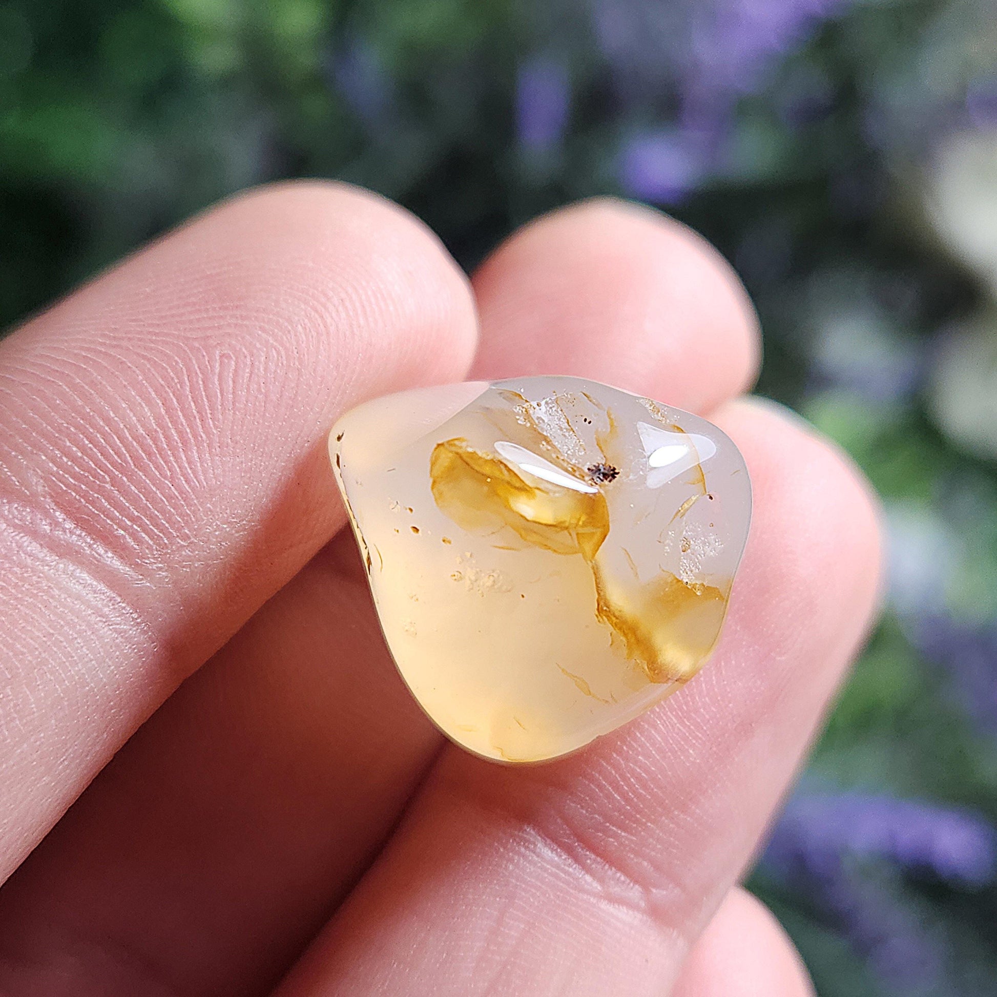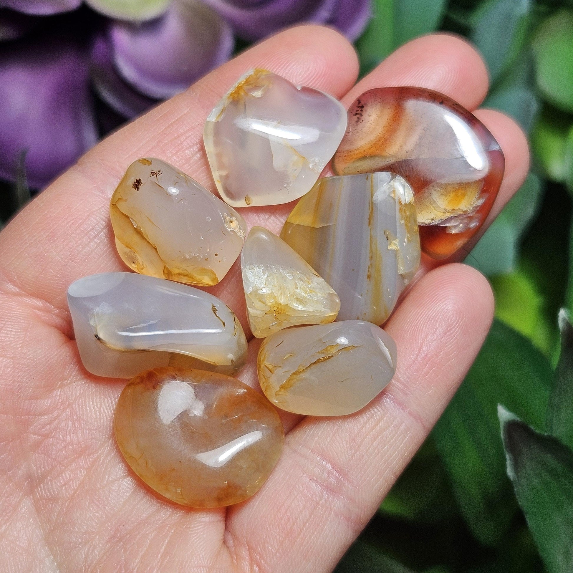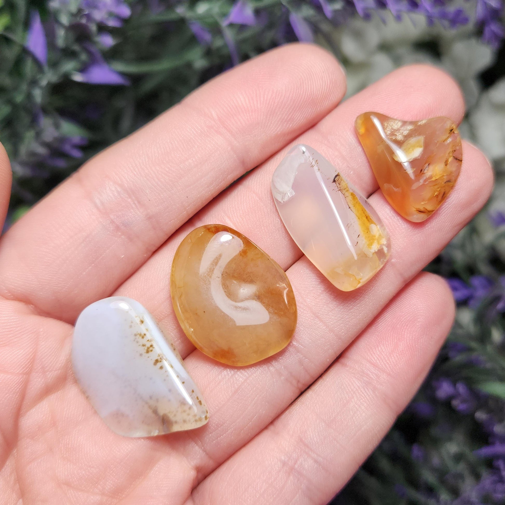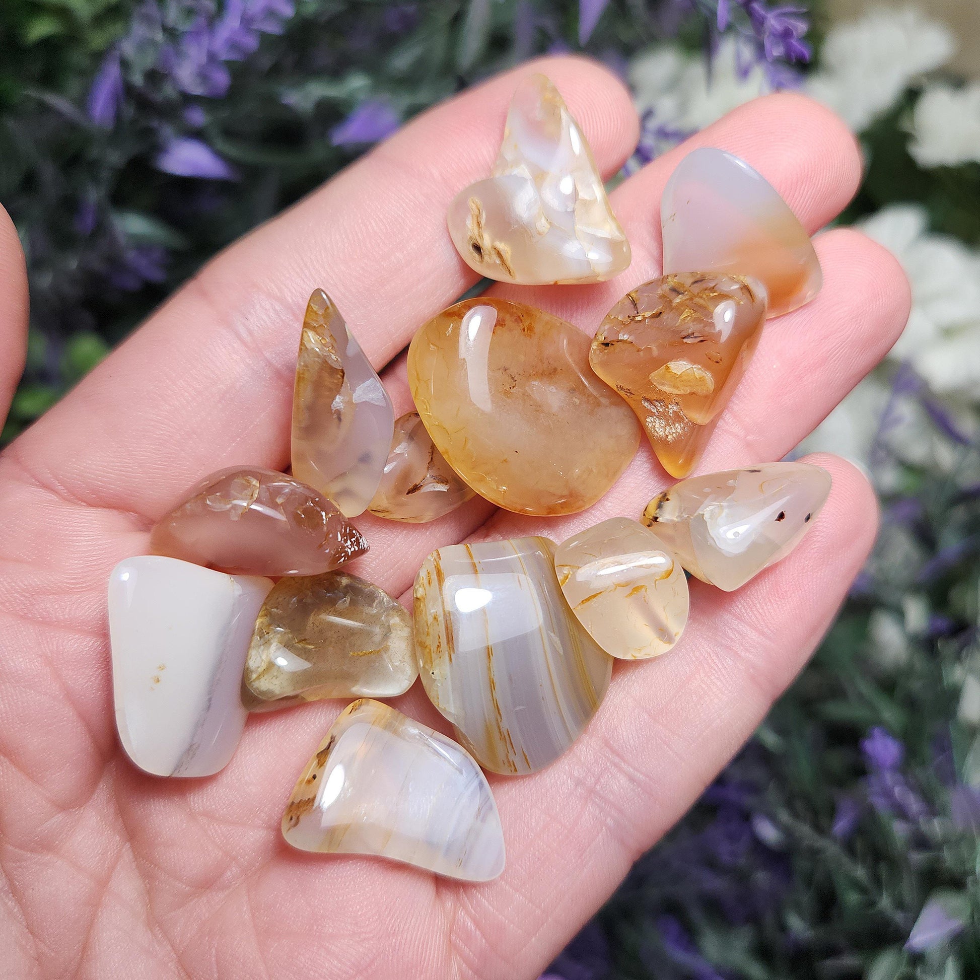 These tumbled Agate stones from Montana have a milky translucence and exhibit golden dendritic inclusions within their depths.