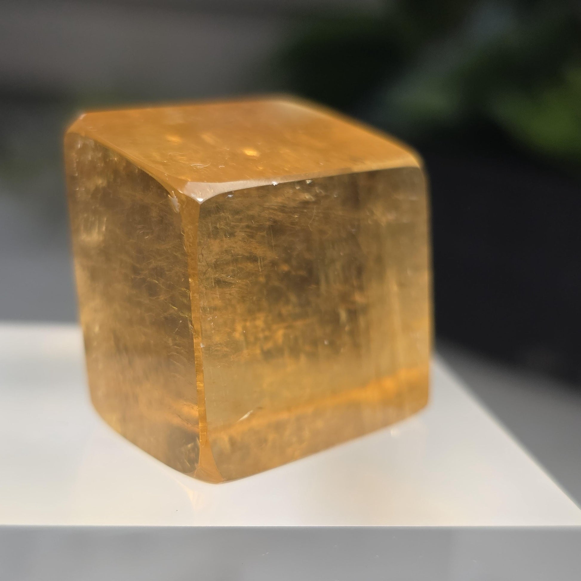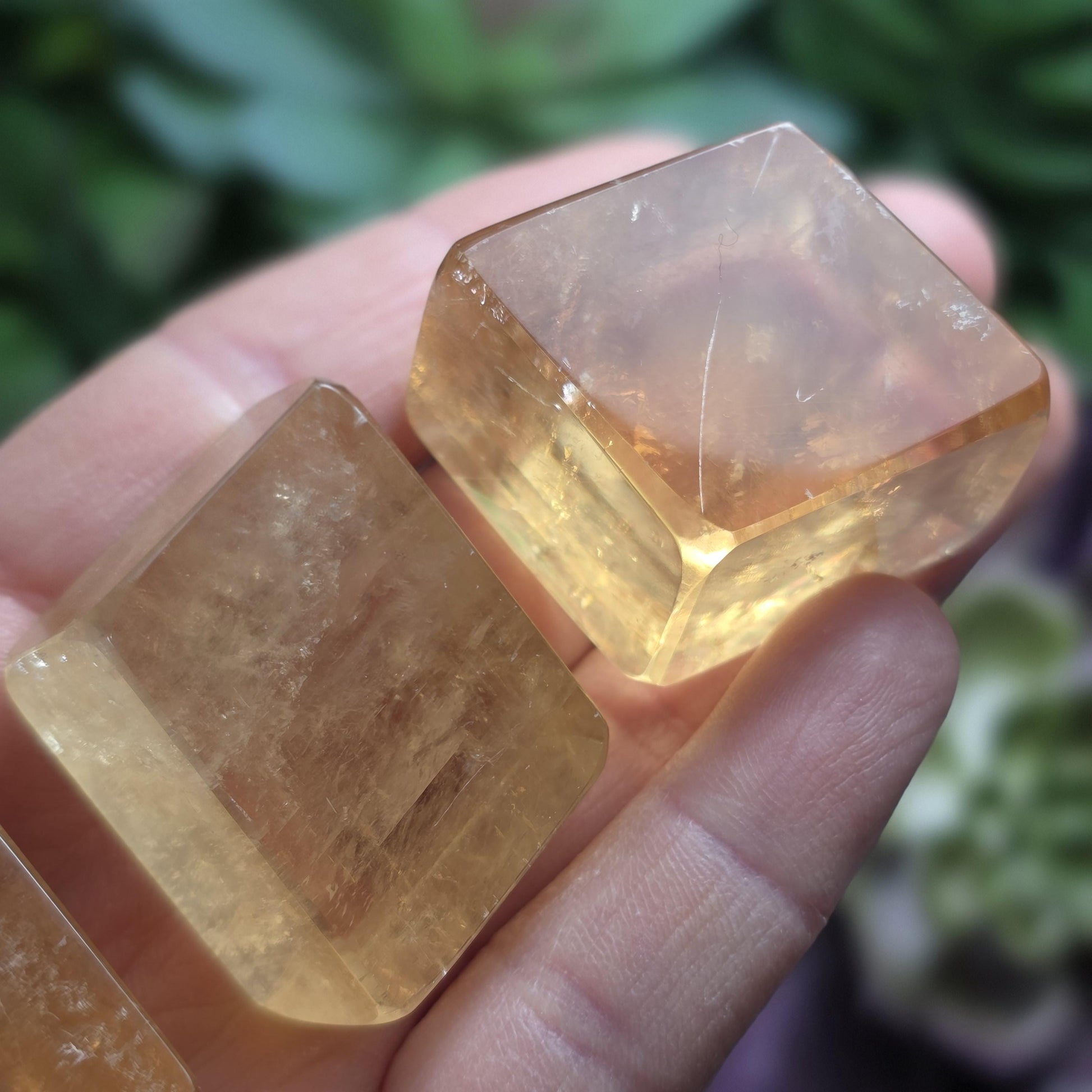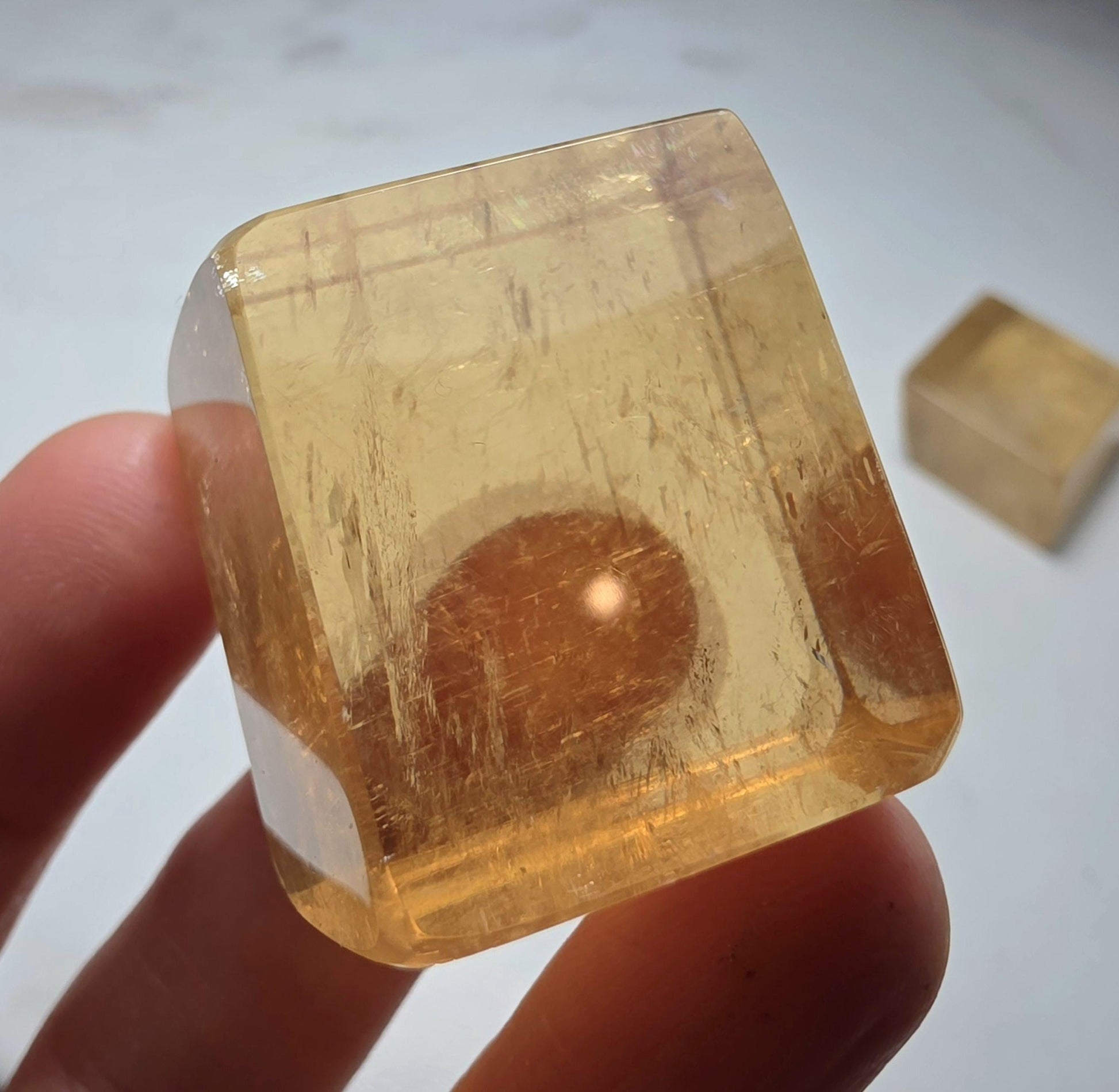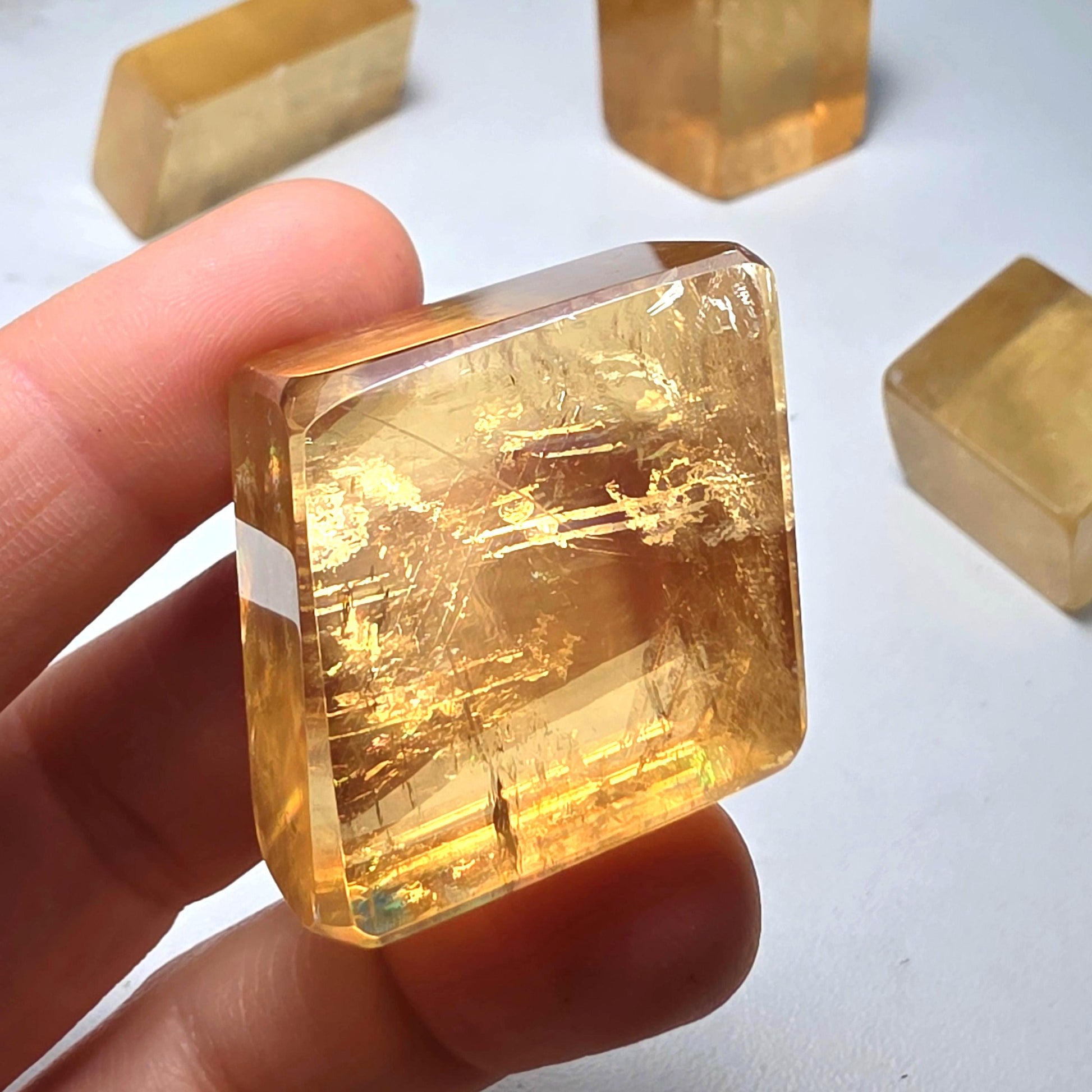 These gorgeous high grade golden Optical Calcite crystals are known for their natural, light-bending properties. When light passes through these translucent stones, double refraction occurs splitting one ray of light into two. These polished, rhomboidal crystals have a clear translucence with a possible light golden hue and exhibit classic optic effects.