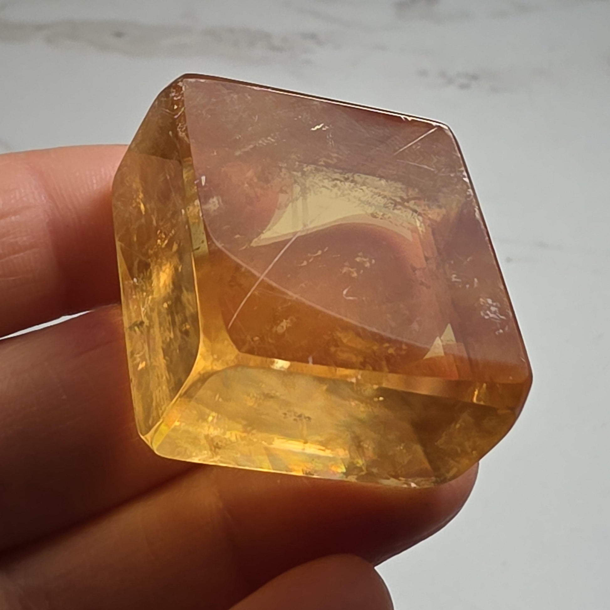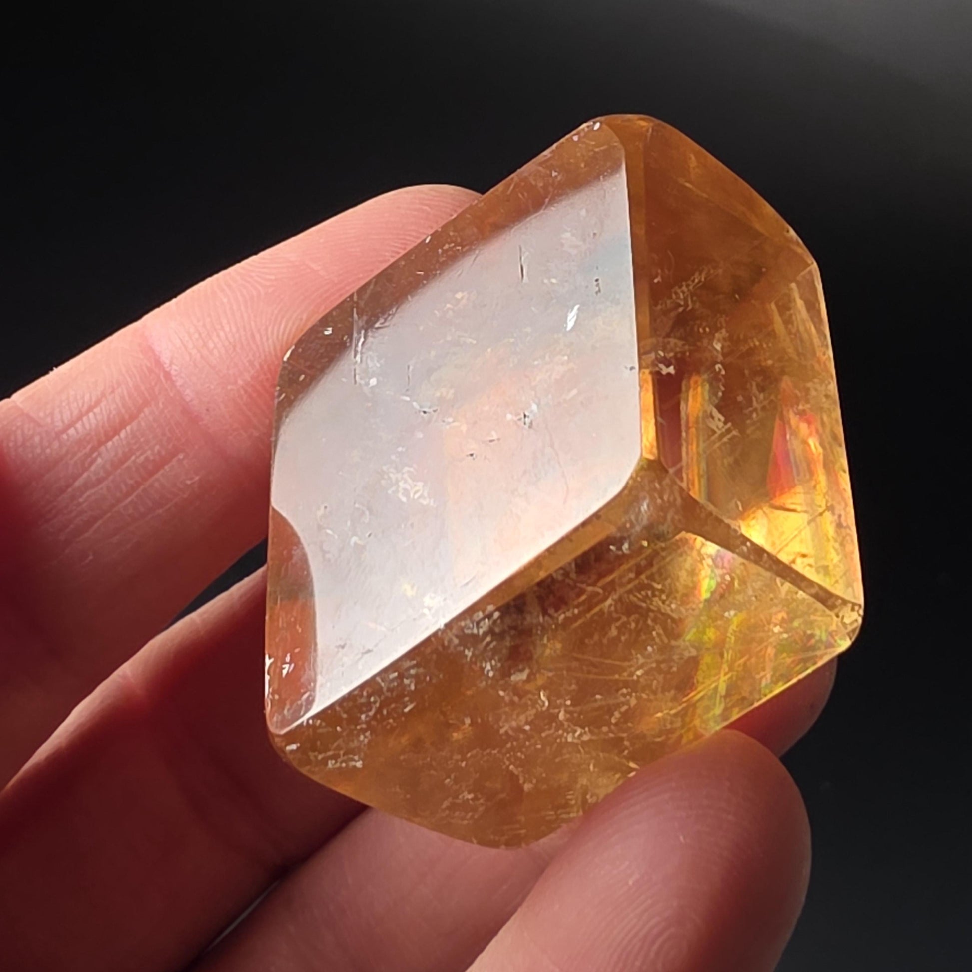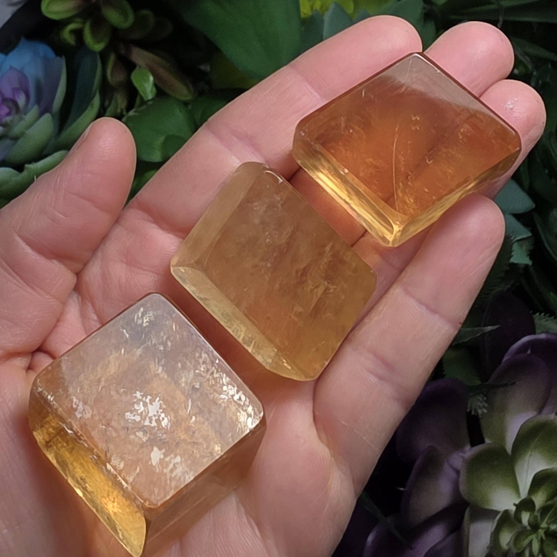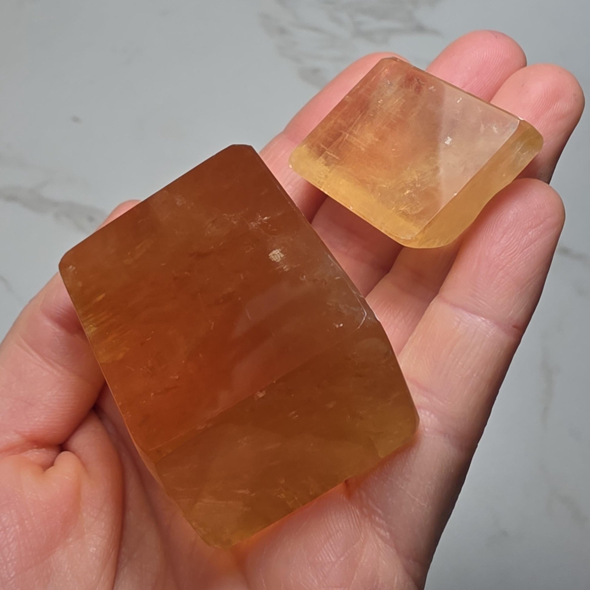 These gorgeous high grade golden Optical Calcite crystals are known for their natural, light-bending properties. When light passes through these translucent stones, double refraction occurs splitting one ray of light into two. These polished, rhomboidal crystals have a clear translucence with a possible light golden hue and exhibit classic optic effects.