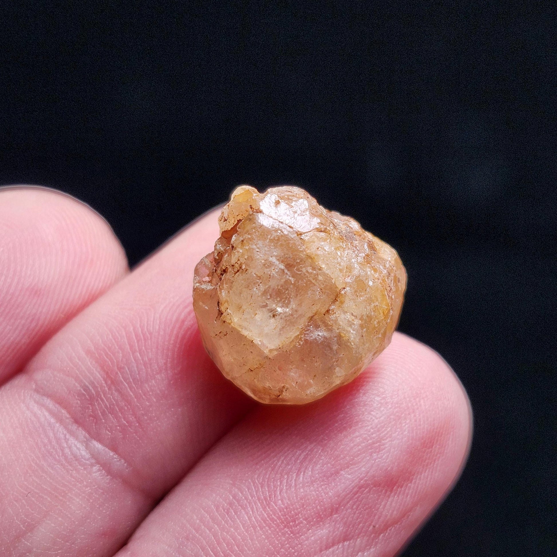 This raw Phenacite crystal from Nigeria exhibits a deep golden glow and has natural termination that shines. This specimen measures approximately 16mm by 13mm by 7mm and weighs 2.5 grams.