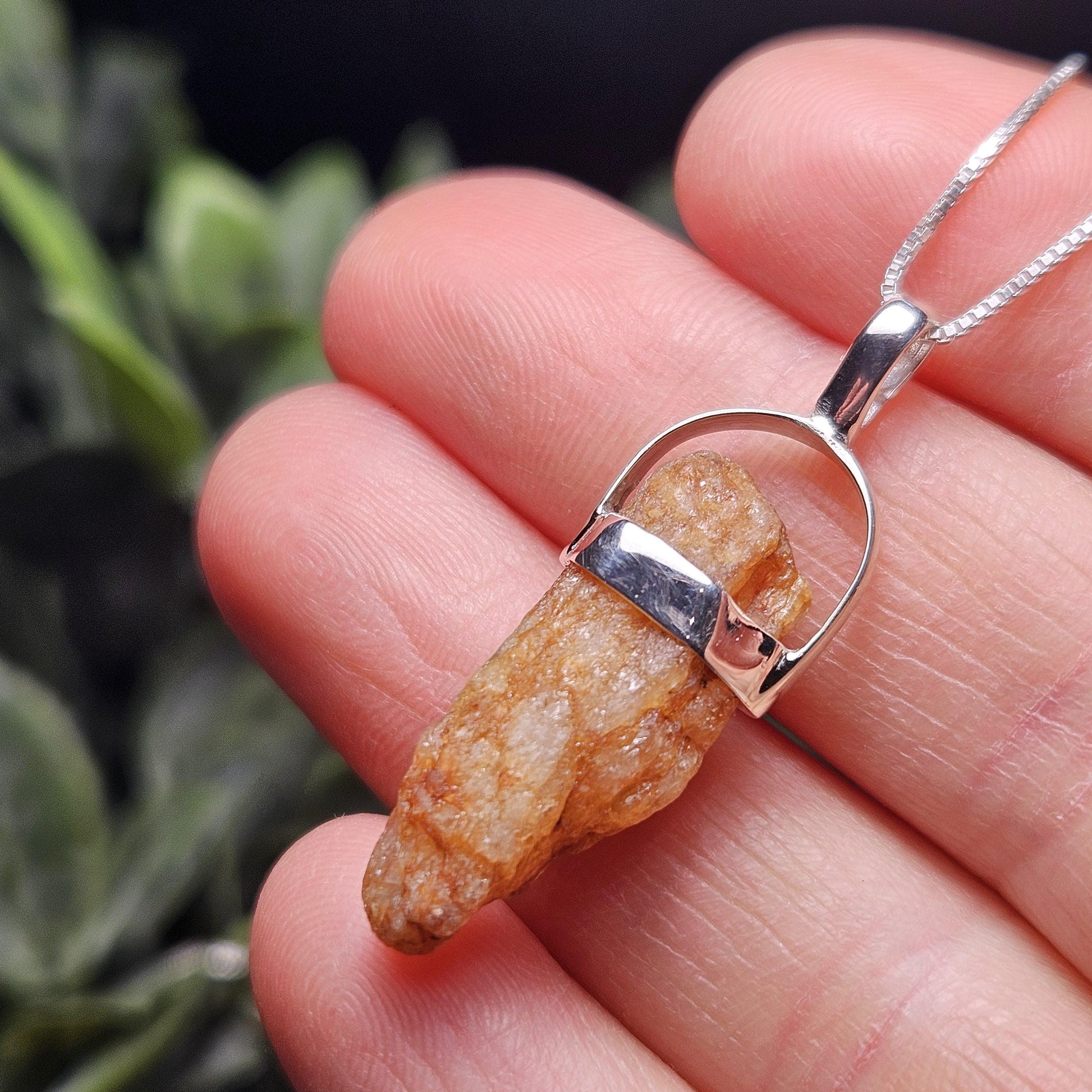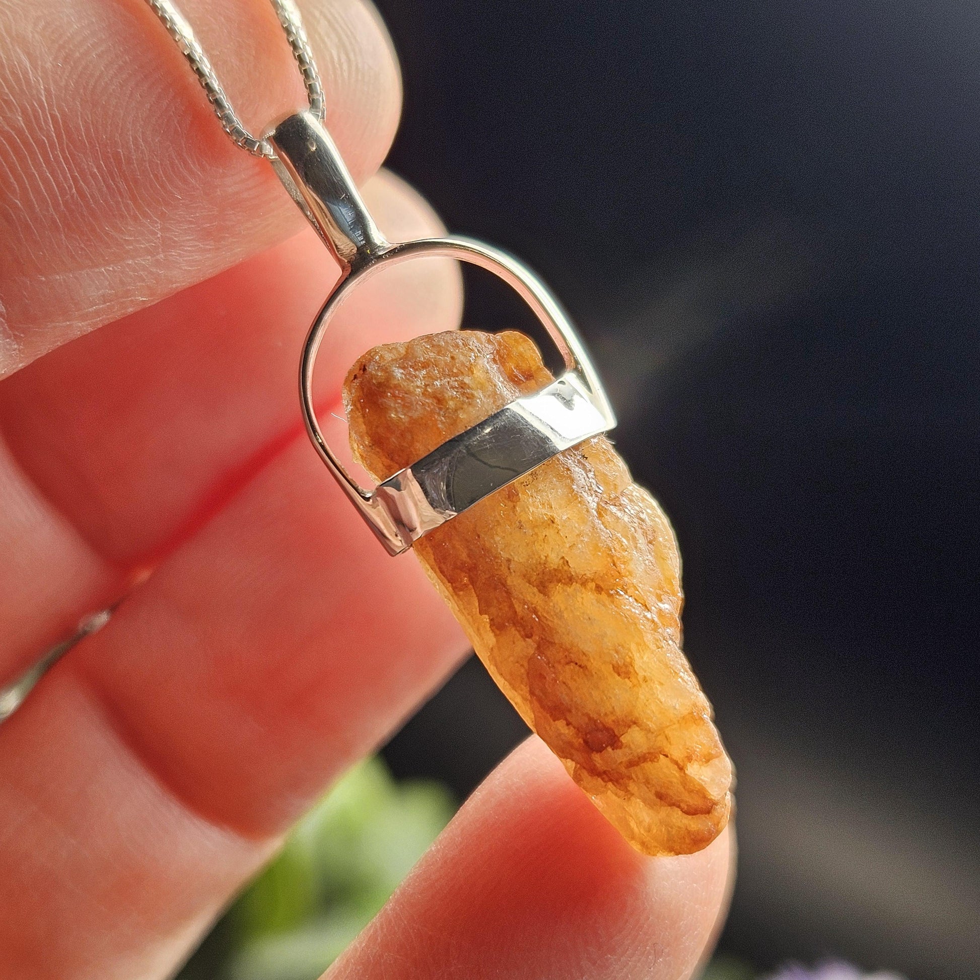 This raw Phenacite crystal from Nigeria has a vivid orange-red coloring to it. It has been custom created into a sturdy piece of jewelry using .925 Sterling Silver. This pendant measures approximately 35mm by 10mm. The silver chain used in the photos is to help envision how this pendant will look while adorned but is not included in the listing.
