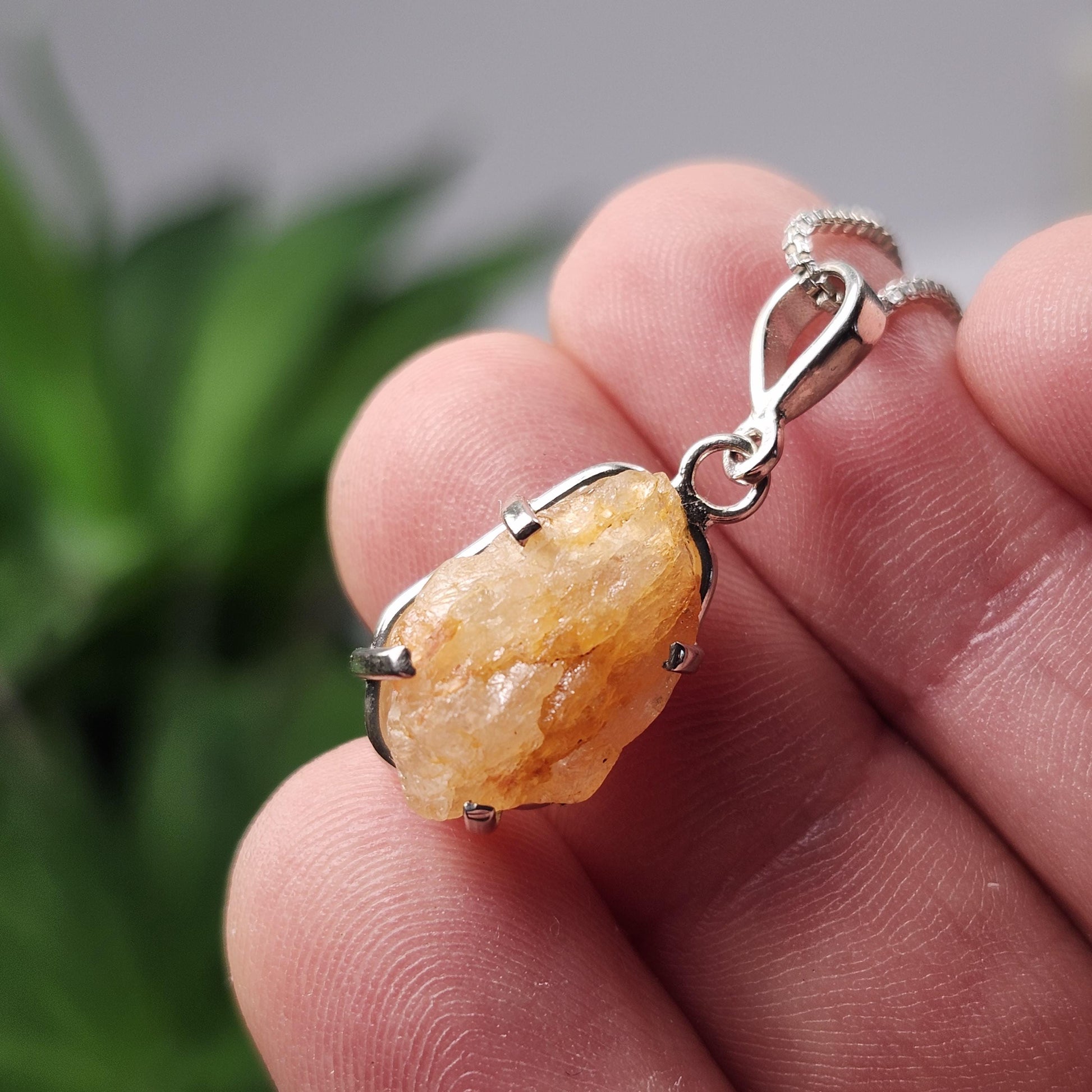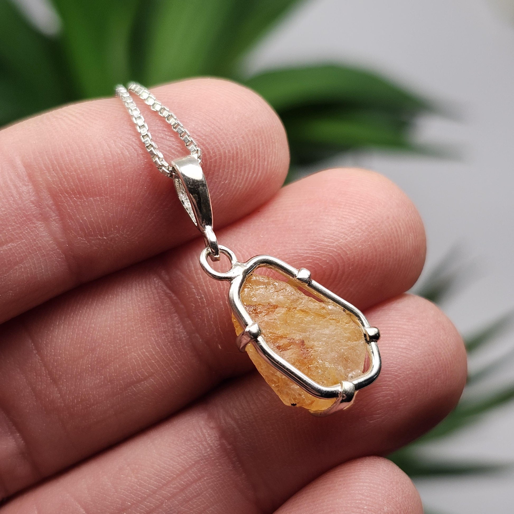 This raw Phenacite crystal from Nigeria has a deep golden coloring with a glowing translucence. This crystal has been custom created into a sturdy piece of jewelry using .925 Sterling Silver. This pendant measures approximately 27mm by 10mm. The silver chain used in the photos is to help envision how this pendant will look while adorned but is not included in the listing.