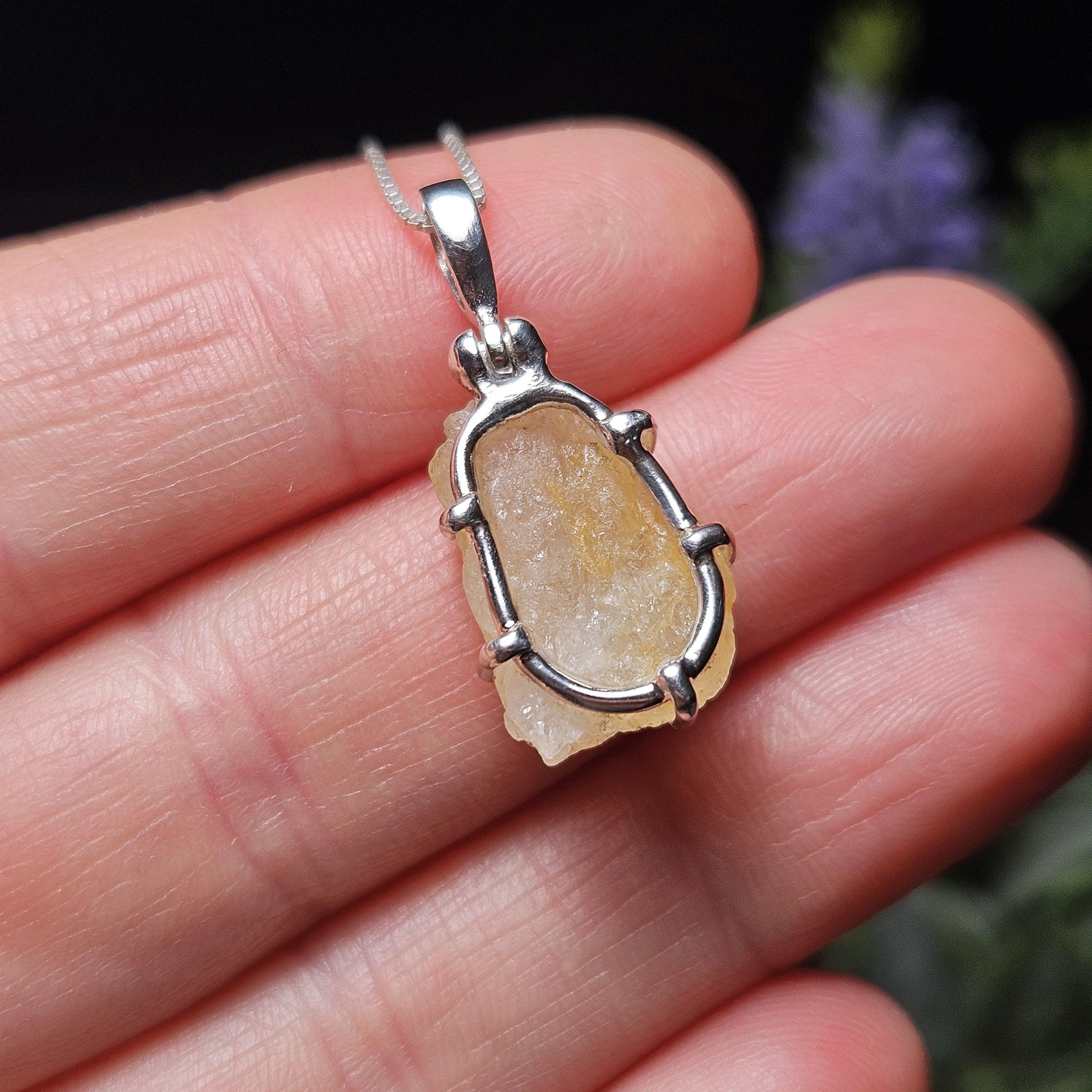 This raw Phenacite crystal from Nigeria has a deep golden coloring with a glowing translucence. This crystal has been custom created into a sturdy piece of jewelry using .925 Sterling Silver. This pendant measures approximately 22mm by 11mm. The silver chain used in the photos is to help envision how this pendant will look while adorned but is not included in the listing.
