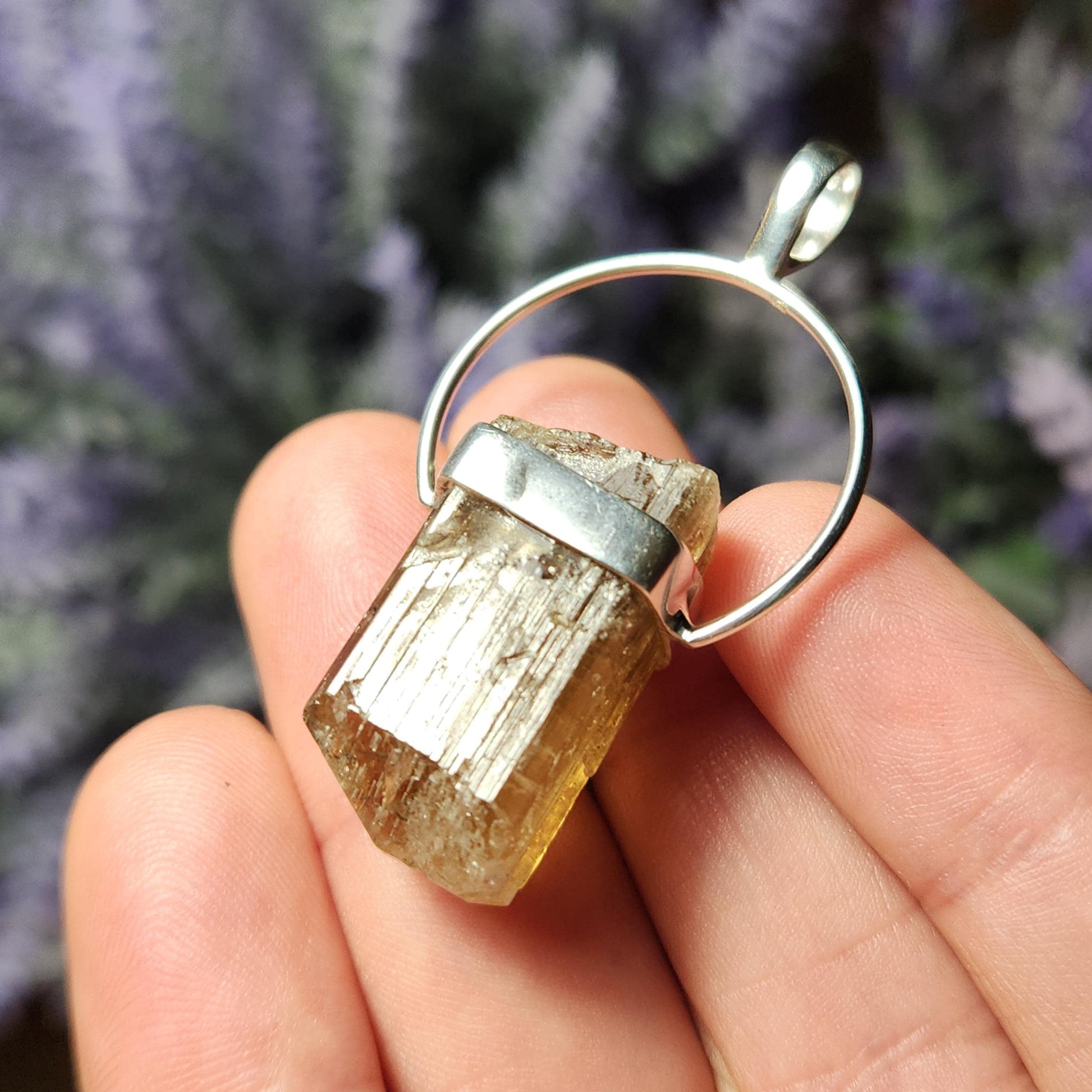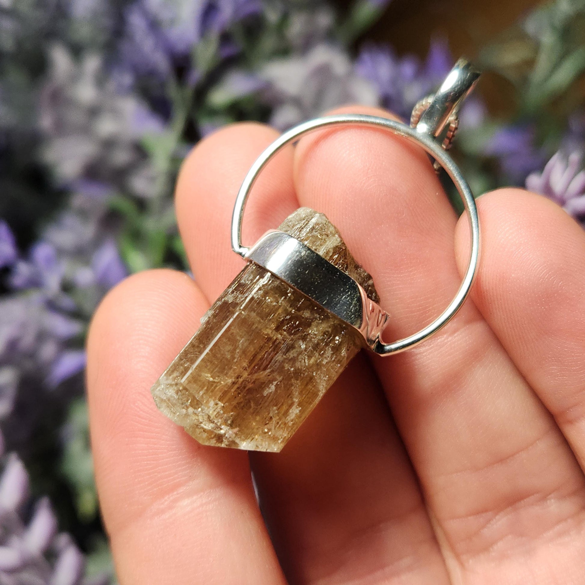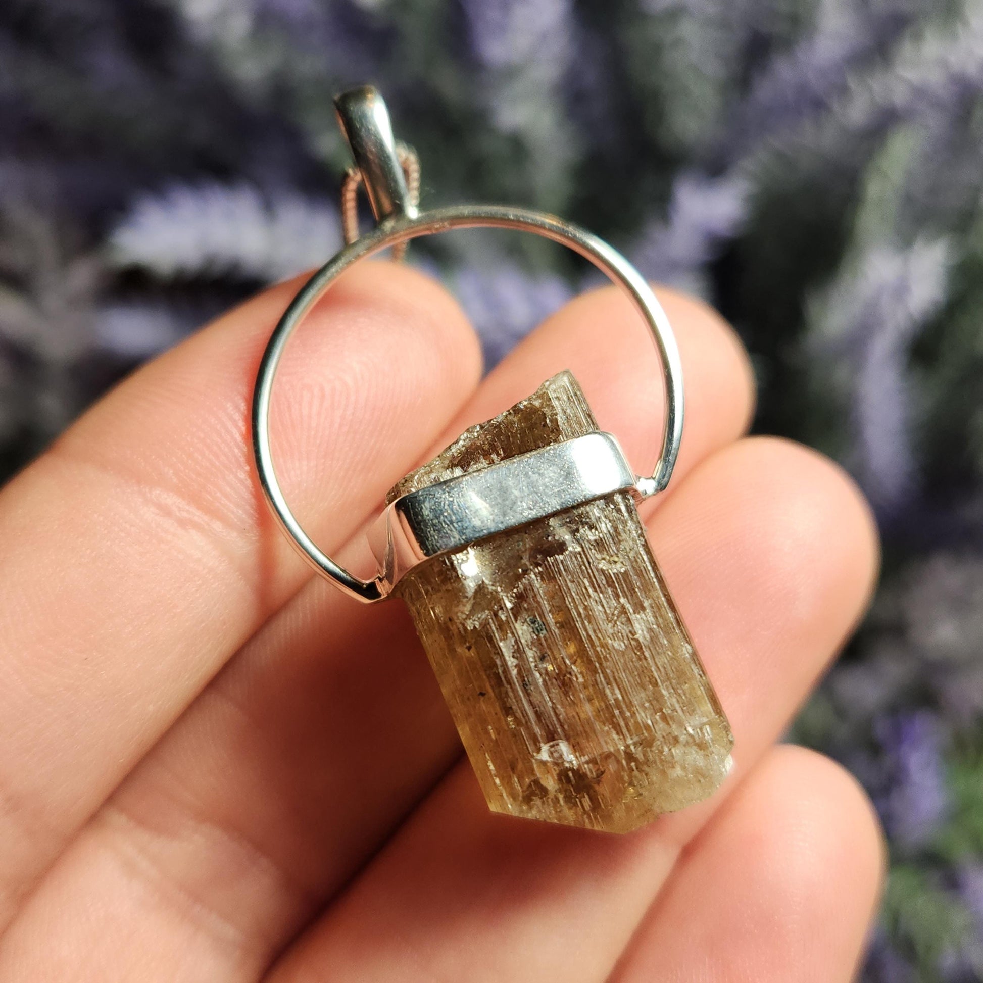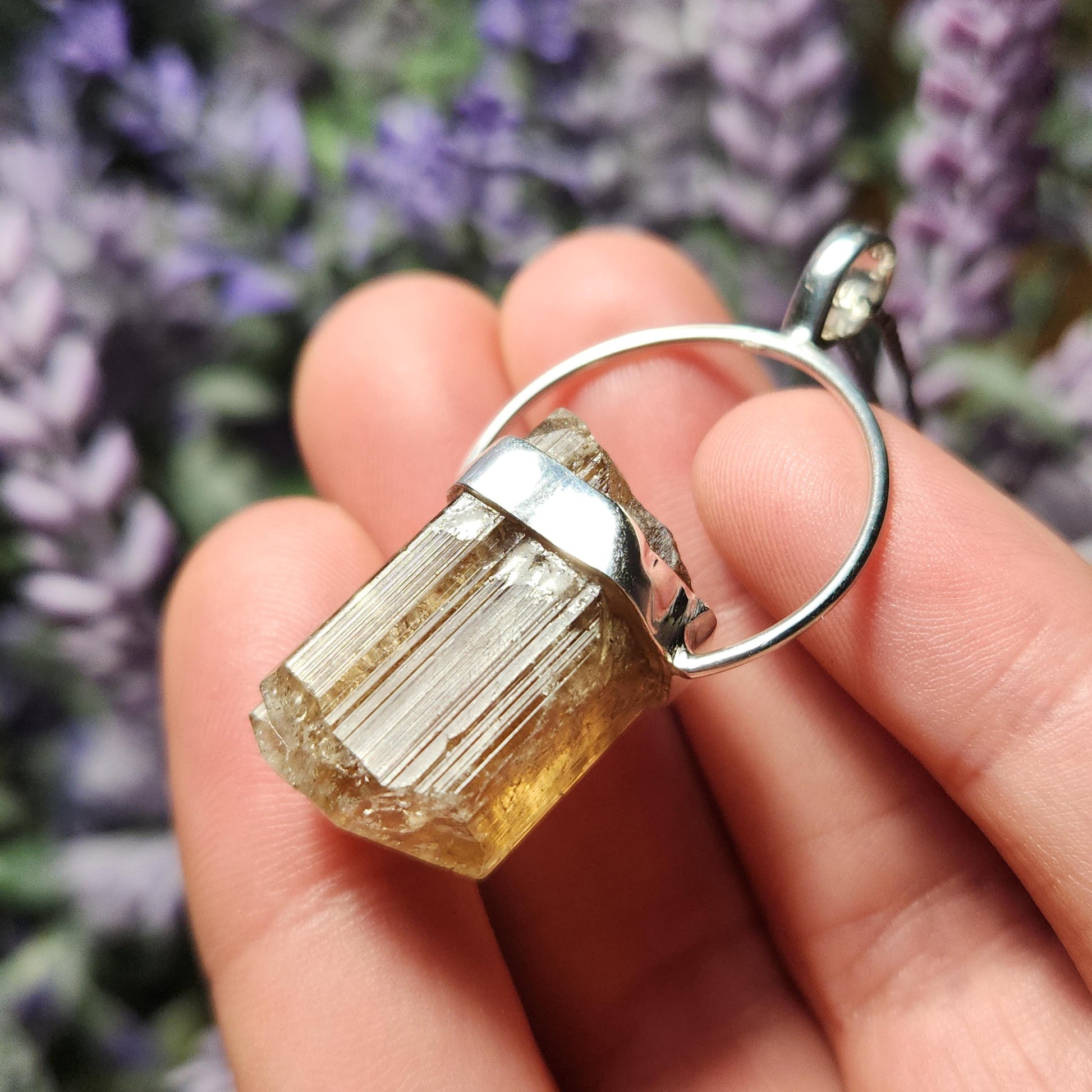 This high-quality Scapolite crystal from Morocco has striations on its raw, shining surface and exhibits a naturally terminated point. It illuminates with a brilliant golden glow when backlit. This crystal has been handpicked and processed into an intentional piece of jewelry using .925 Sterling Silver. This pendant measures approximately 45mm by 22mm. The silver chain used in the photos is to help envision how this pendant will look while adorned but is not included in the listing.