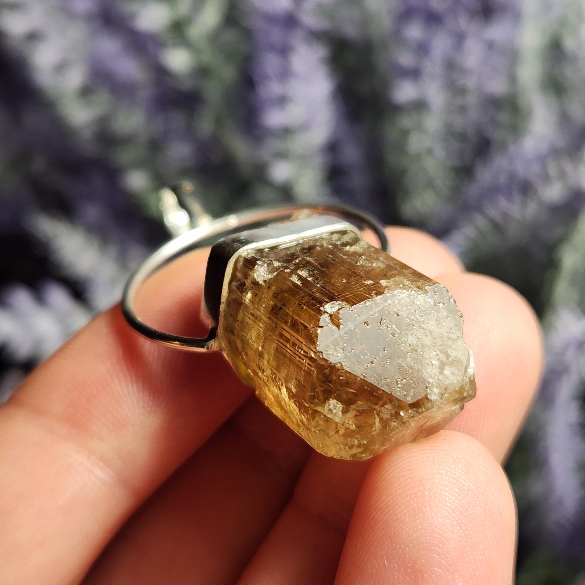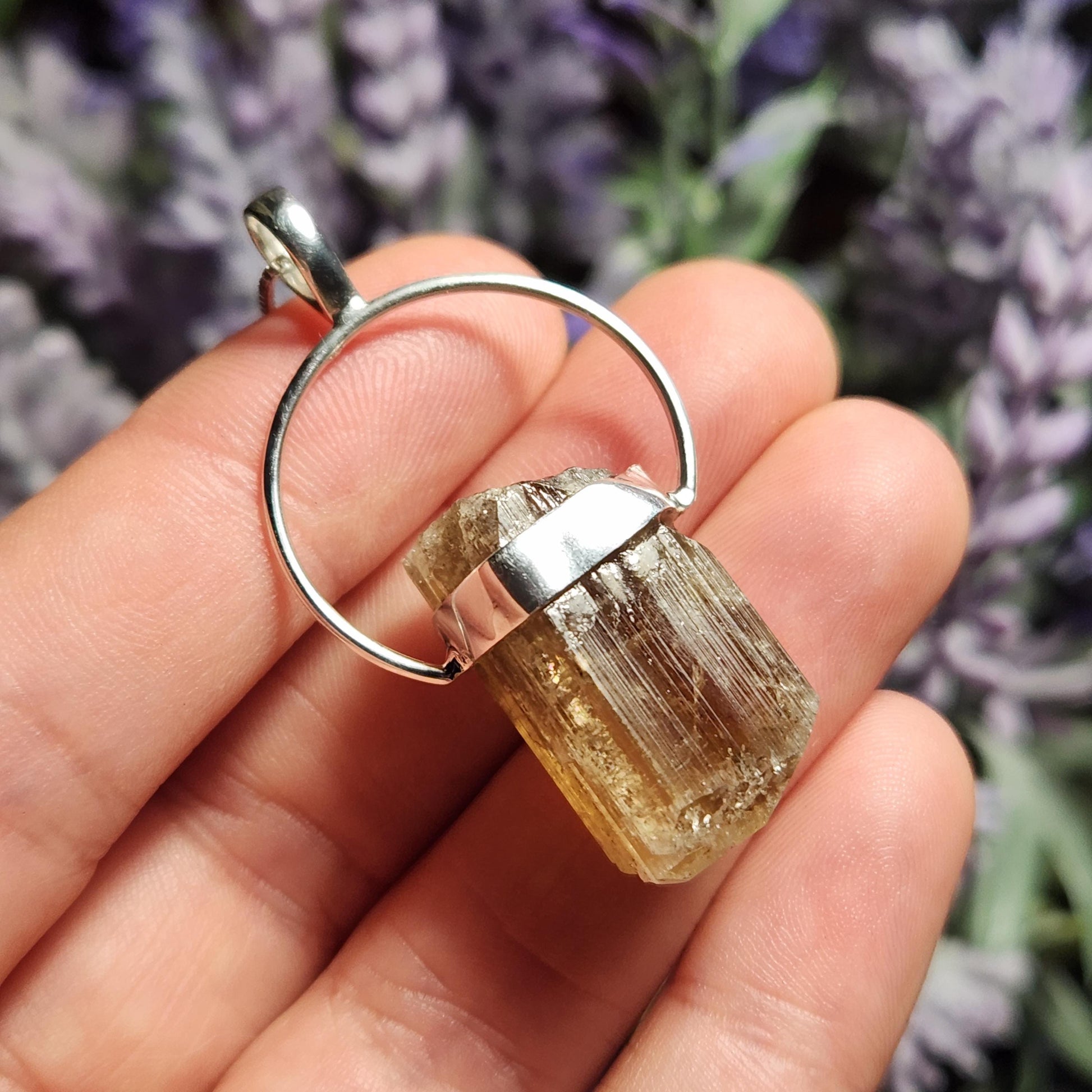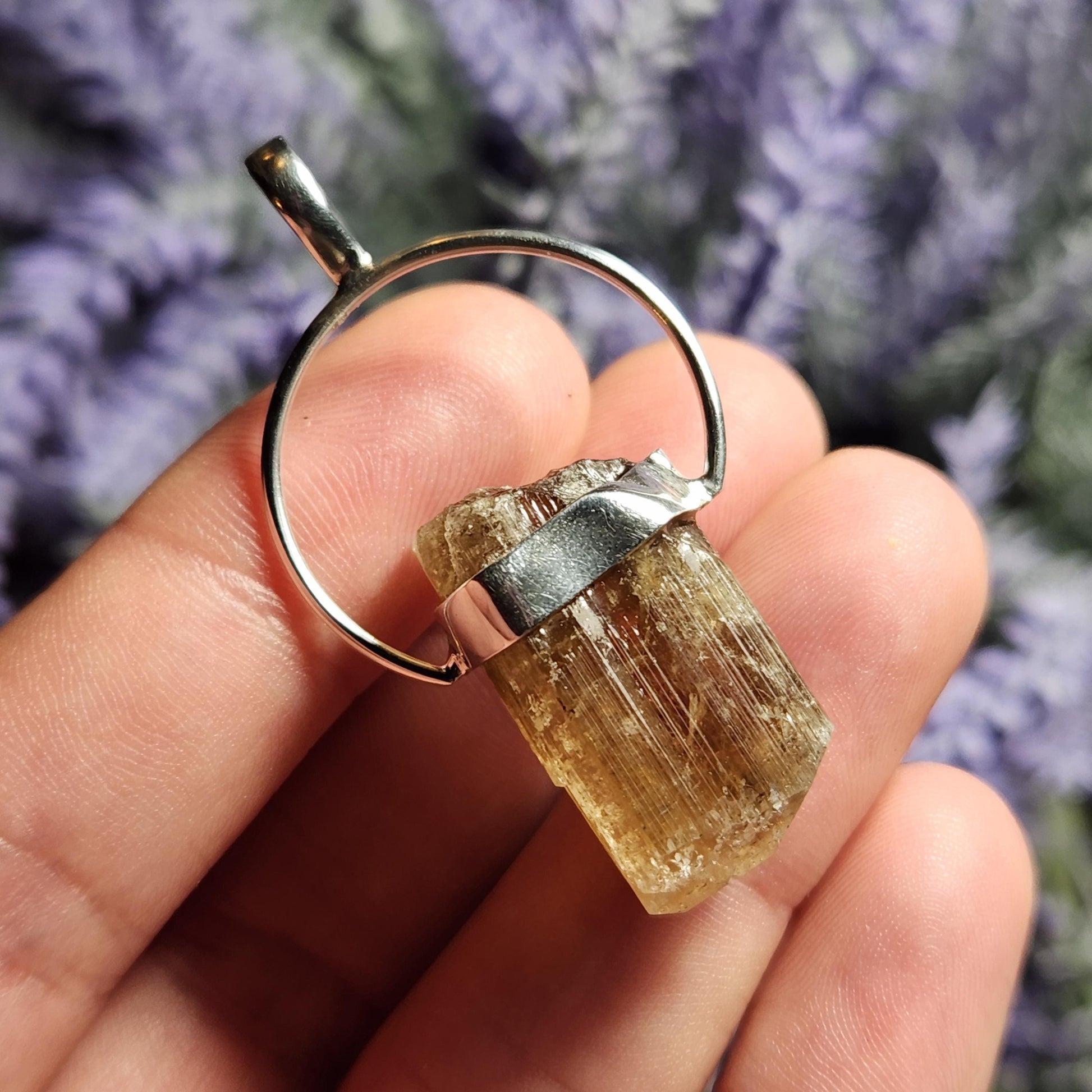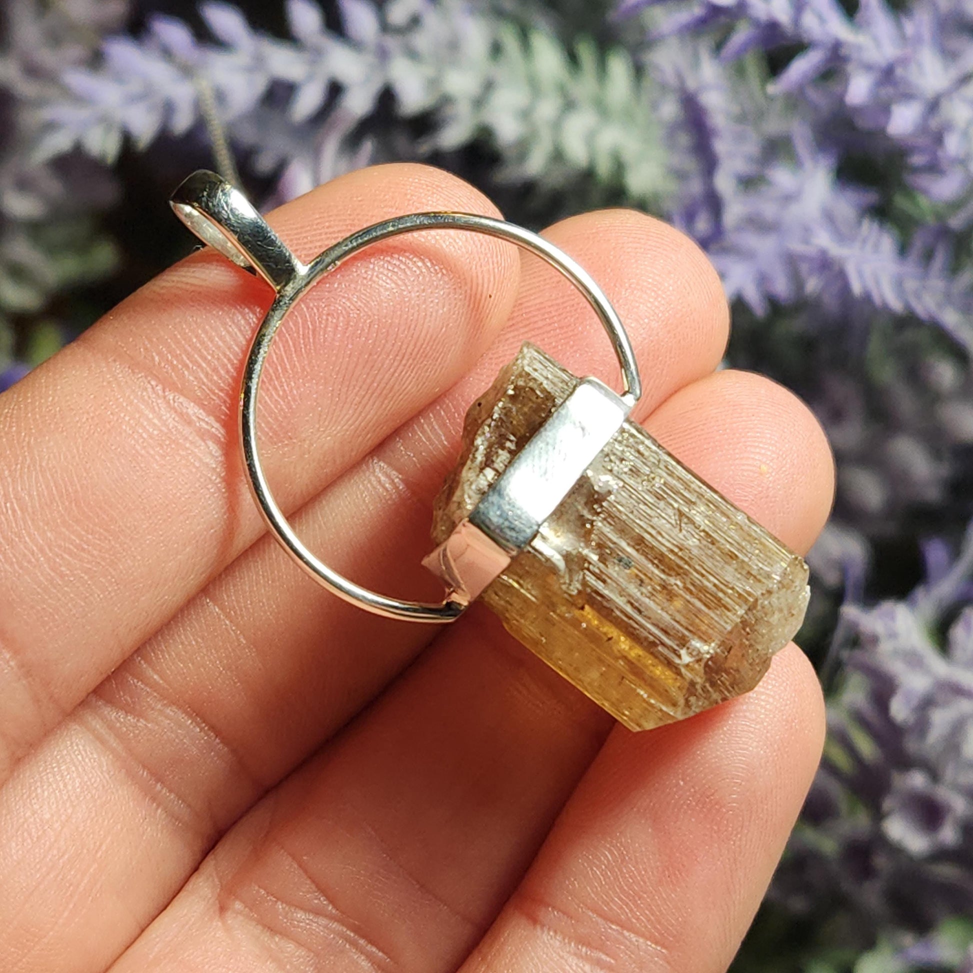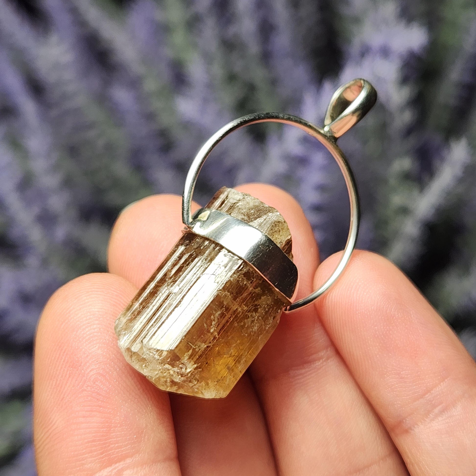 This high-quality Scapolite crystal from Morocco has striations on its raw, shining surface and exhibits a naturally terminated point. It illuminates with a brilliant golden glow when backlit. This crystal has been handpicked and processed into an intentional piece of jewelry using .925 Sterling Silver. This pendant measures approximately 45mm by 22mm. The silver chain used in the photos is to help envision how this pendant will look while adorned but is not included in the listing.