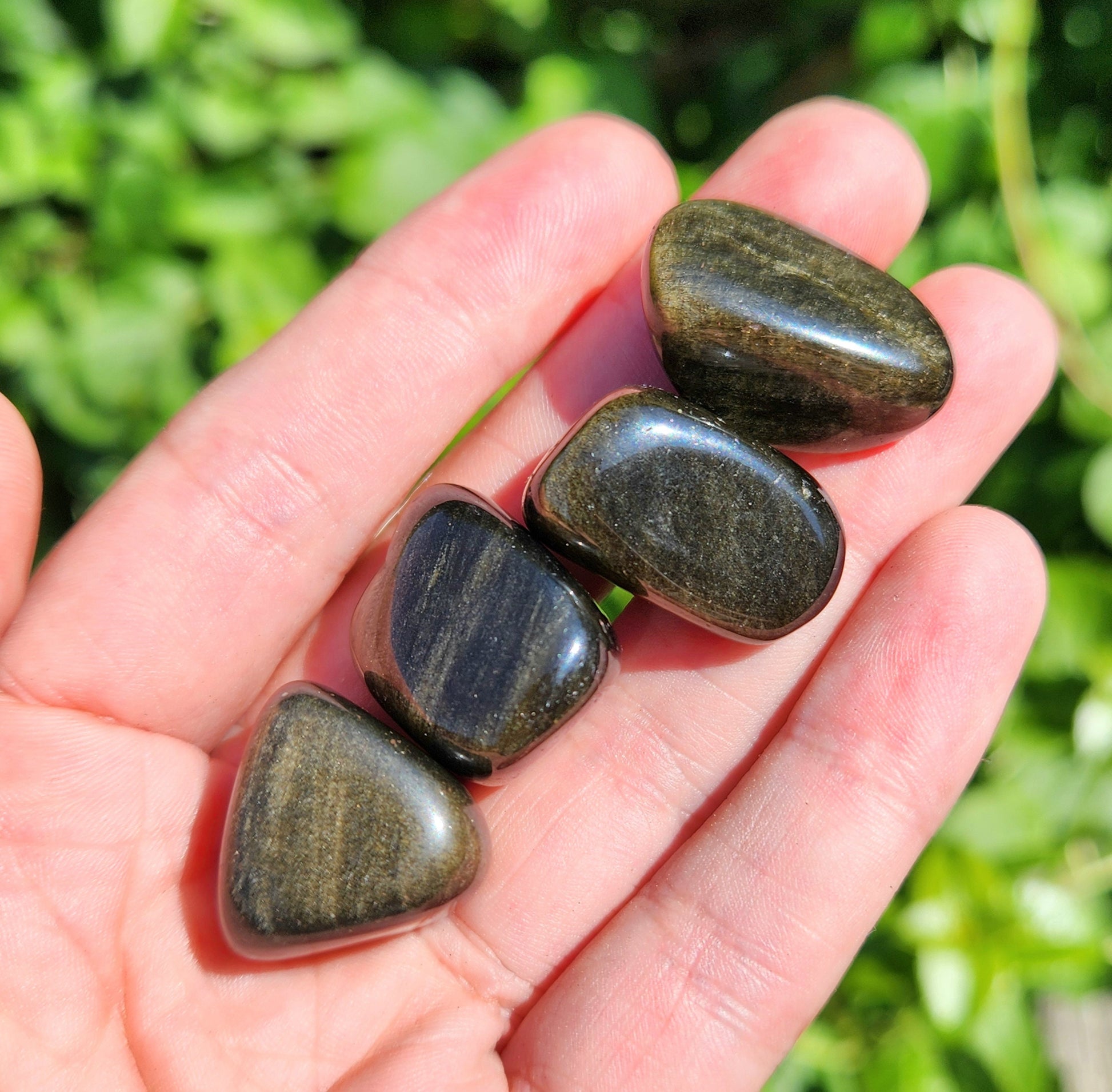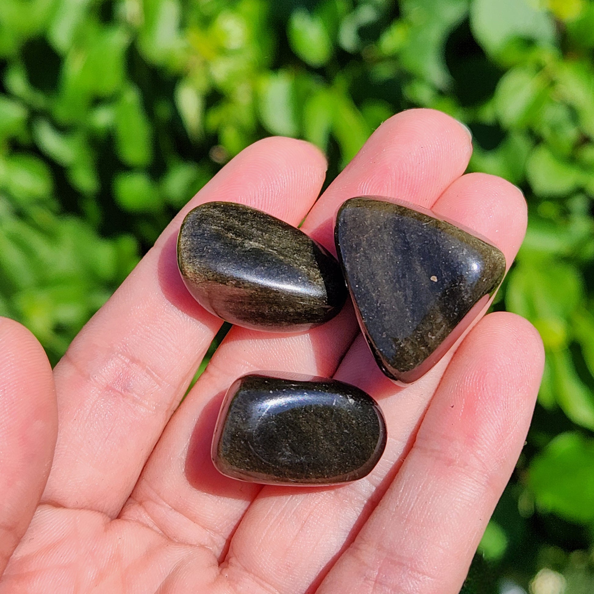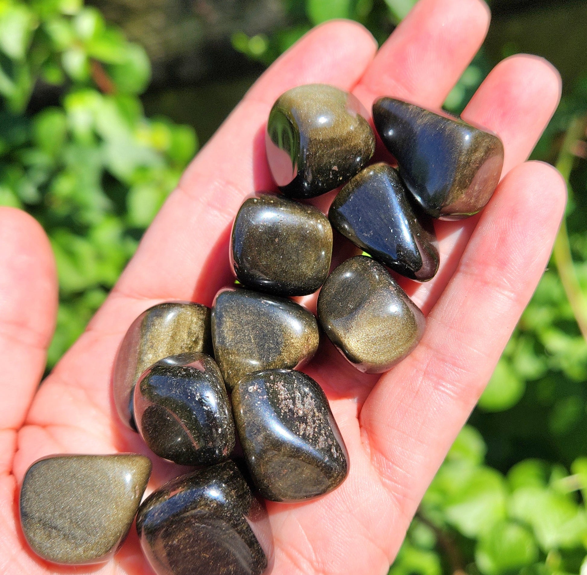 These polished Obsidian crystals from Mexico are black with a shimmering gold sheen. Each unique specimen measures between .5 and .75 inches, weighing between 6 and 10 grams.