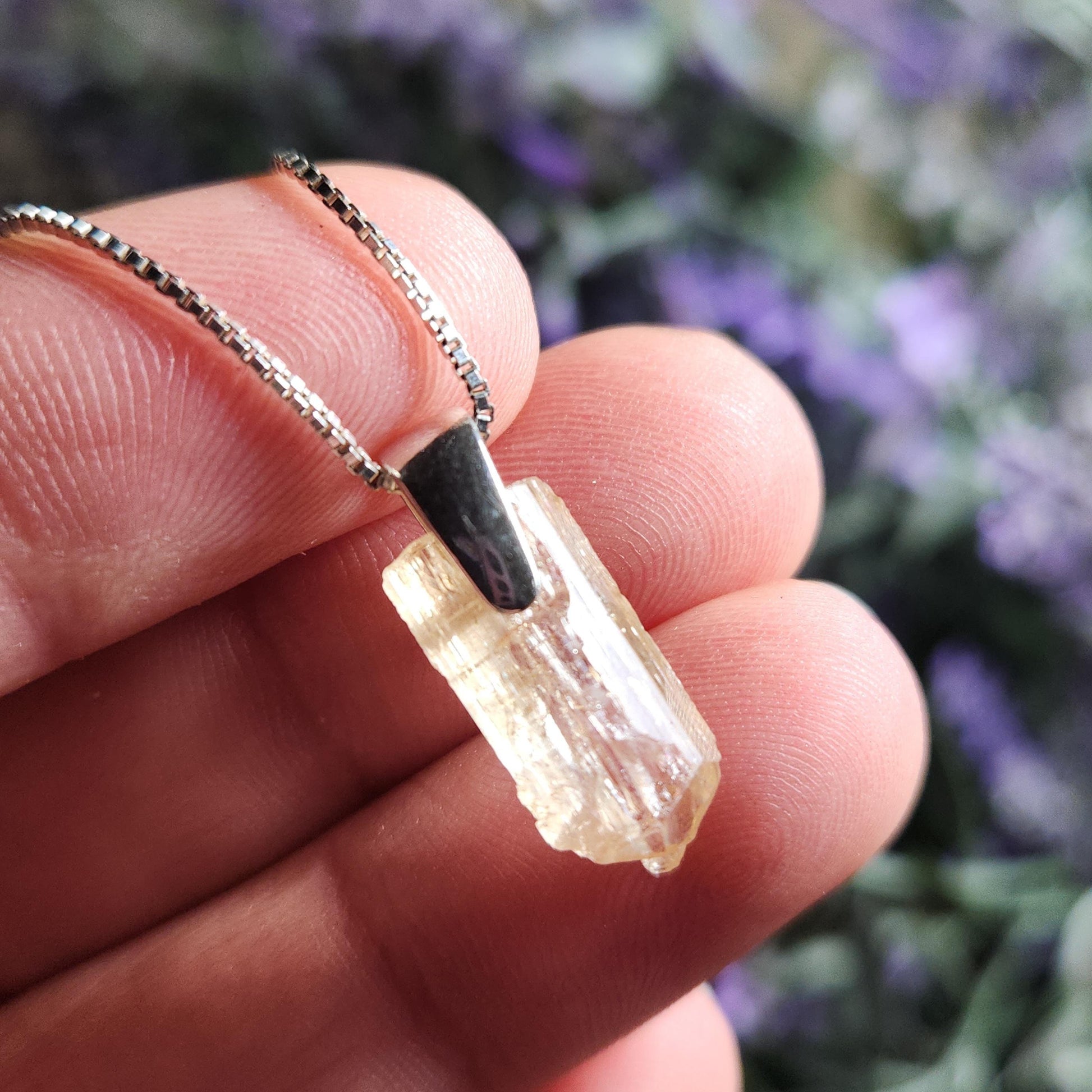 This Topaz crystal has visible striations, a terminated tip, and glows with a light golden translucence. This crystal has been custom created into a sturdy piece of jewelry using .925 Sterling Silver. This pendant measures approximately 13m by 8mm. The silver chain used in the photos is to help envision how this pendant will look while adorned but is not included in the listing.
