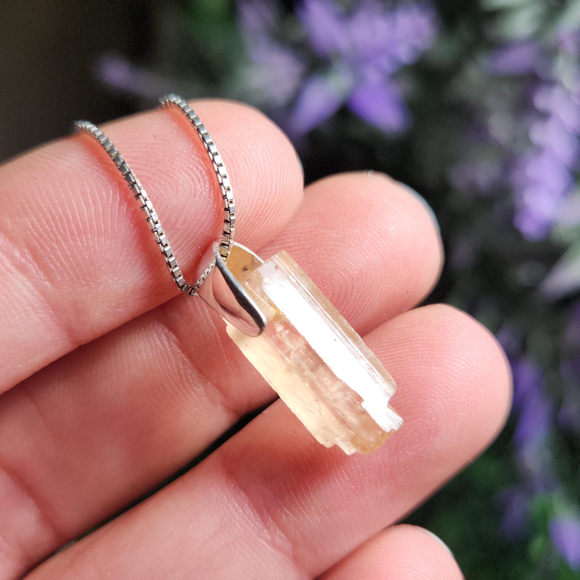 This Topaz crystal has visible striations and glows with a golden translucence. This crystal has been custom created into a sturdy piece of jewelry using .925 Sterling Silver. This pendant measures approximately 20mm by 6mm. The silver chain used in the photos is to help envision how this pendant will look while adorned but is not included in the listing.