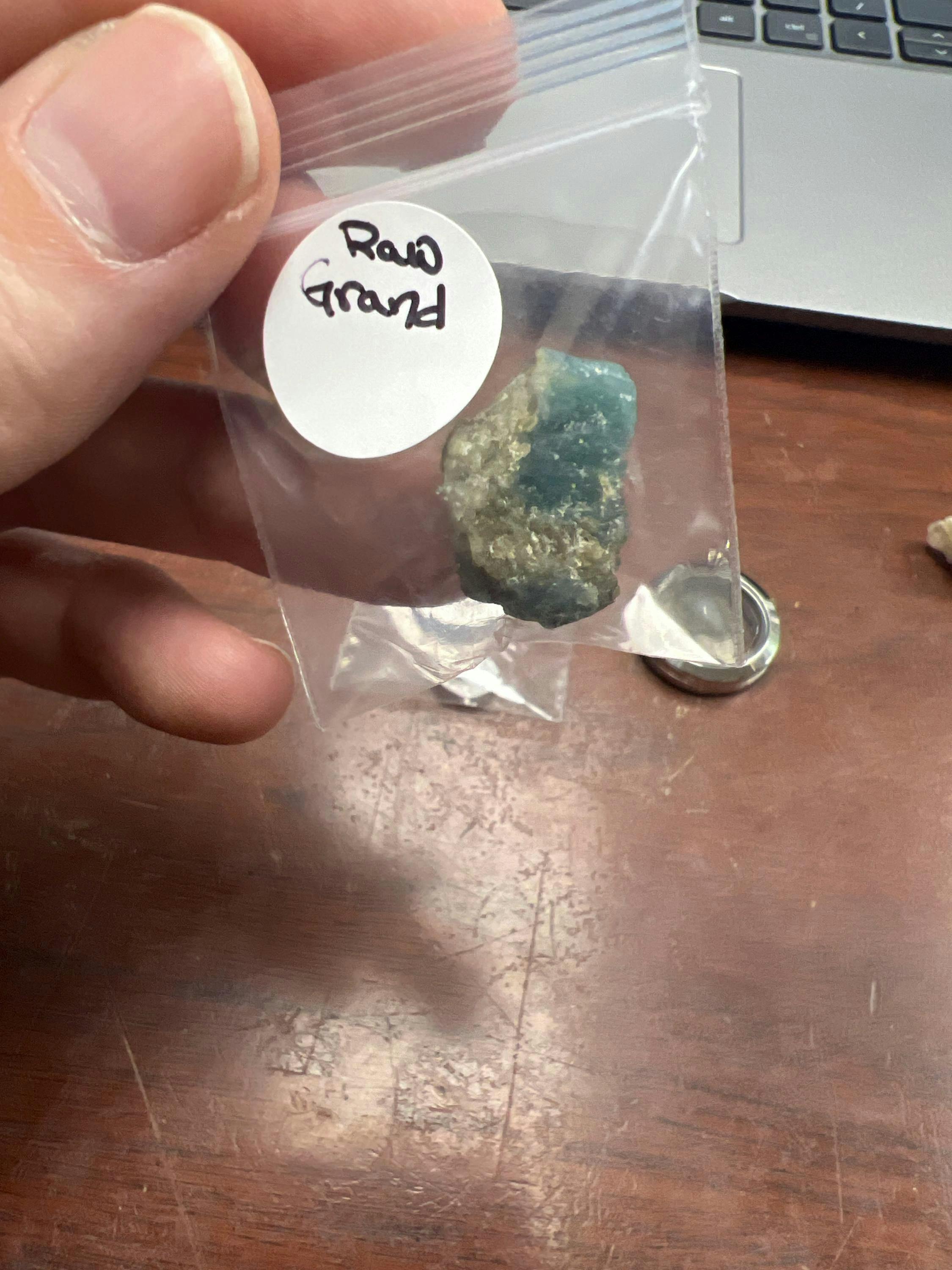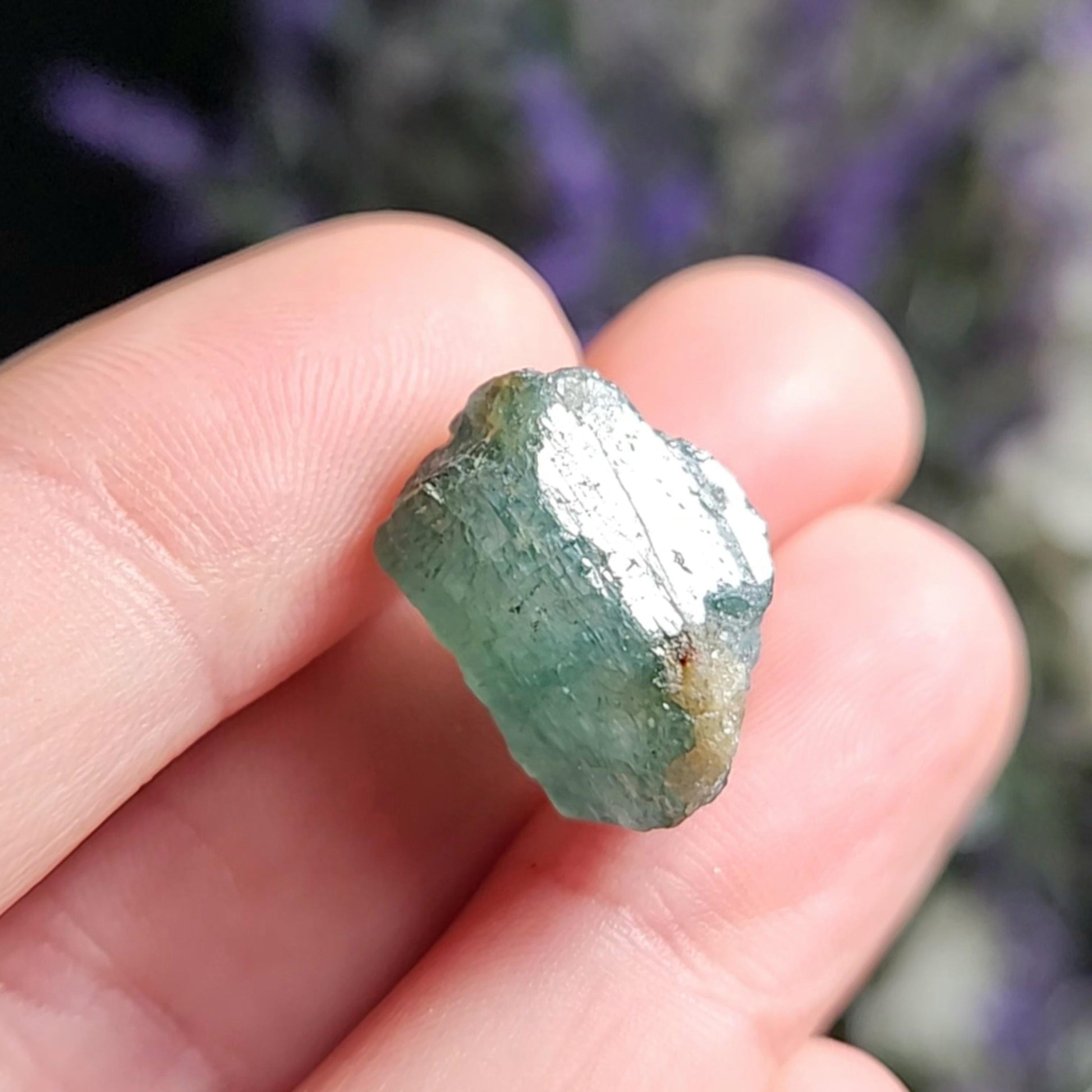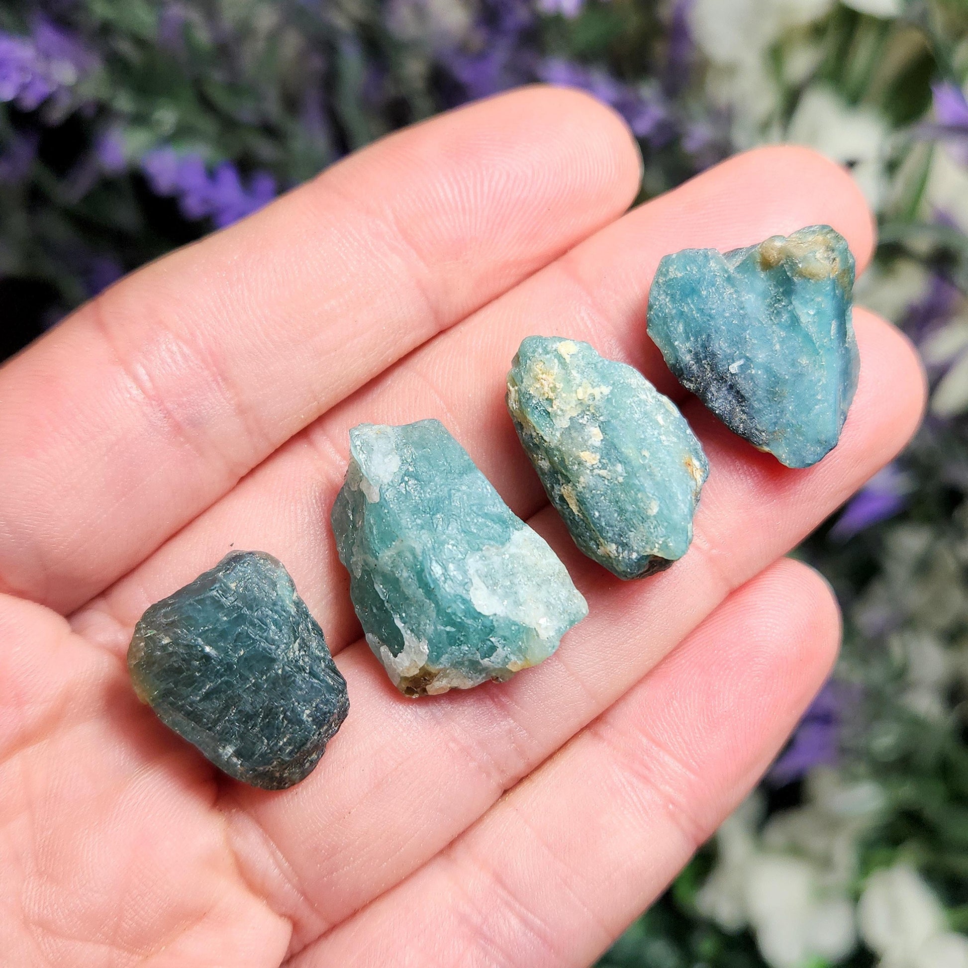 These raw Grandidierite crystals display a range of teal blue shades in bright and muted tones. They reveal a very slight, gemmy translucence when backlit, have a luster on their rough surfaces, and may contain possible mineral inclusions. Each specimen weighs between 3 grams and 6 grams.