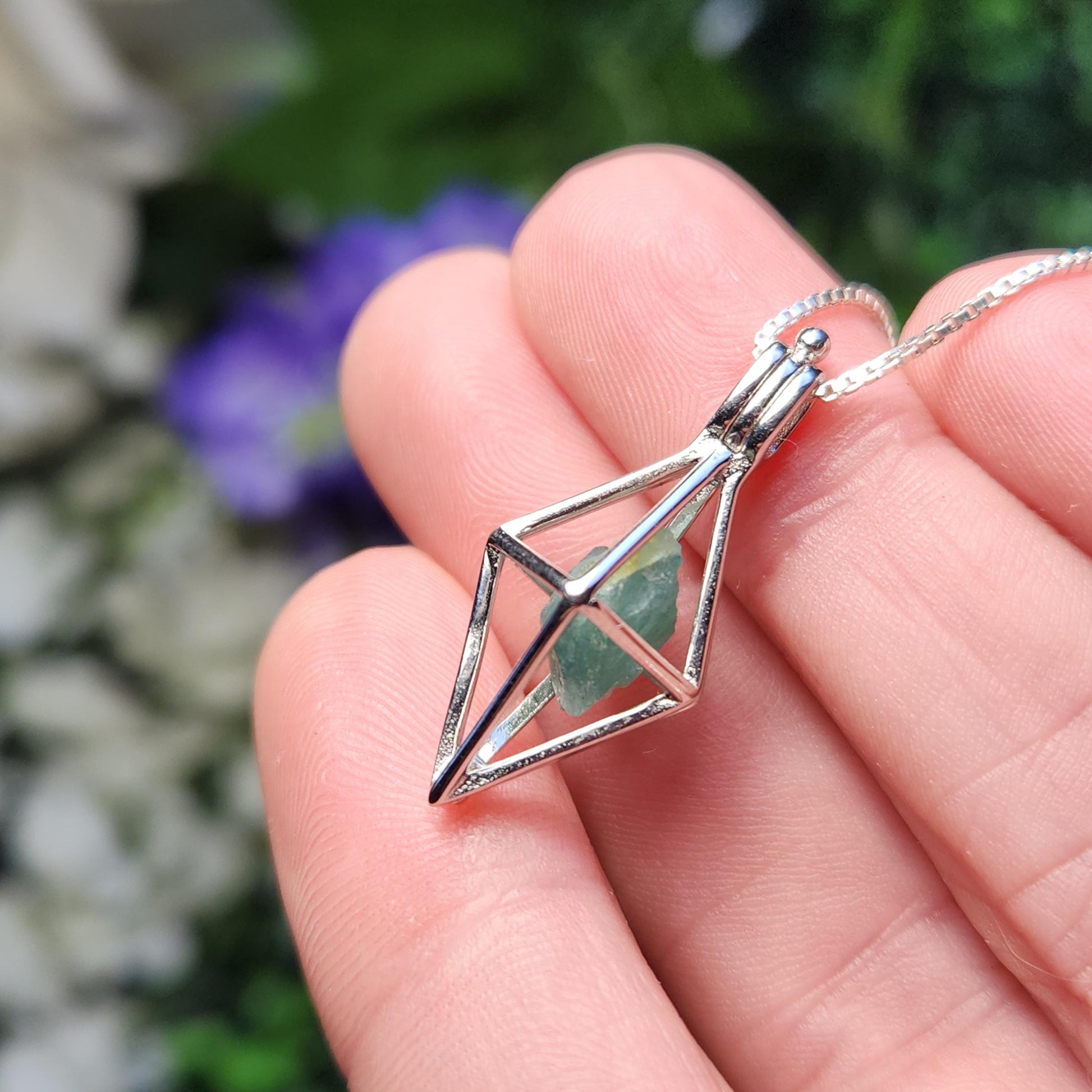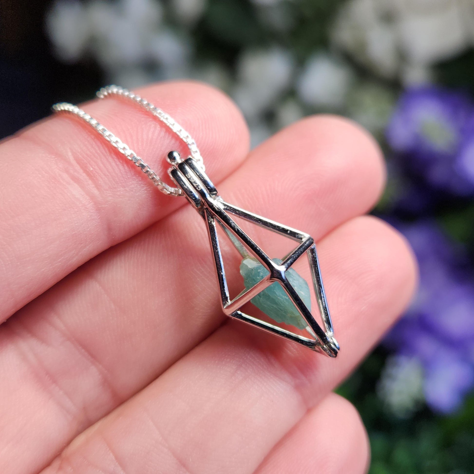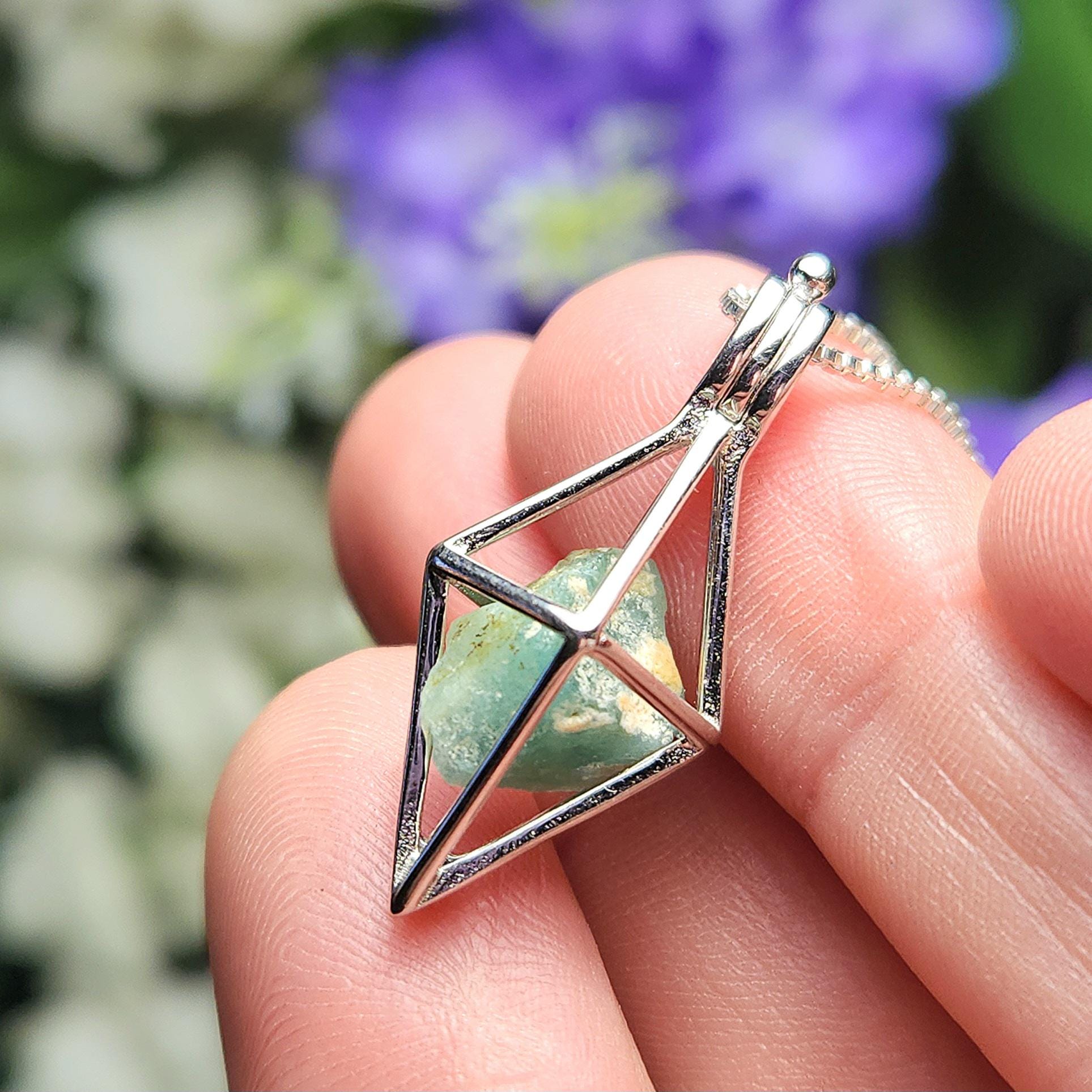 These rare Grandidierite crystals are in their raw, natural form. They exhibit a slightly translucent blue coloring with a greenish hue and have a sheen on their surface. I will hand select a crystal and nestle it inside of a stamped .925 Sterling Silver cage. Each pendant measures approximately 25mm by 12mm.