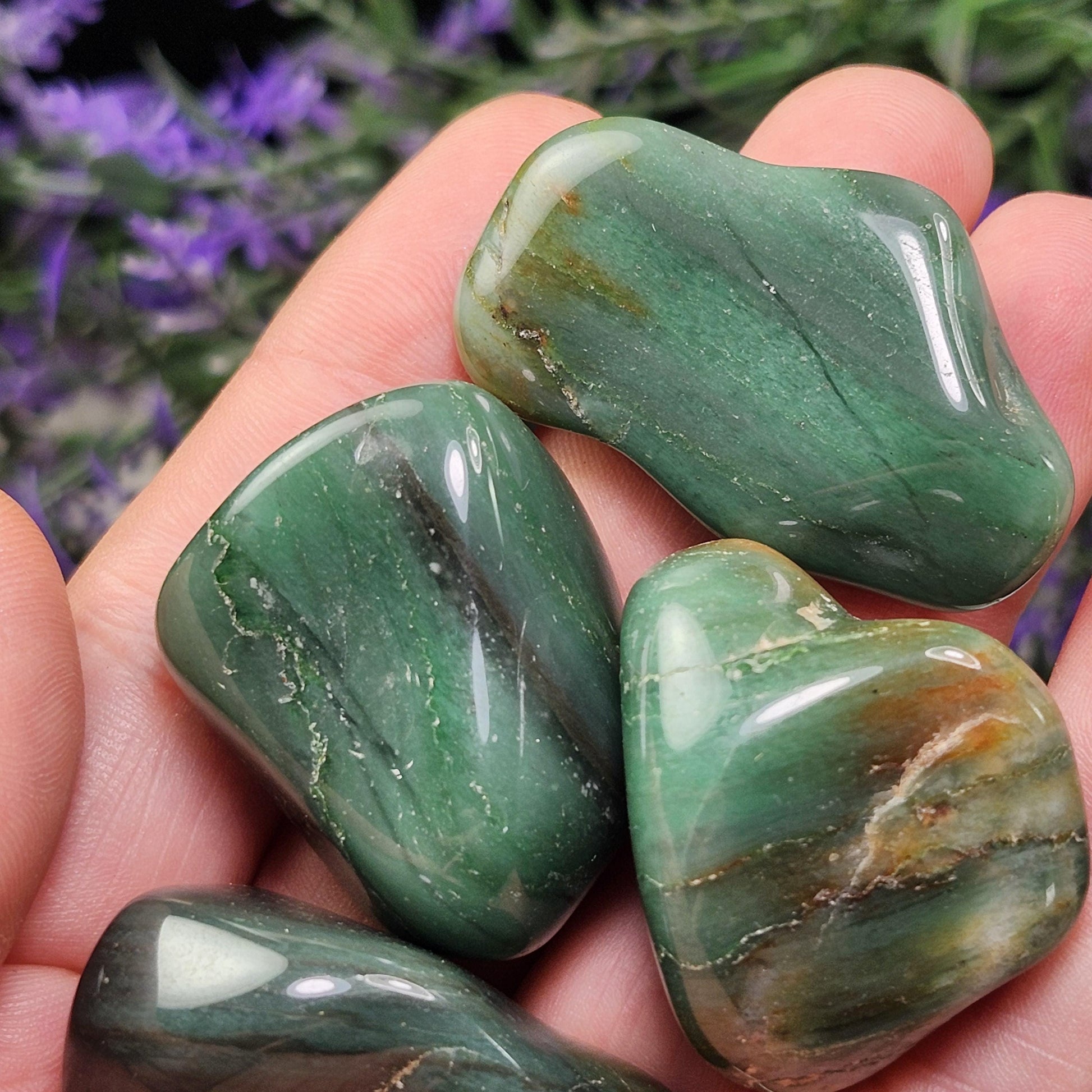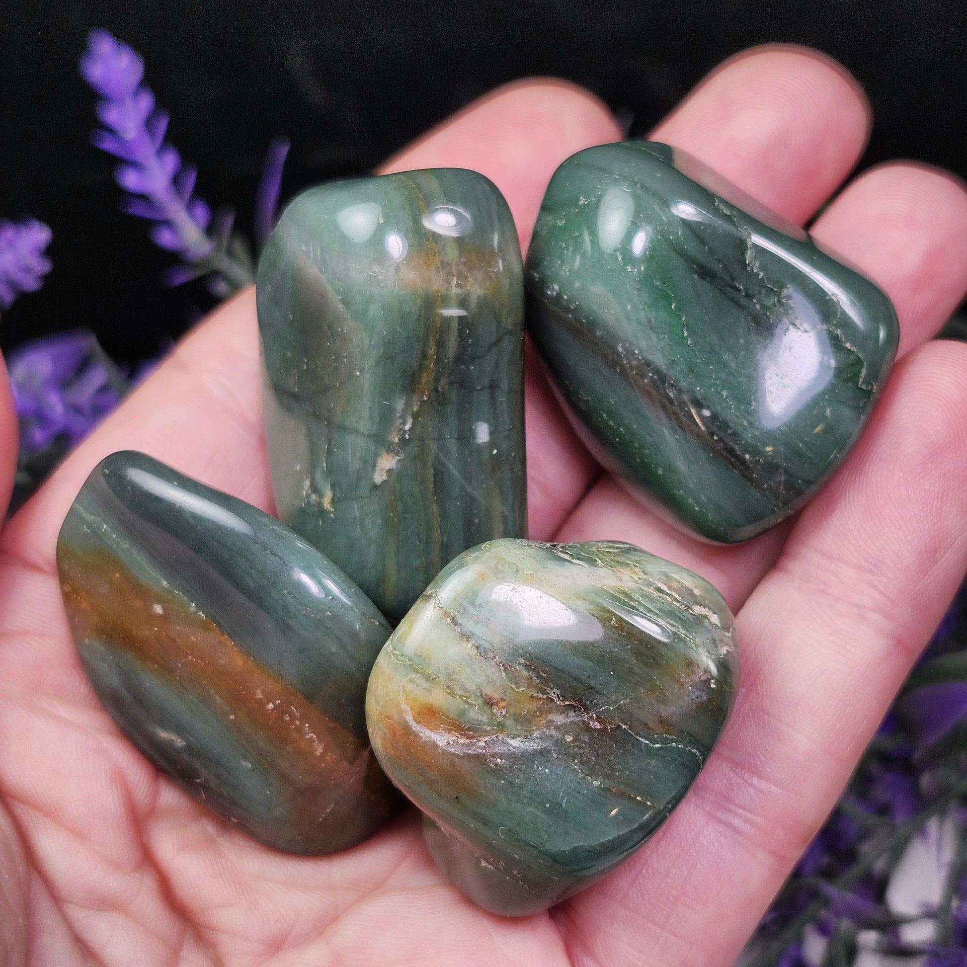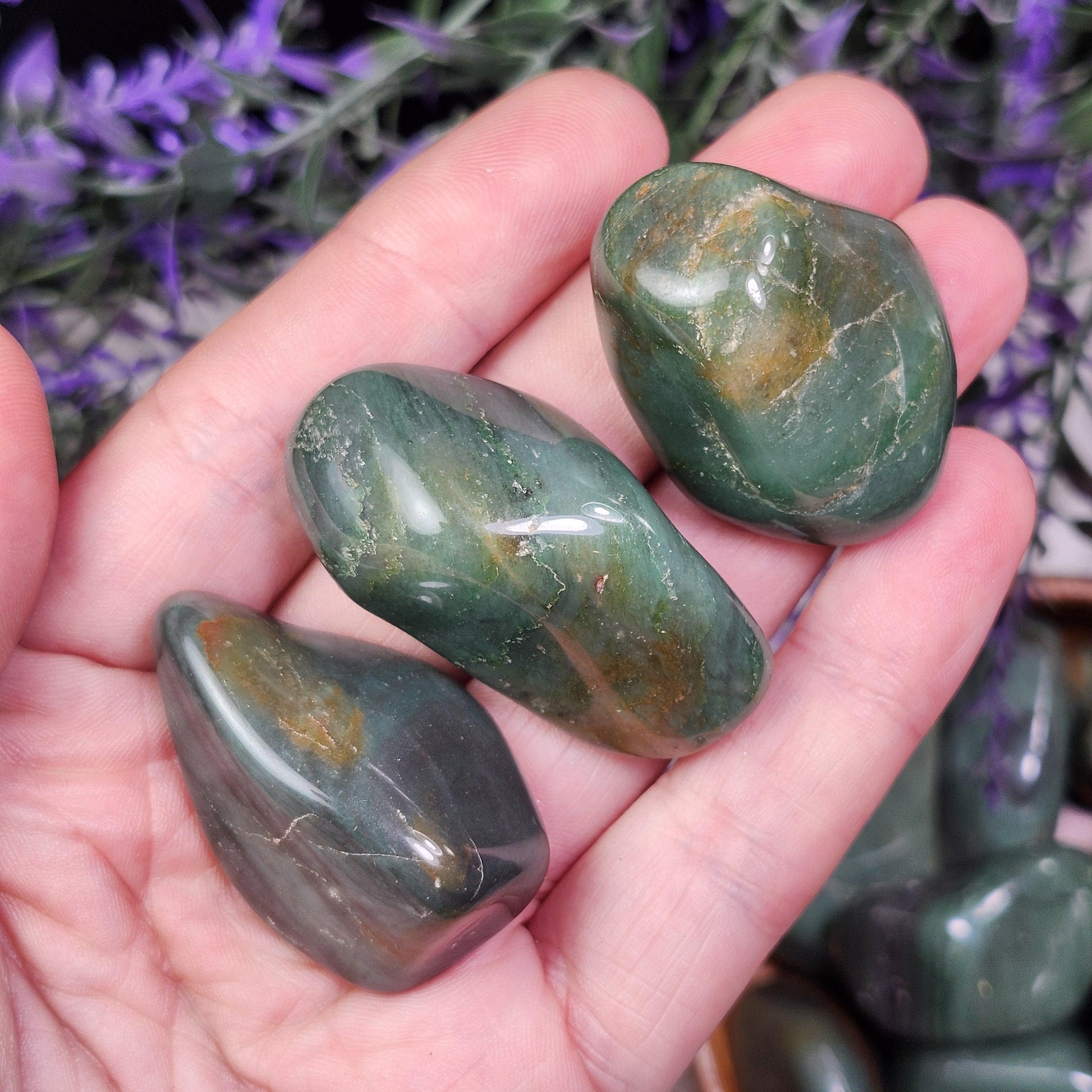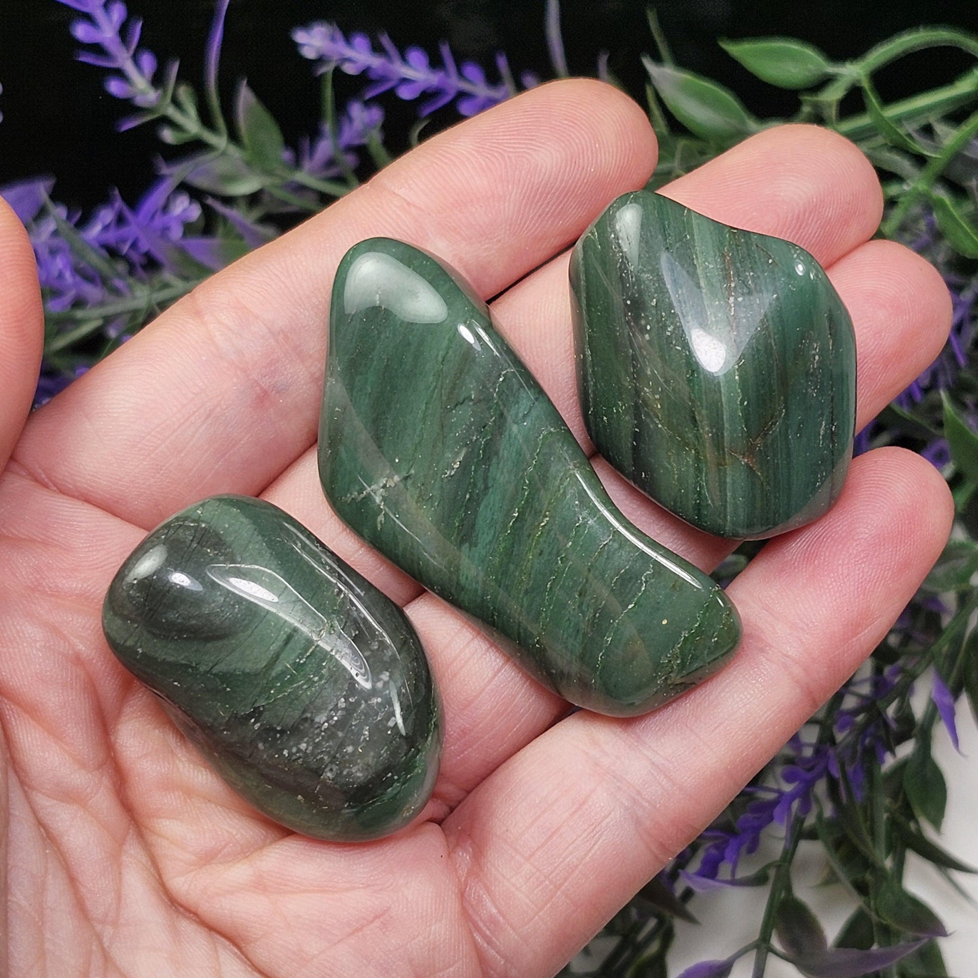 These Chert crystals from South Africa have been tumbled to a smooth polish. They exhibit an earthy green coloring and unique patterns that may include banding. Each specimen measures between 1 inch and 1.5 inches.