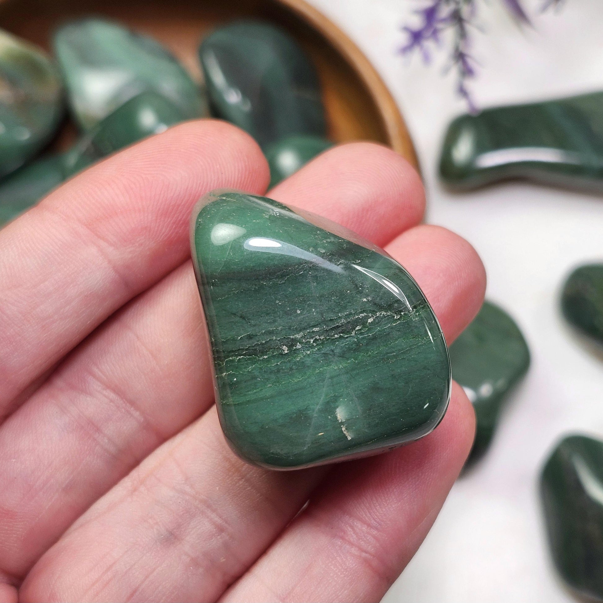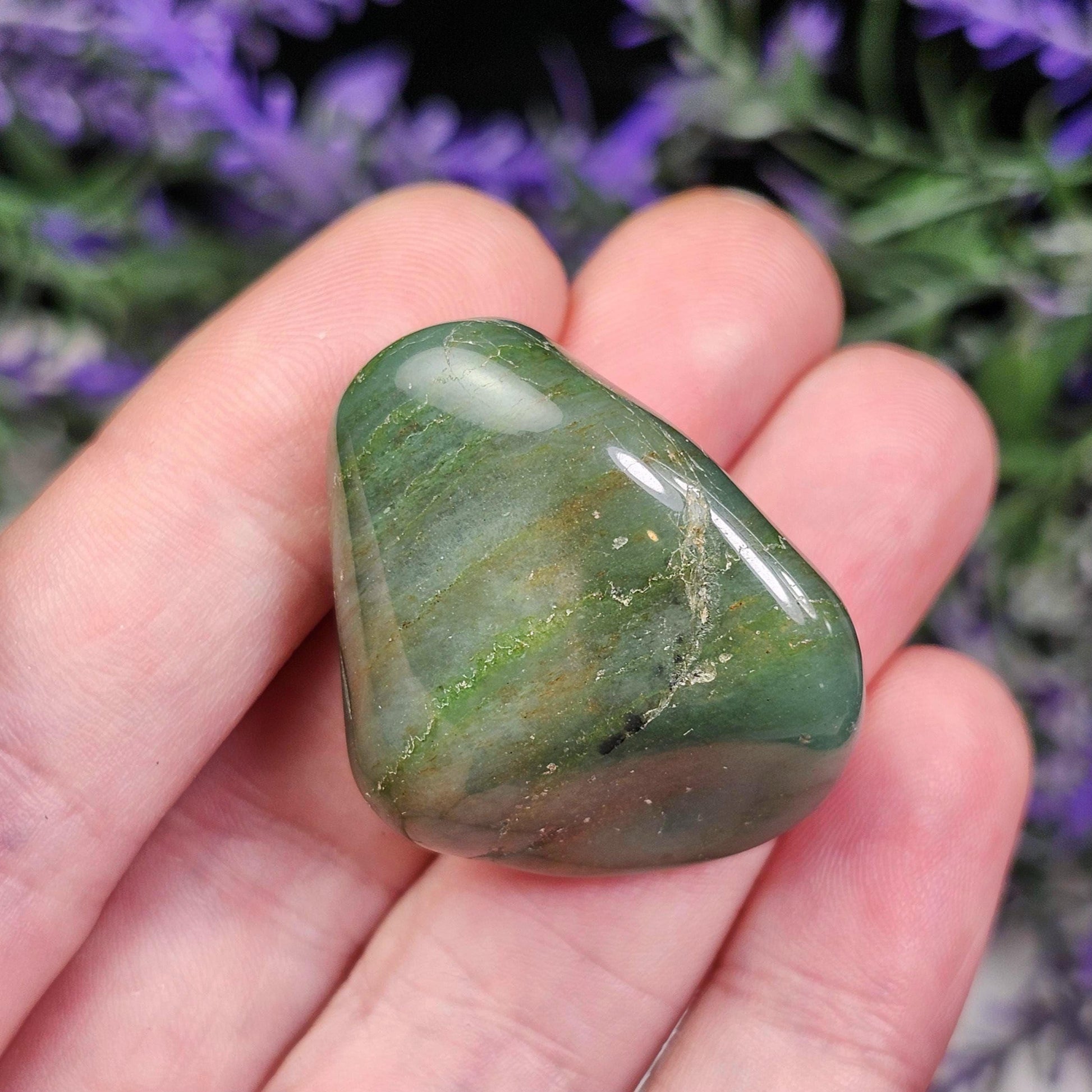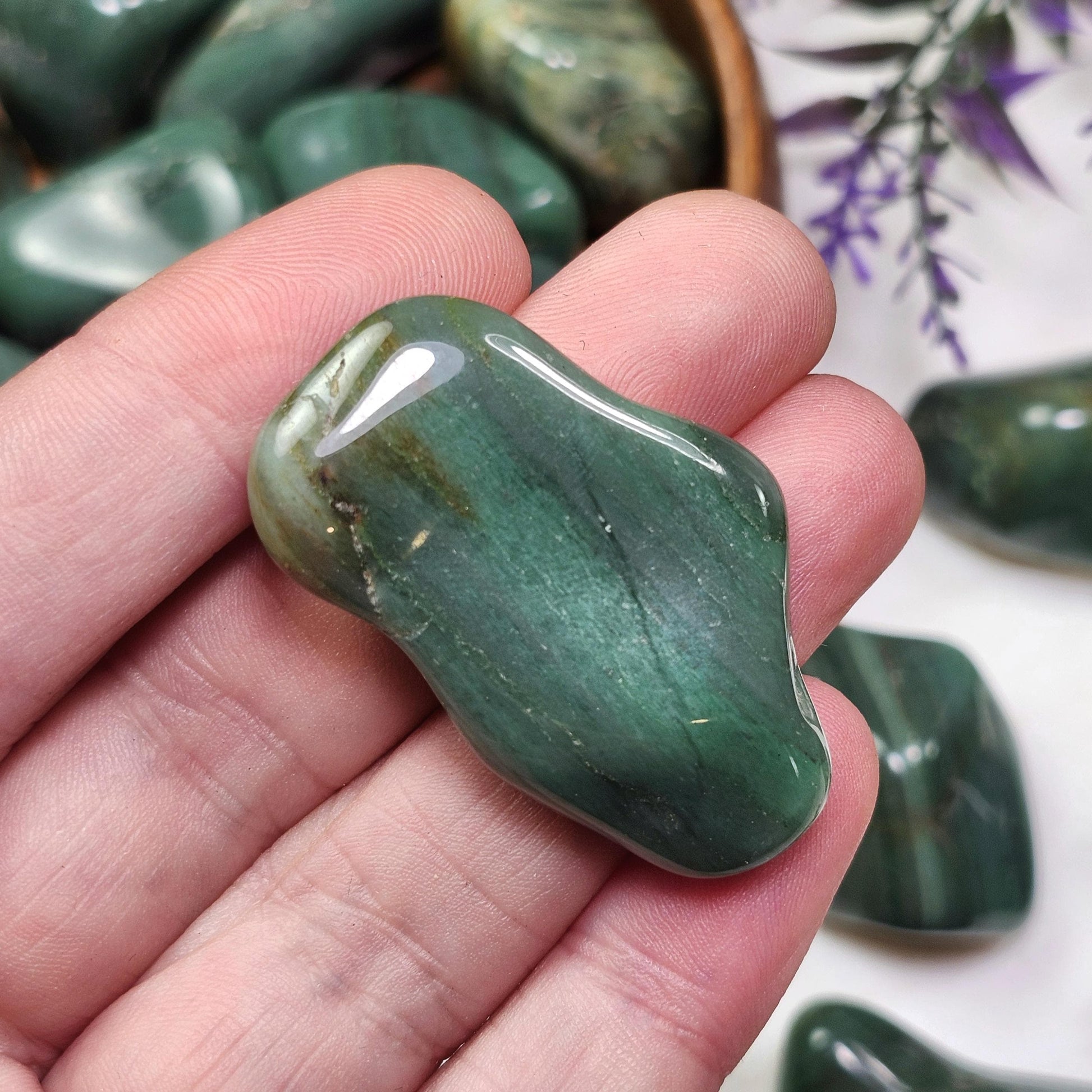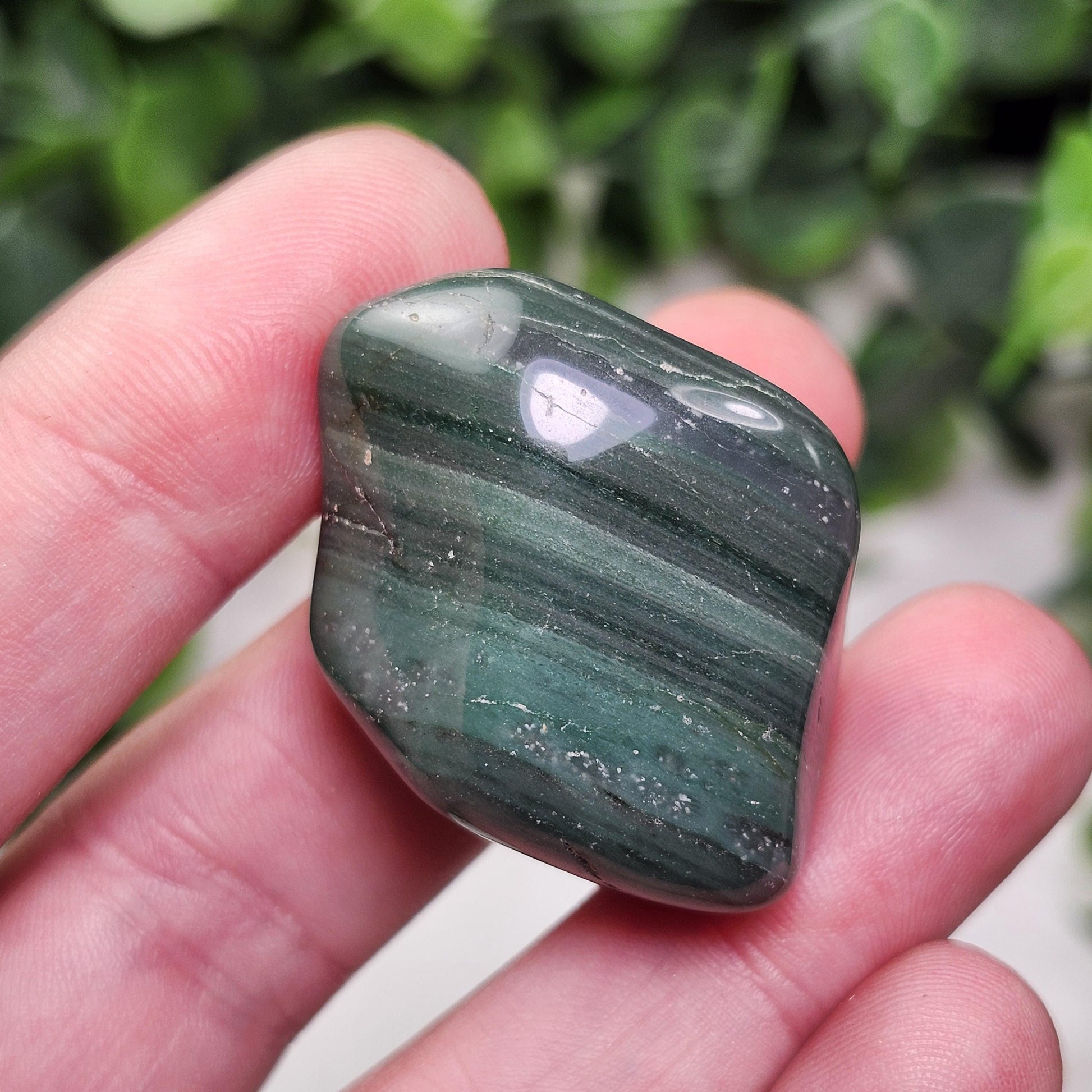These Chert crystals from South Africa have been tumbled to a smooth polish. They exhibit an earthy green coloring and unique patterns that may include banding. Each specimen measures between 1 inch and 1.5 inches.