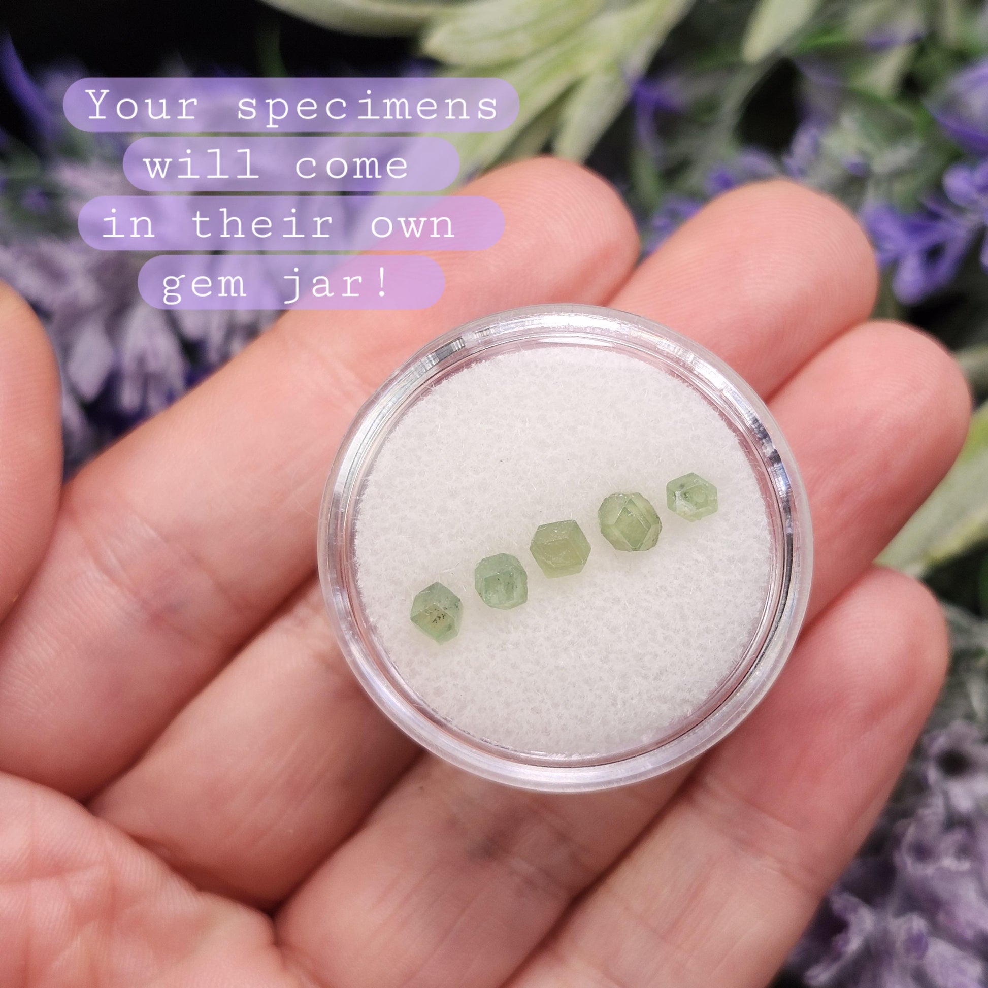 These Demantoid Garnet crystals are from a 2016 find in the gem-rich Skardu region in Pakistan. They exhibit excellent terminations with natural dodecahedron shapes, showcasing a bright green gemmy coloring and a high sheen on their raw surfaces. Each specimen weighs between .25 carats and .5 carats. Each set of 5 crystals will arrive within a plastic gem jar to ensure their safety.