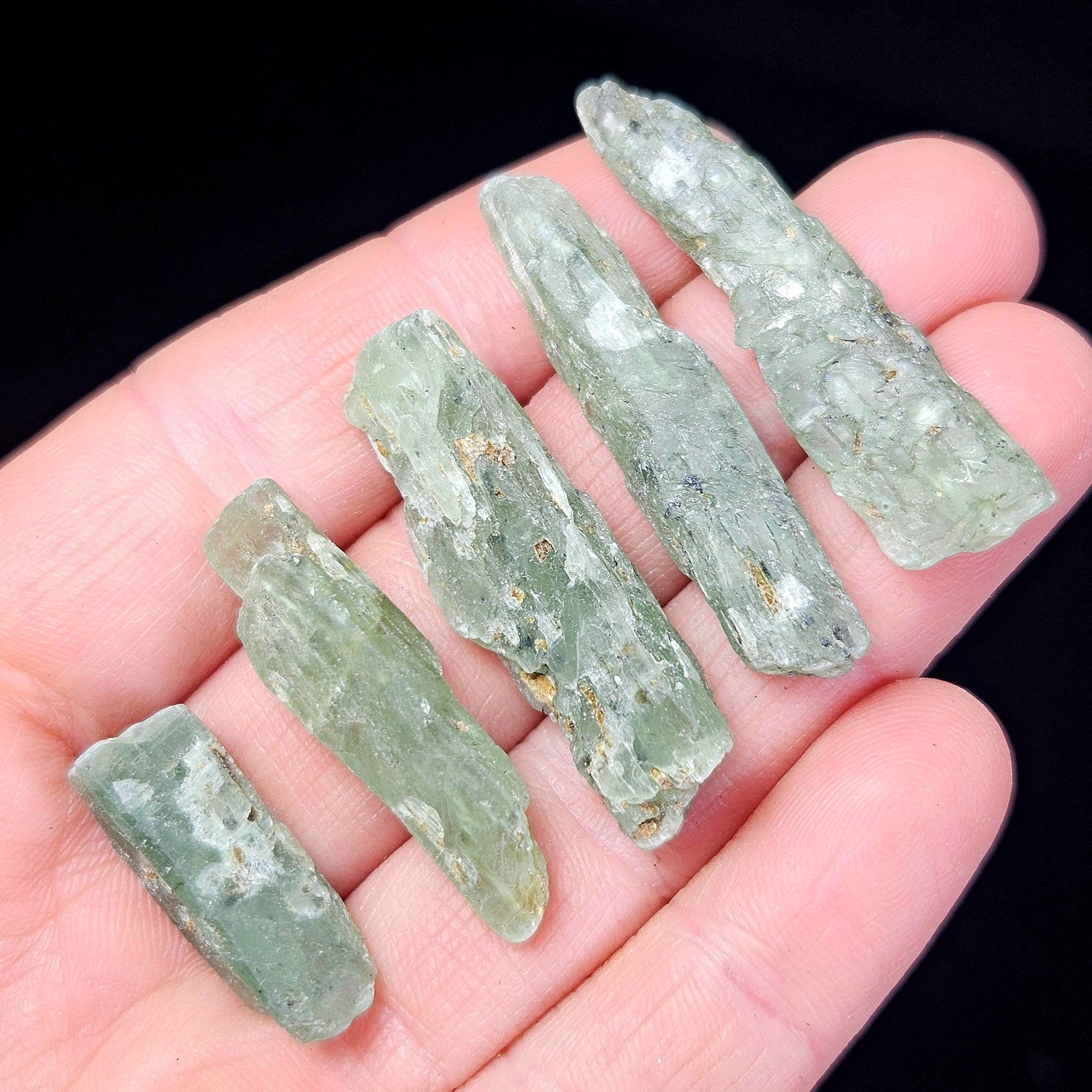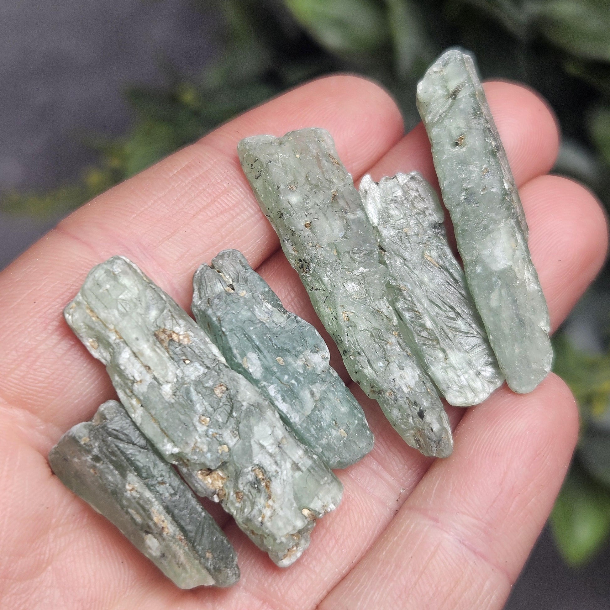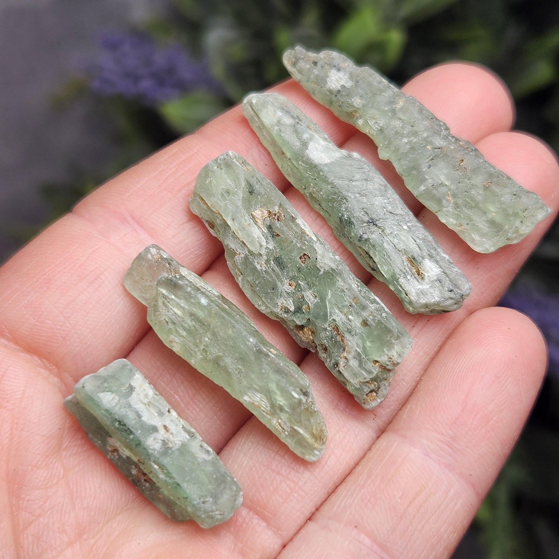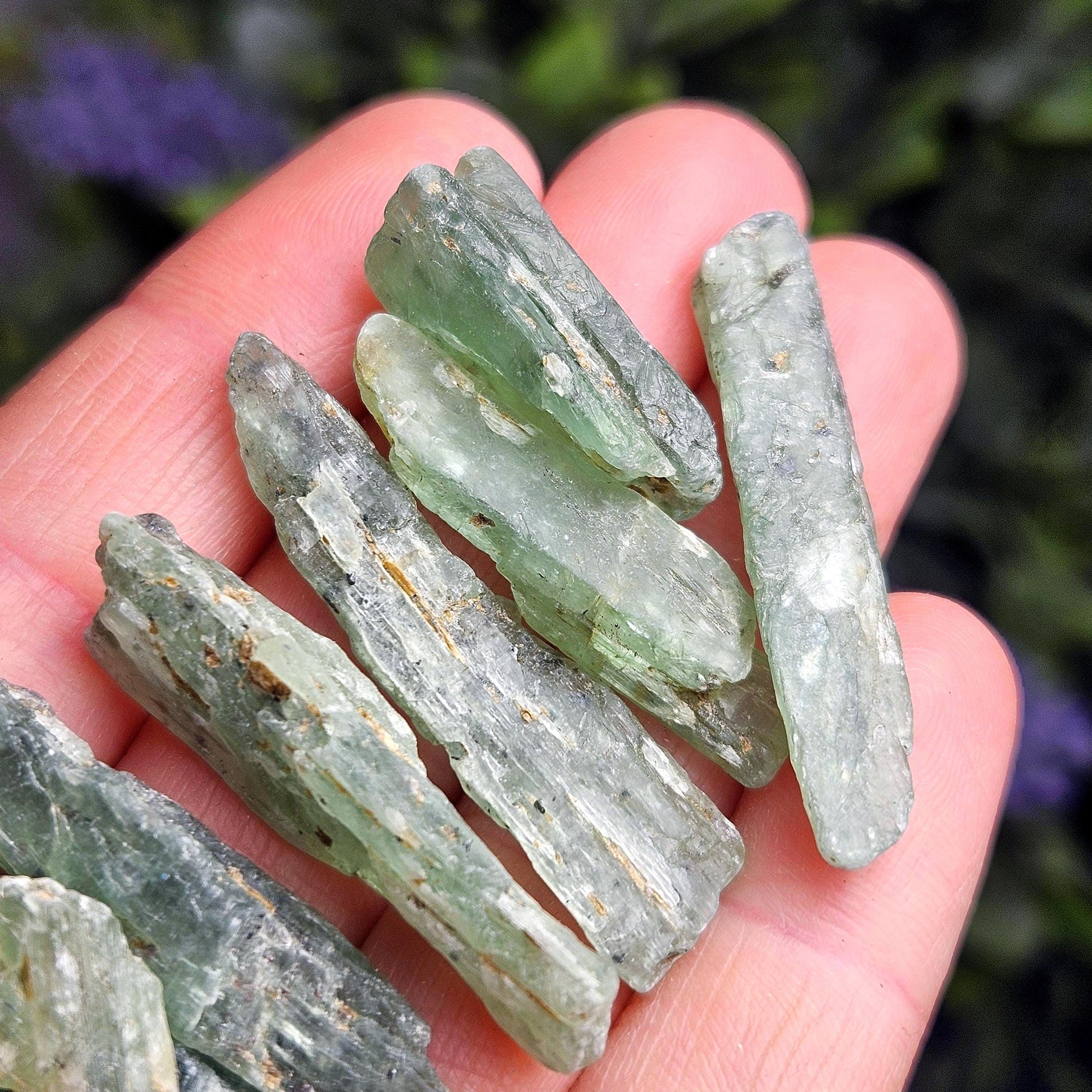 These Tanzanian Kyanite crystals have visible striations and a range of teal-green shades with partial translucence. Each piece has its own character, natural inclusions, and a range of freeform shapes.