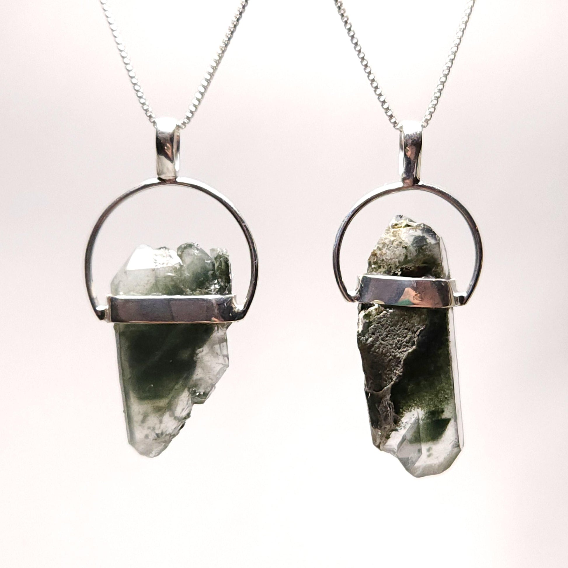 These Faden Quartz crystals from the sacred Himalayan Mountain range exhibits green Chlorite phantoms within their translucent depths. They may showcase natural termination, keyholes, and a range of other characteristics that are classic to Quartz. Each crystal has been custom created into a sturdy piece of jewelry using .925 Sterling Silver. Each pendant measures approximately 42mm by 20mm - these measurements are meant to give a general idea of size; the actual dimensions of the pendant you receive may vary slightly. The silver chain used in the photos is to help envision how this pendant will look while adorned but is not included in the listing.