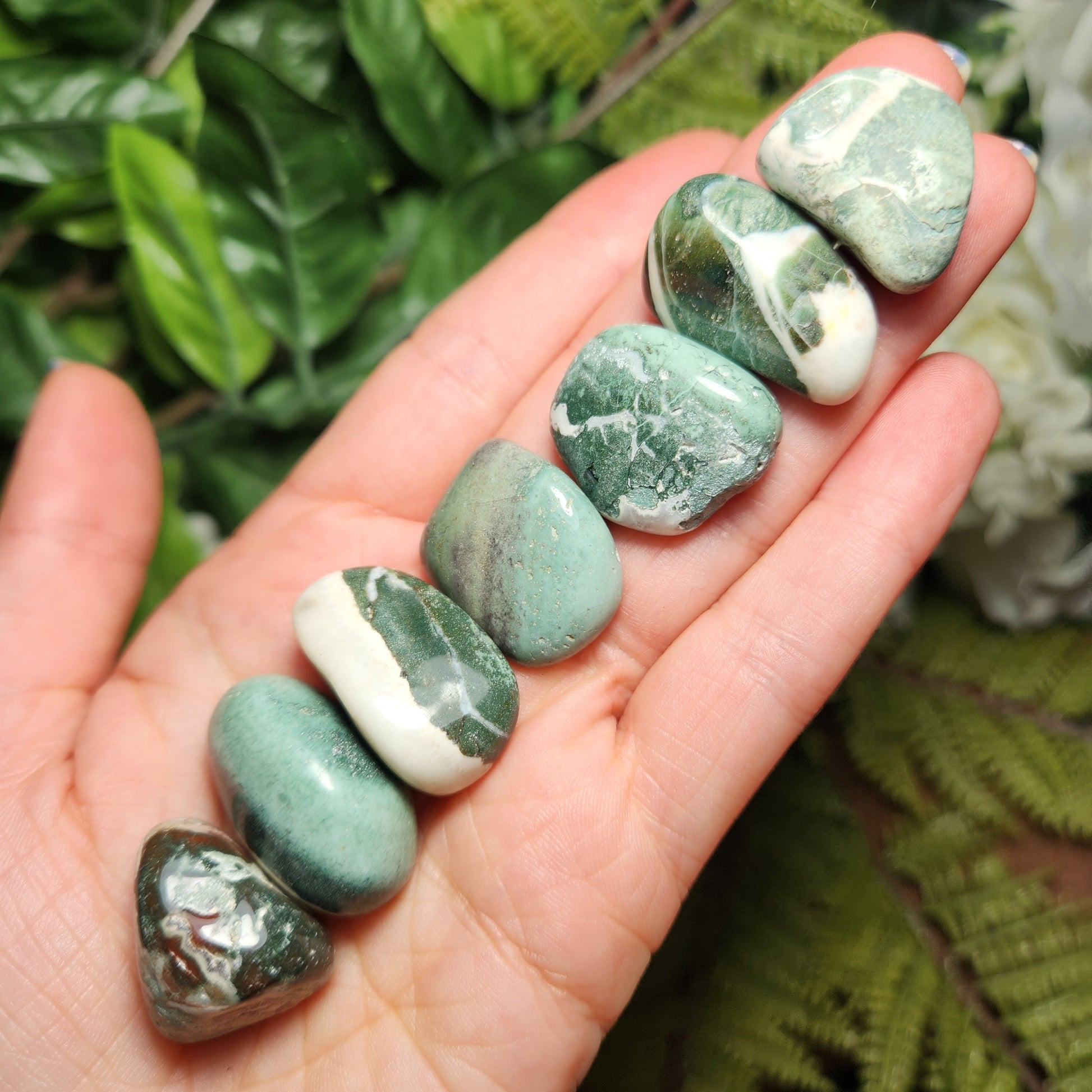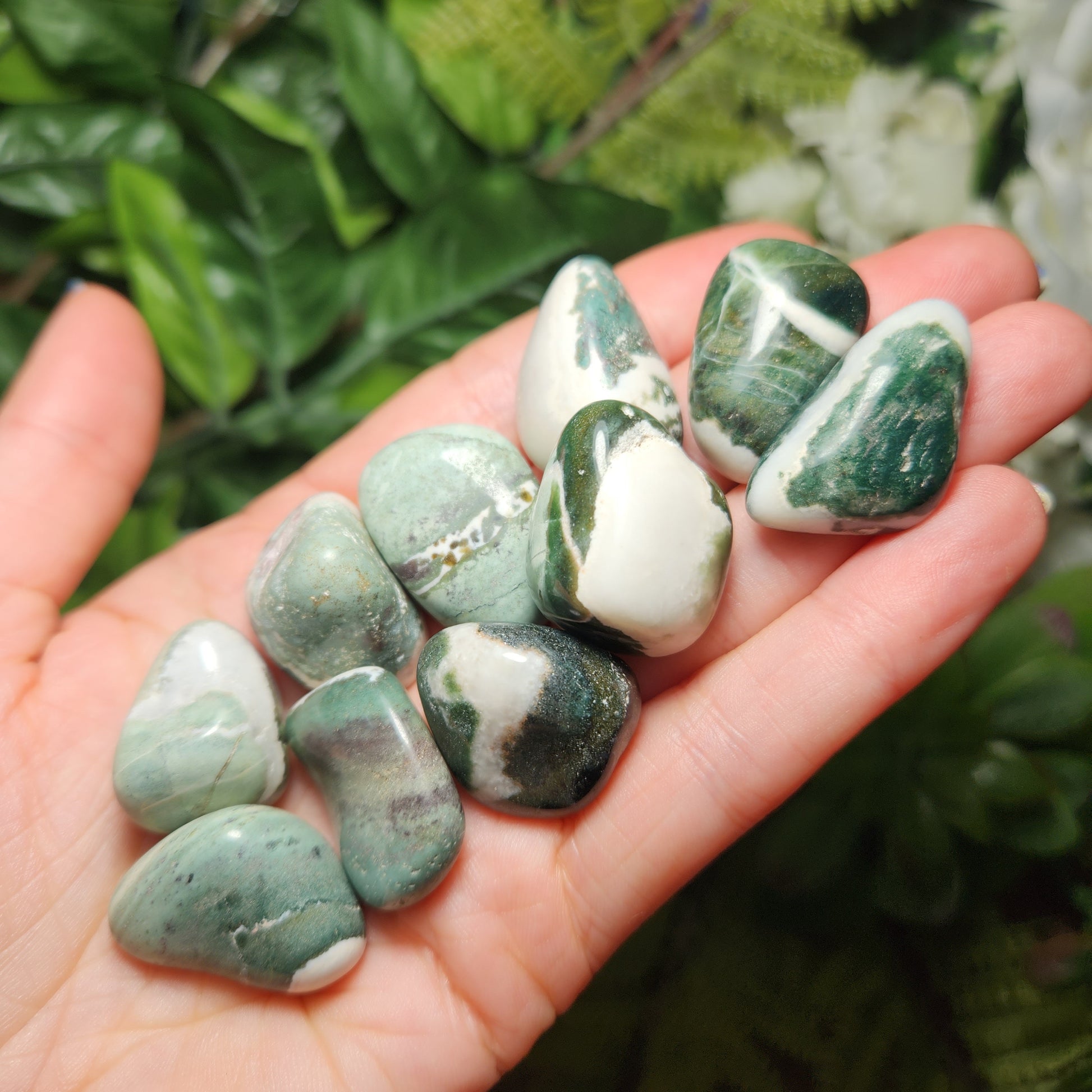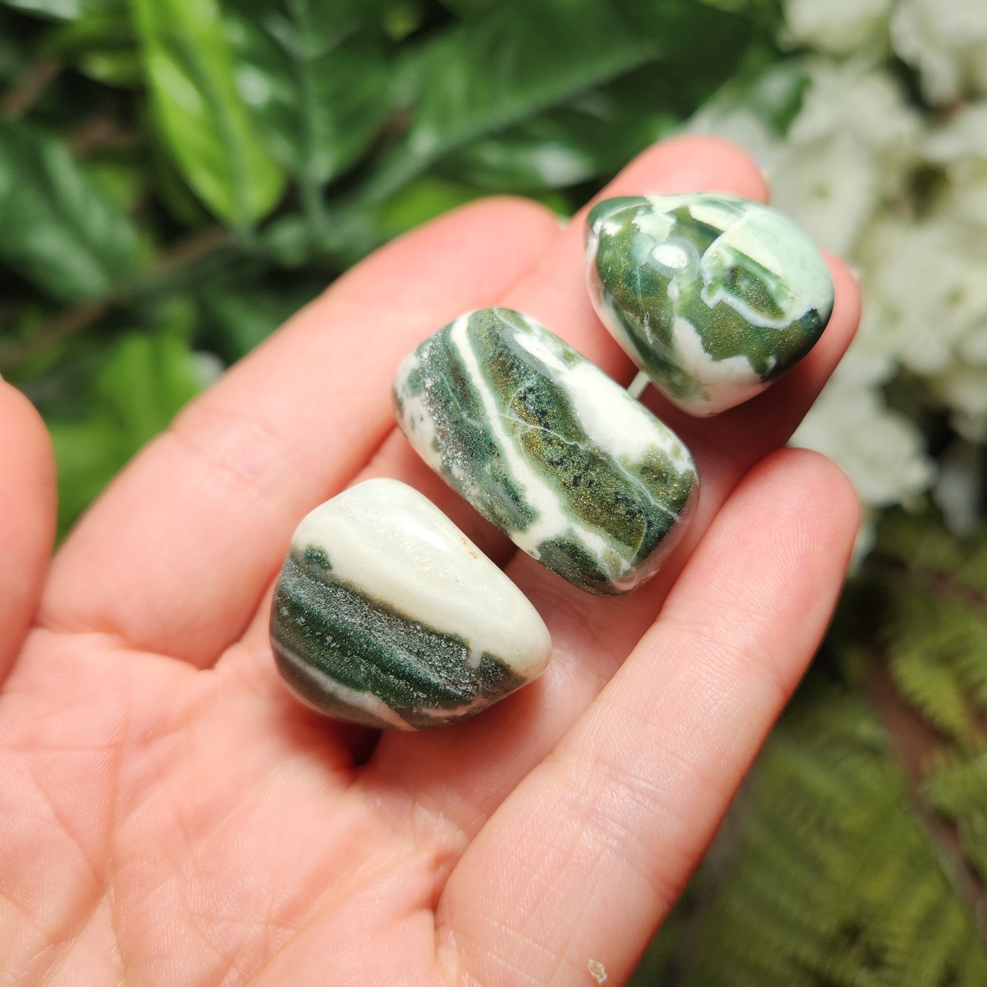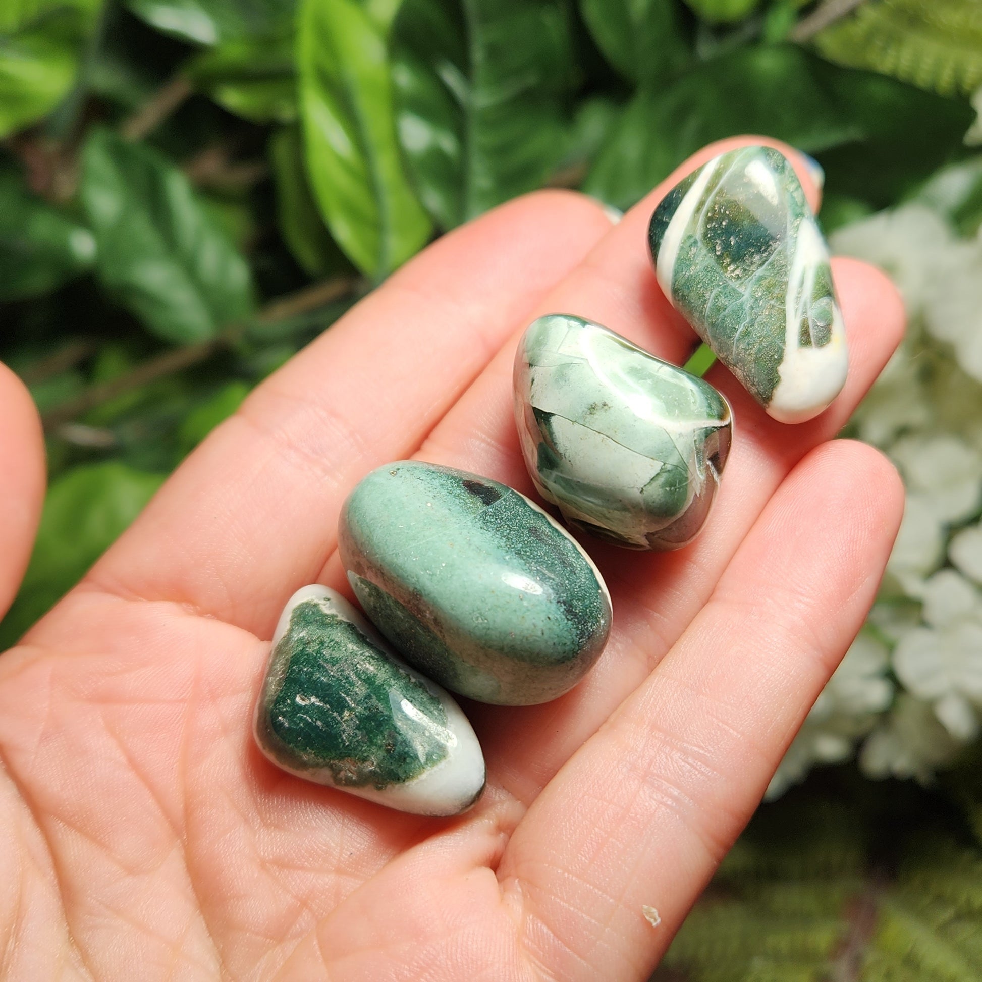 These Green Sardonyx stones have been tumbled to a smooth polish. They exhibit shades of green swirled with creamy white, creating unique patterns. Each specimen measures approximately .75 to 1 inch in size.