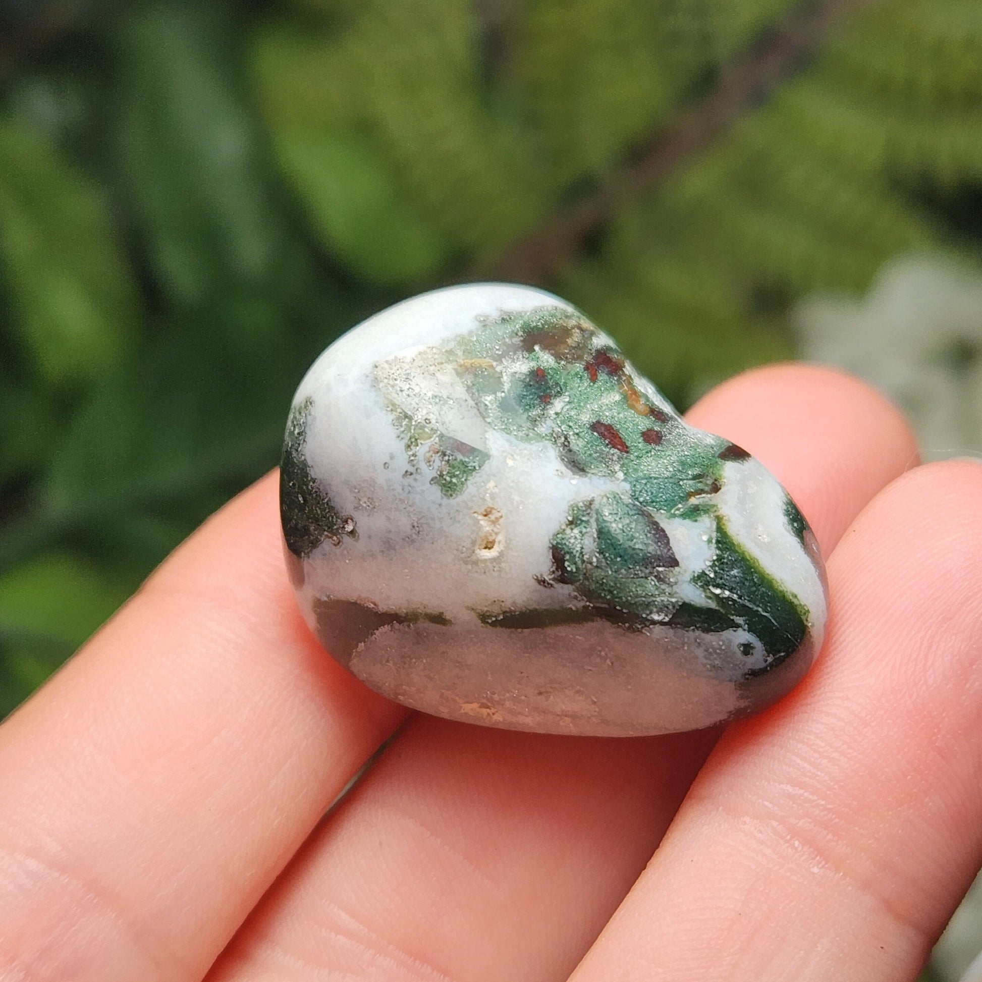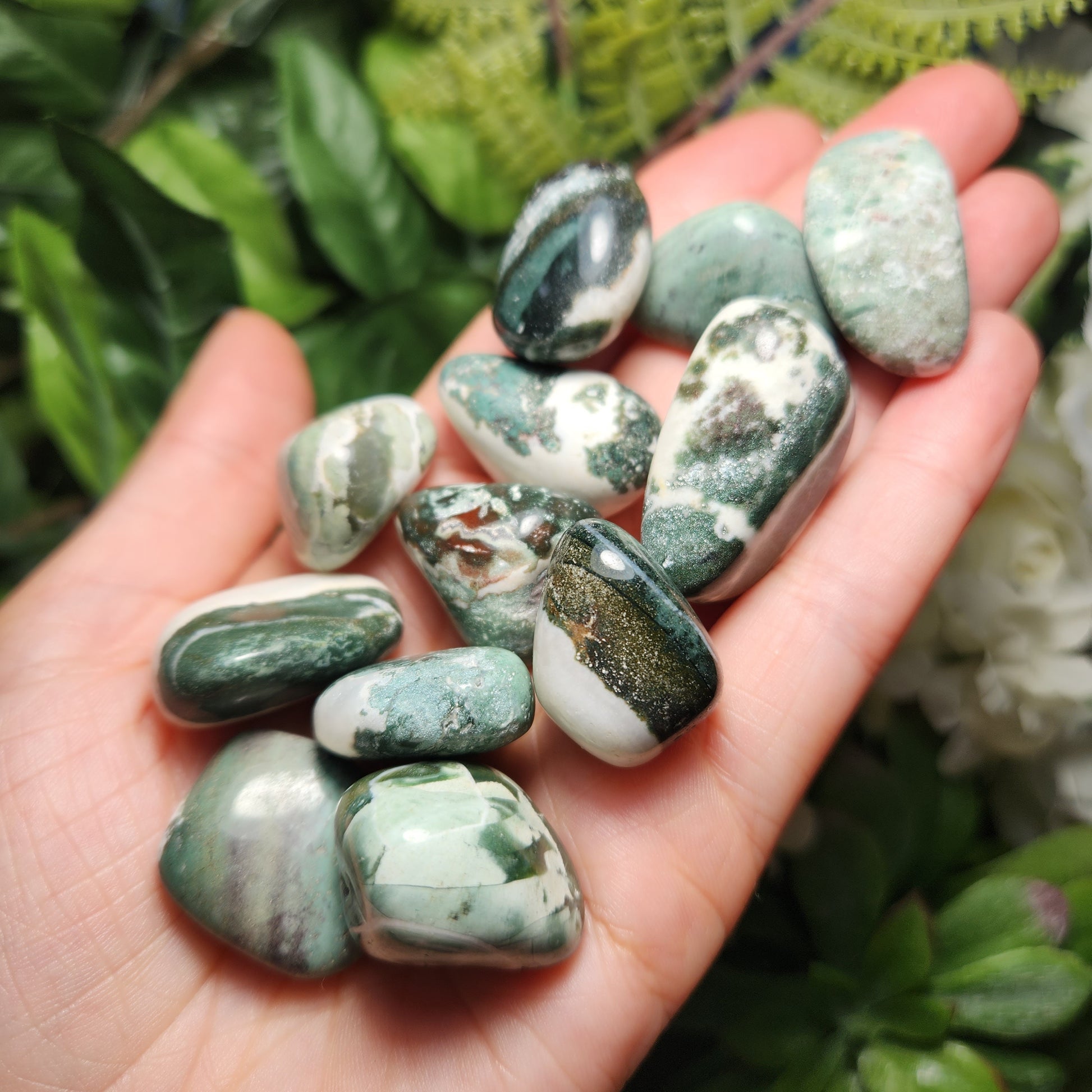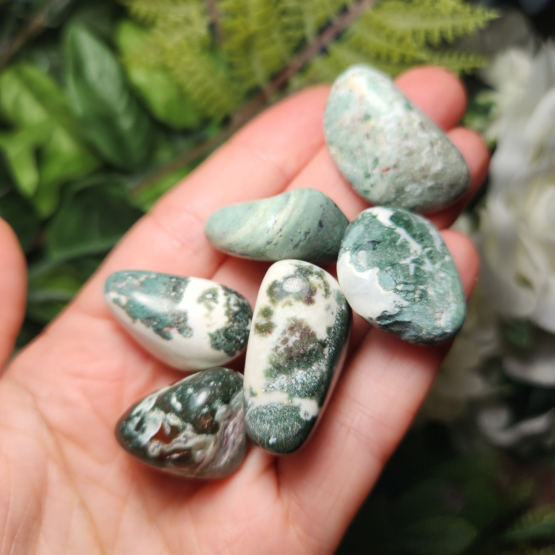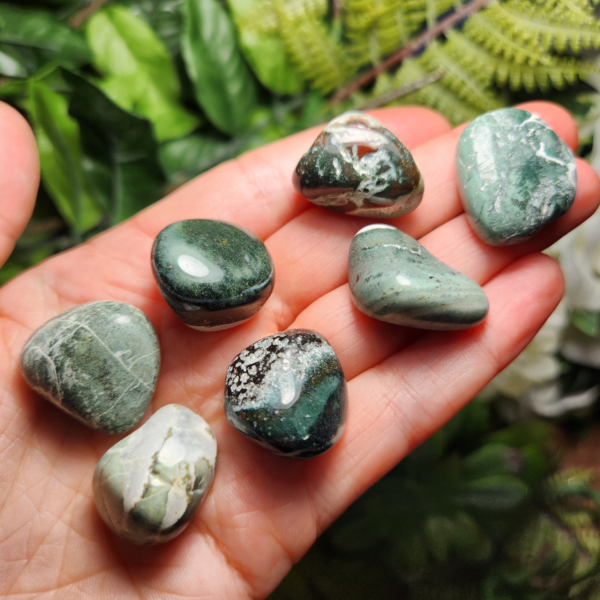These Green Sardonyx stones have been tumbled to a smooth polish. They exhibit shades of green swirled with creamy white, creating unique patterns. Each specimen measures approximately .75 to 1 inch in size.