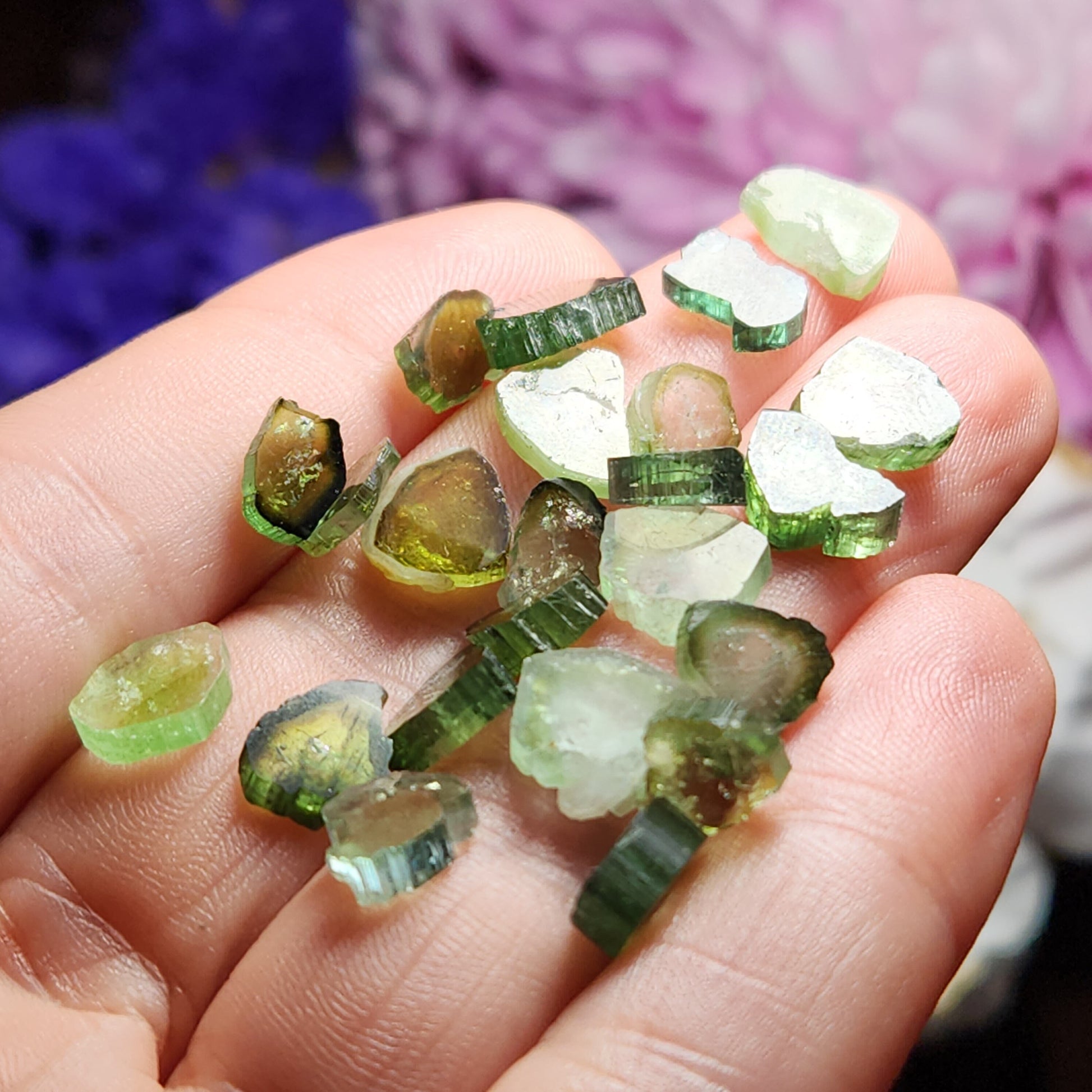 These Green Tourmaline crystals have been sliced and polished to a high sheen on both sides. Perfect for lockets or jewelry making, they exhibit an array of shades of translucent greens, from a pale pastel to a dark forest, and have striations on their sides. Each small tourmaline slice weighs between .75 carats and 2 carats and measuring 5 millimeters and up.