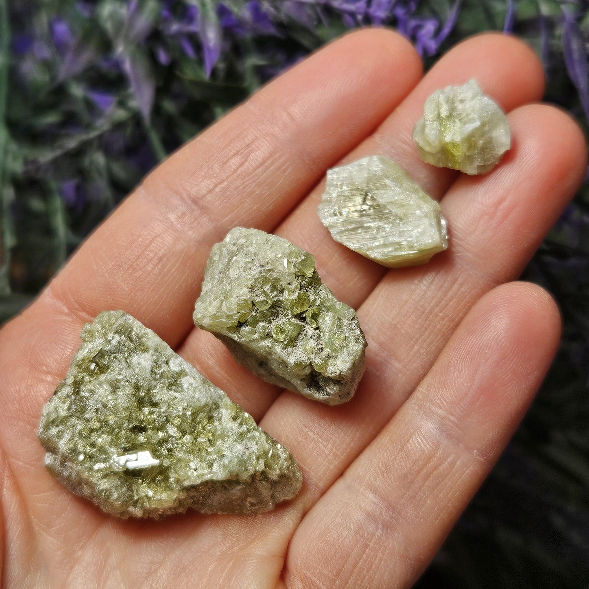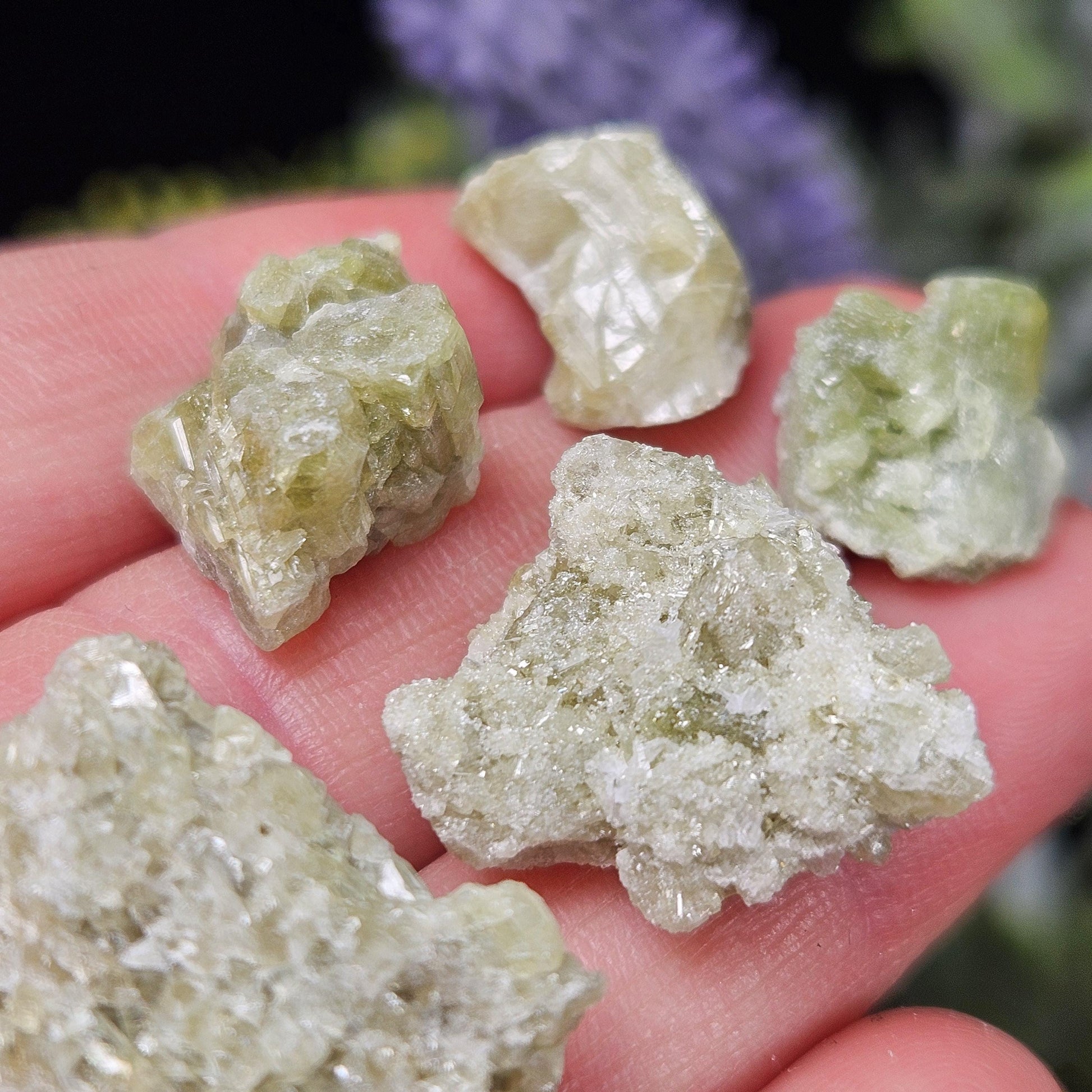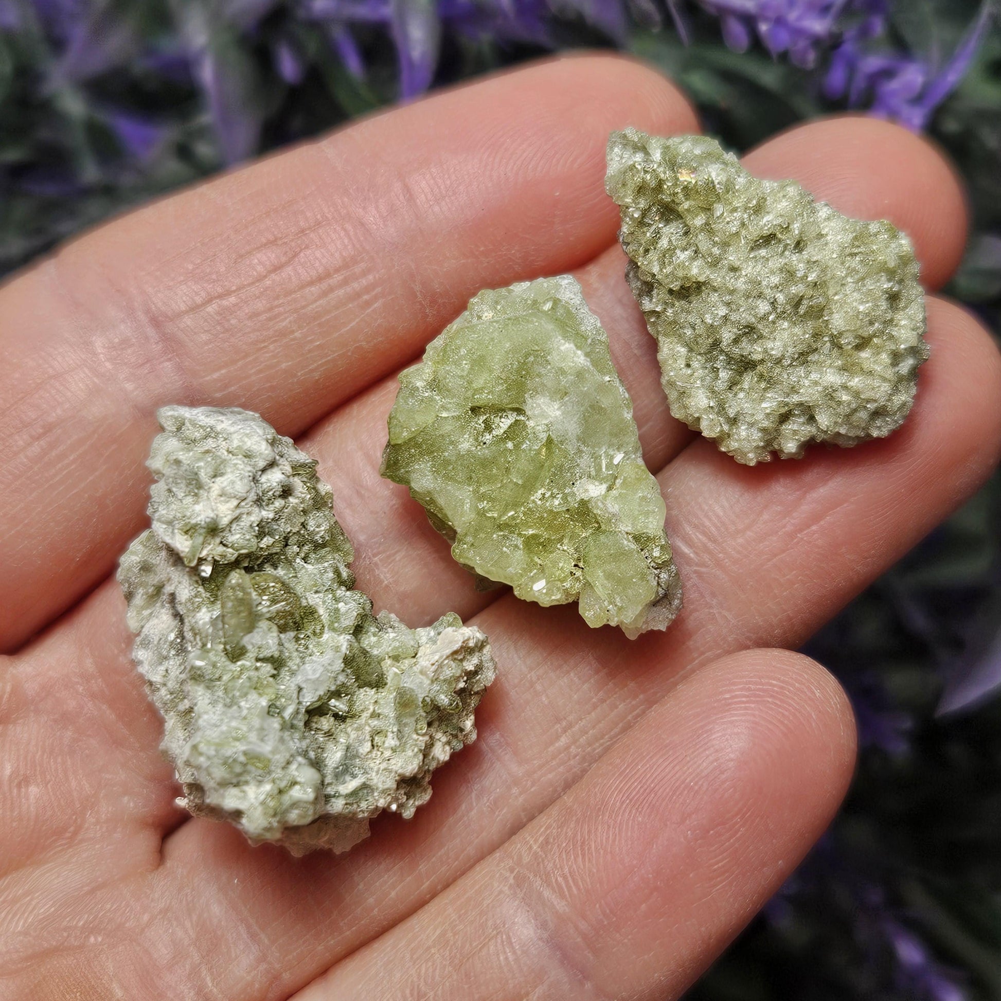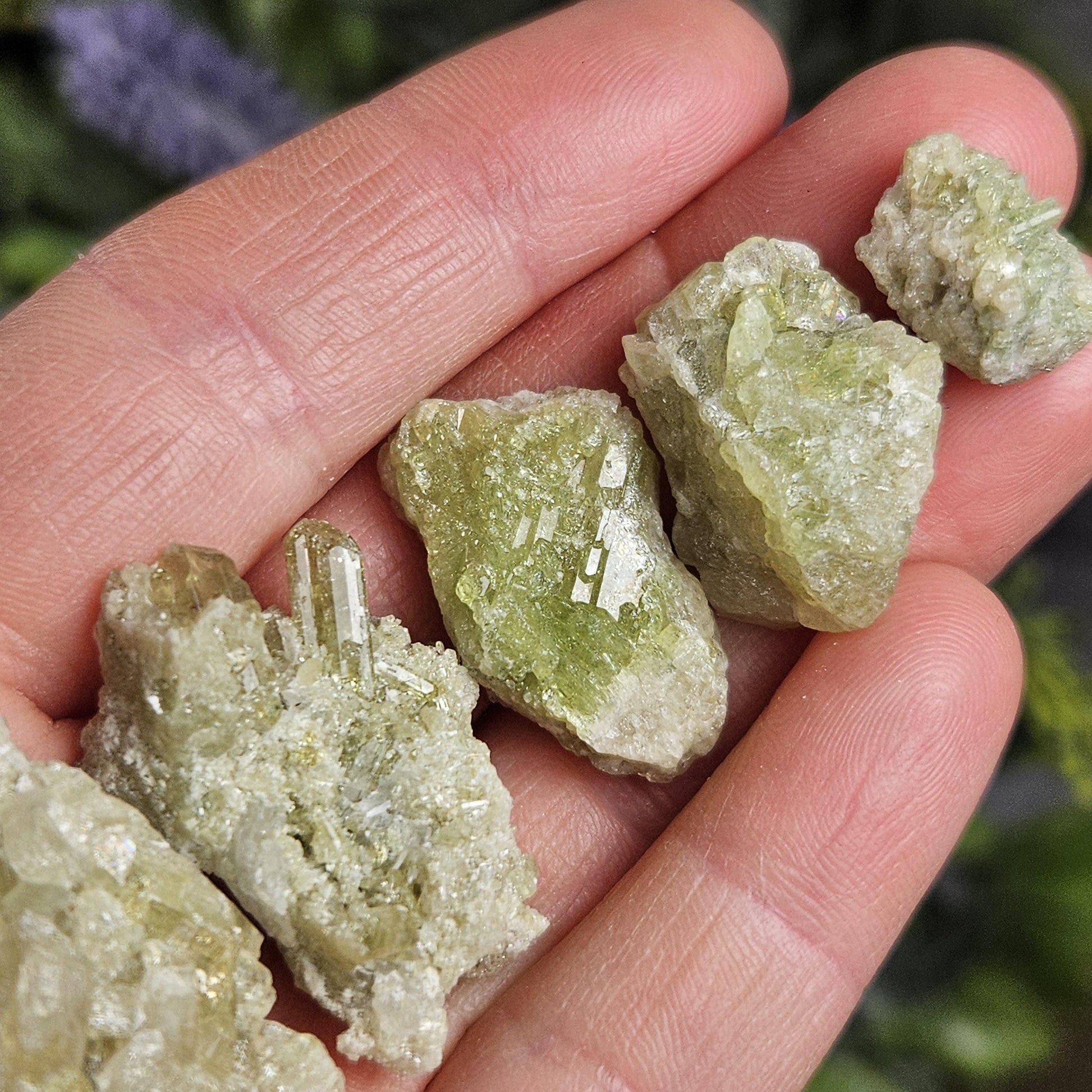 These green toned Vesuvianite crystals from the Jeffrey Mine in Quebec, Canada are in their raw, natural form, exhibiting a gemmy sparkle. They have freeform shapes and may exhibit small terminations and hints of purple Vesuvianite as well.