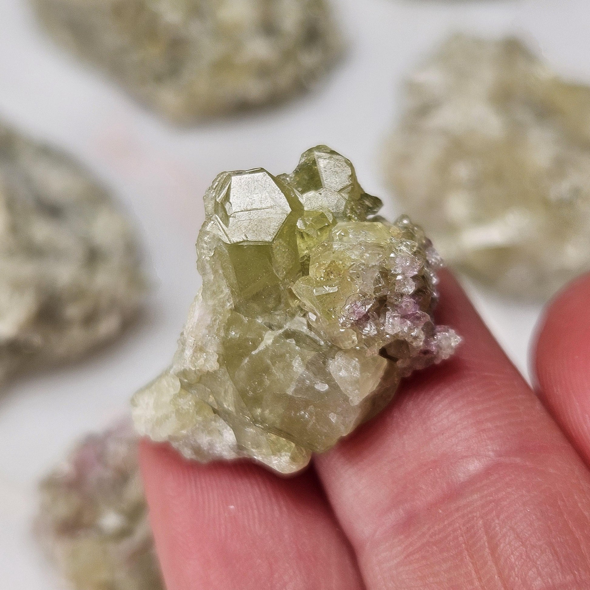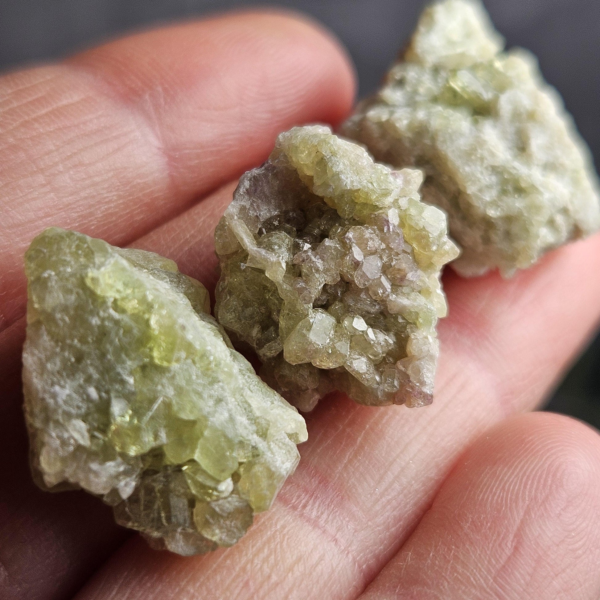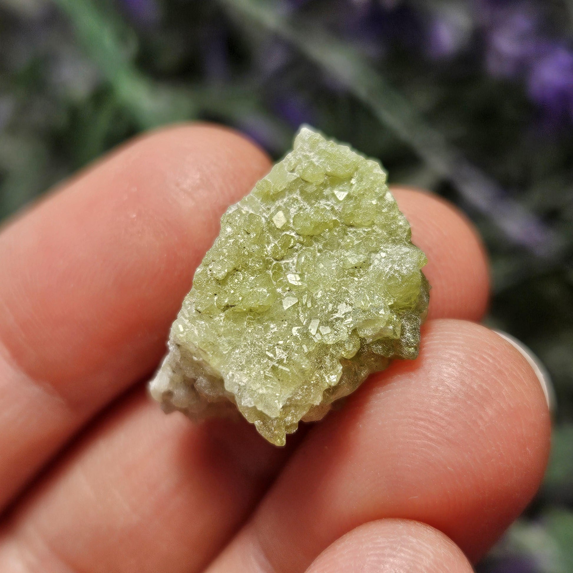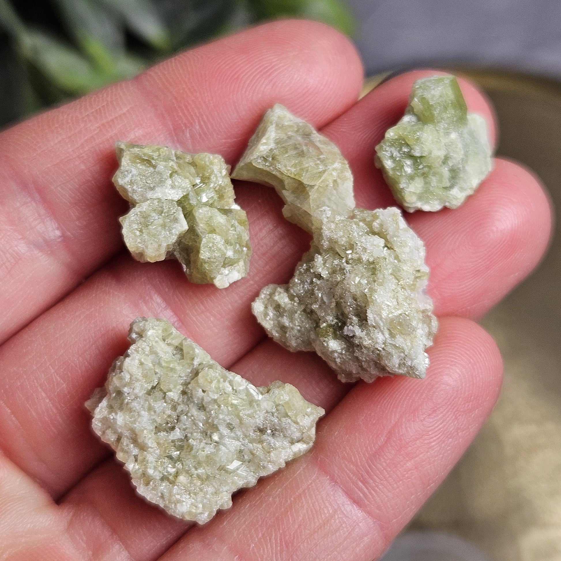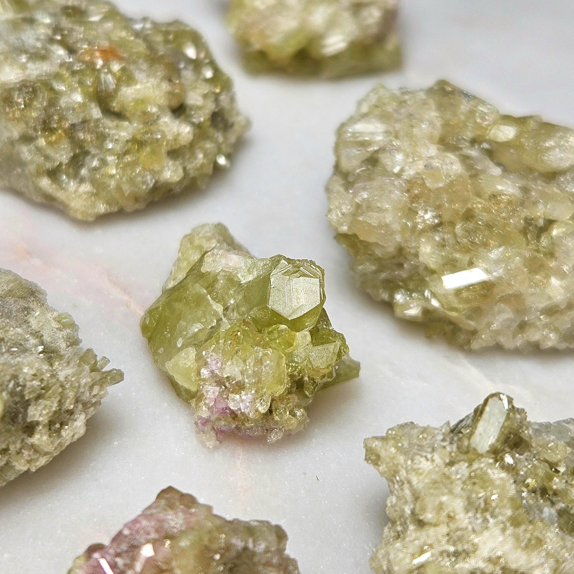 These green toned Vesuvianite crystals from the Jeffrey Mine in Quebec, Canada are in their raw, natural form, exhibiting a gemmy sparkle. They have freeform shapes and may exhibit small terminations and hints of purple Vesuvianite as well.
