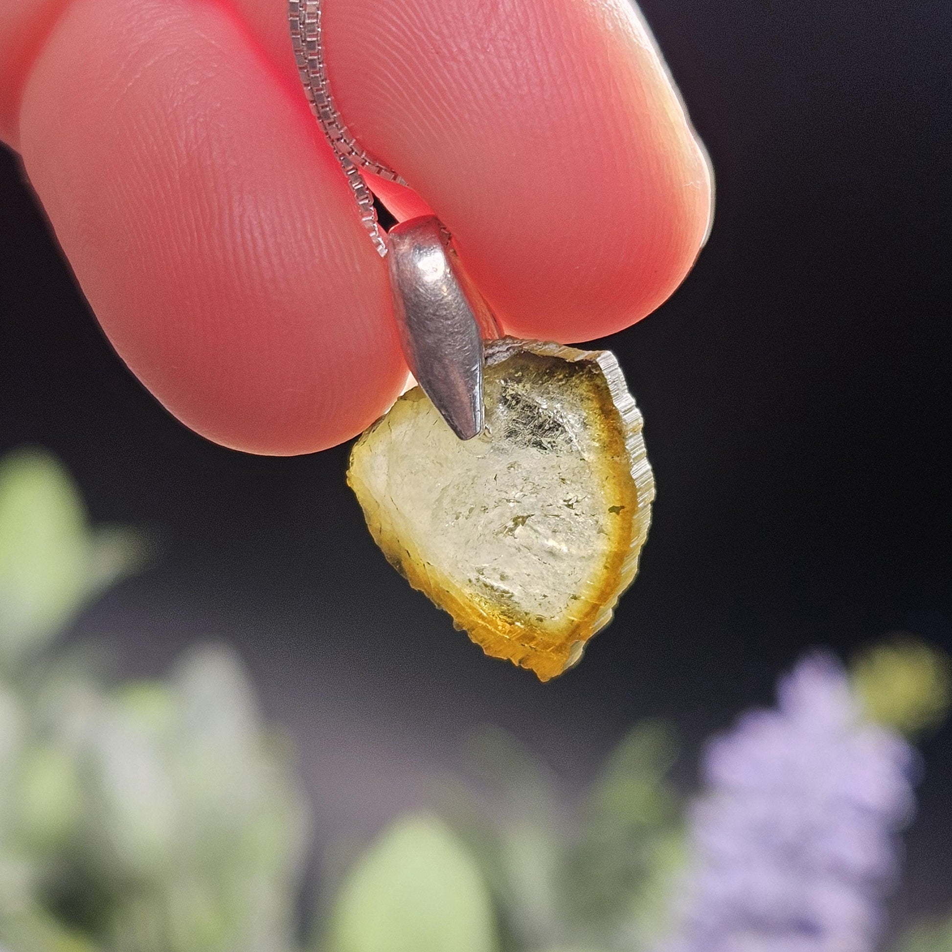 This "watermelon" style tourmaline crystal slice exhibits two shades of green, a lovely translucence, and visible striations on its side. It has been made into an intentional piece of jewelry using stamped .925 Sterling Silver. This pendant measures approximately 20mm by 13mm. The silver chain used in the photos is to help envision how this pendant will look while adorned but is not included in the listing.