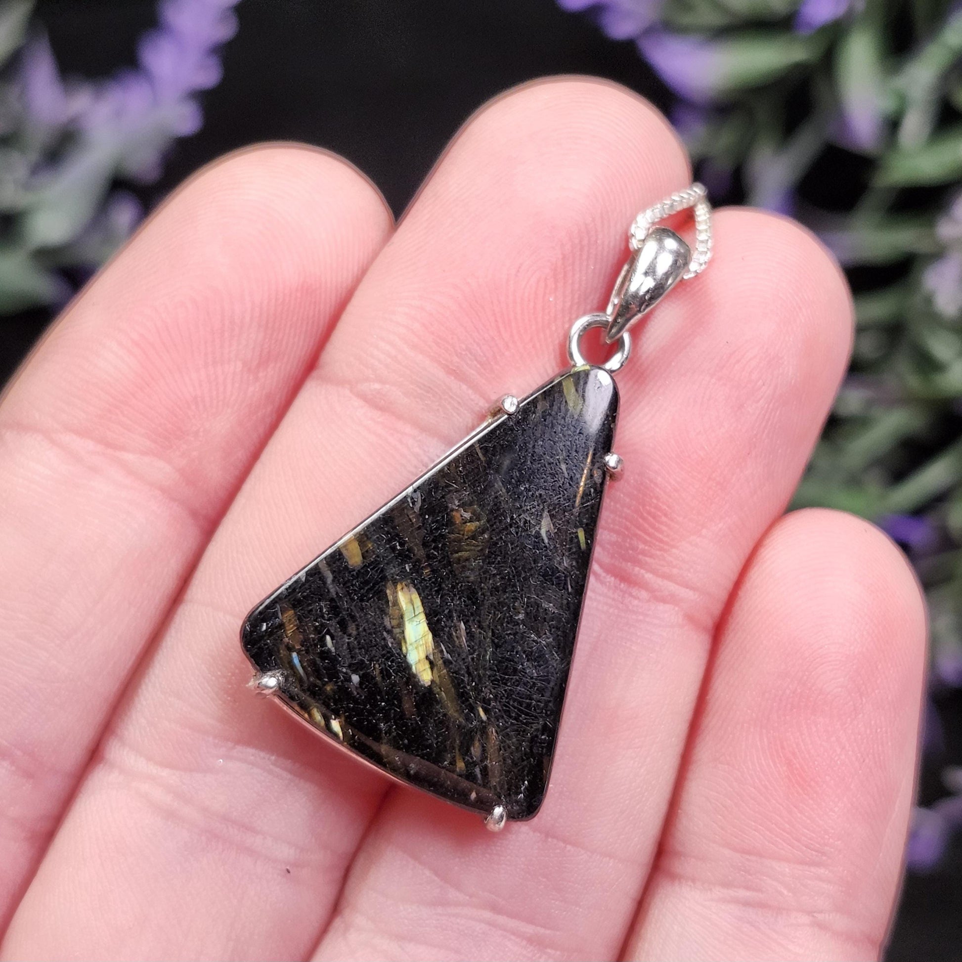 This highly polished Nuummite crystal is from Greenland and exhibits flecks of labradorescence that catch and reflect light. This crystal has been custom created into a sturdy piece of jewelry using .925 Sterling Silver. This pendant measures approximately 35mm by 19mm. The silver chain used in the photos is to help envision how this pendant will look while adorned but is not included in the listing.