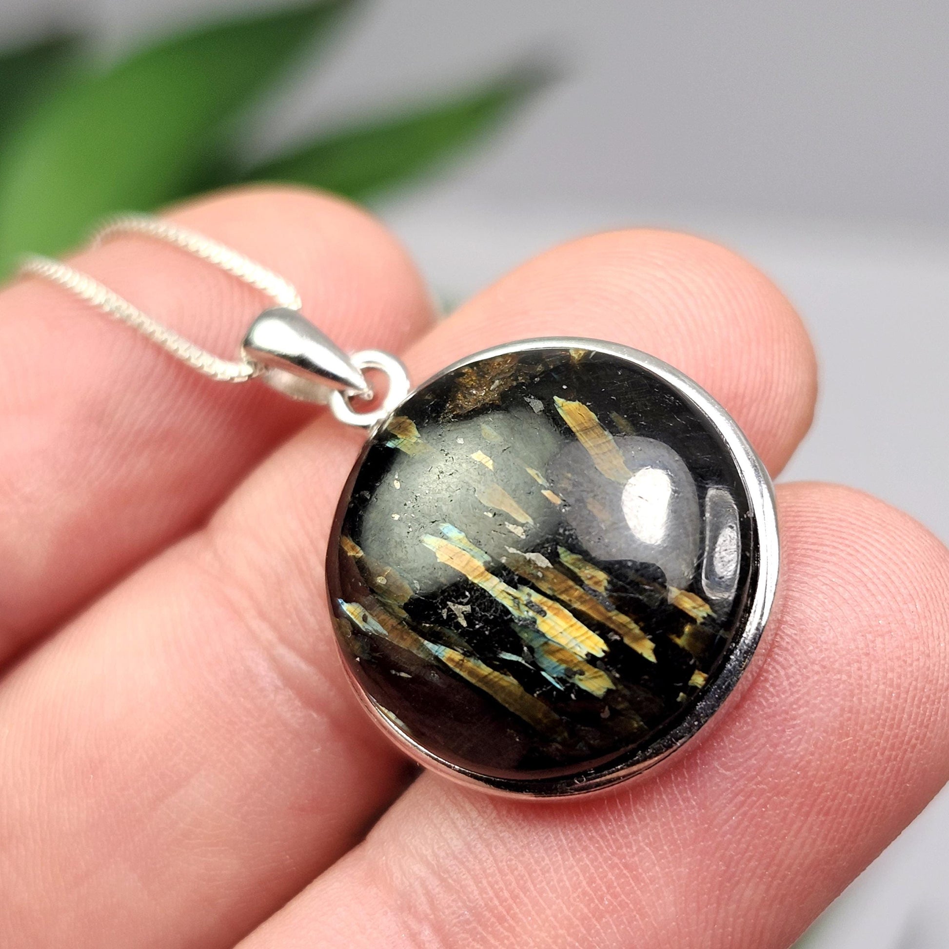 This highly polished Nuummite crystal is from Greenland and exhibits flecks of labradorescence that catch and reflect light. This crystal has been custom created into a sturdy piece of jewelry using .925 Sterling Silver. This pendant measures approximately 26mm by 18mm. The silver chain used in the photos is to help envision how this pendant will look while adorned but is not included in the listing.