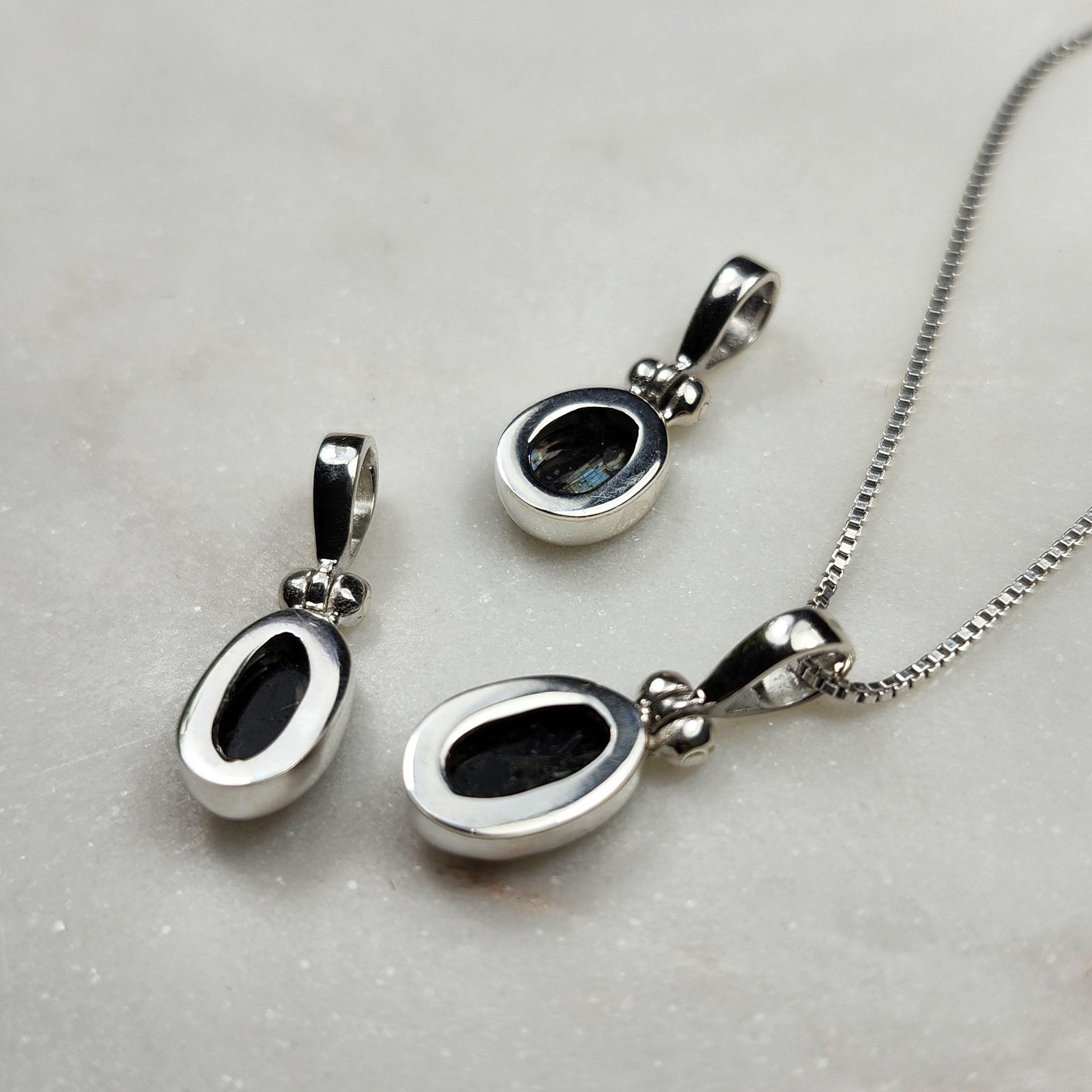 These high grade Nuummite crystals are from Greenland and exhibit classic flecks of labradorescence. They have been carved and polished into petite, faceted cabochons. Each crystal has been handpicked and processed into an intentional piece of jewelry using sterling silver. Each pendant measures approximately 10mm by 6mm - these measurements are meant to give a general idea of size; the actual dimensions of the pendant you receive may vary slightly. The silver chain used in the photos is to help envision how this pendant will look while adorned but is not included in the listing.