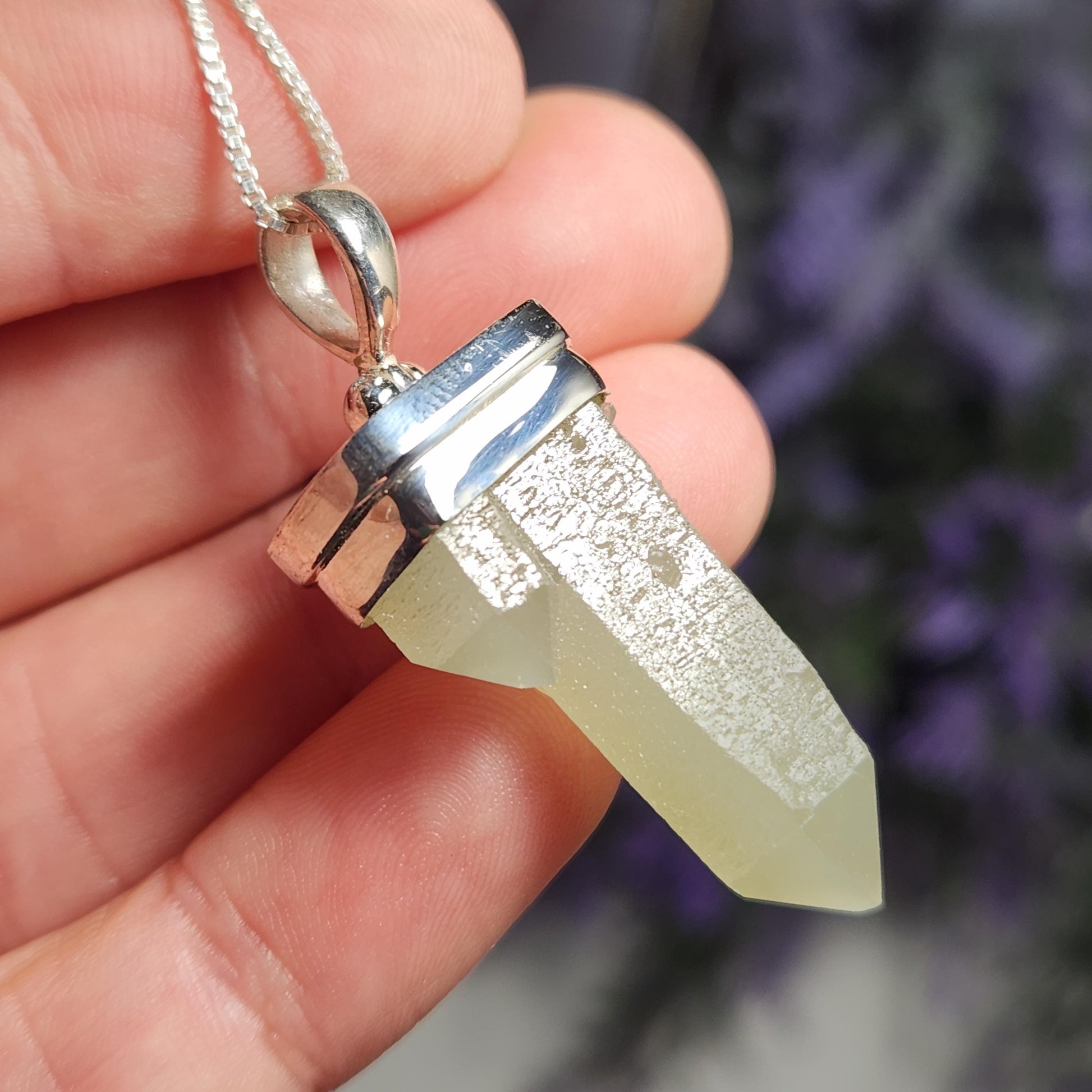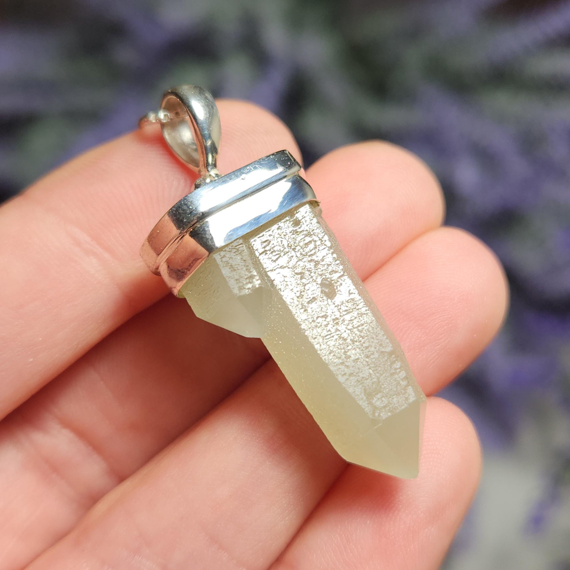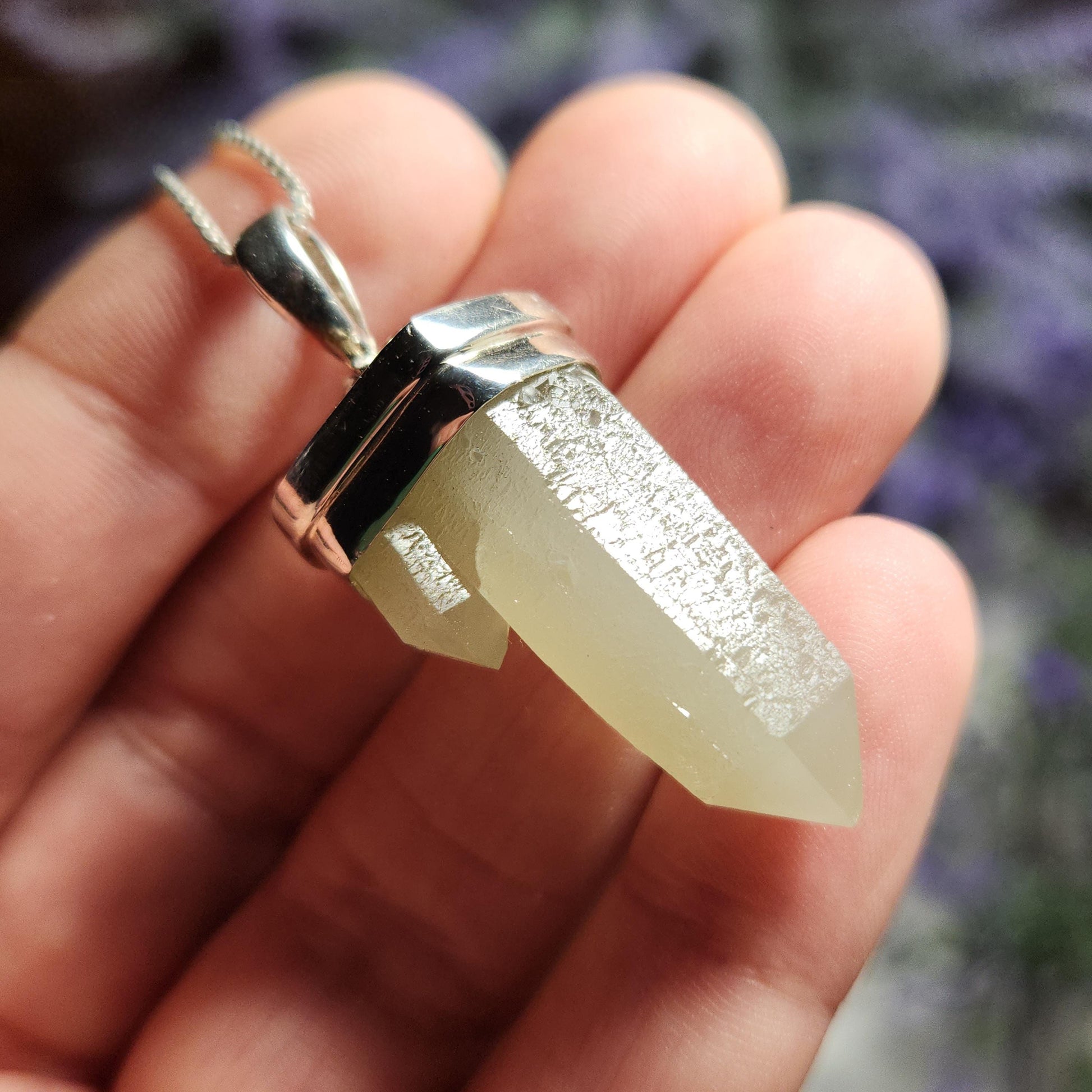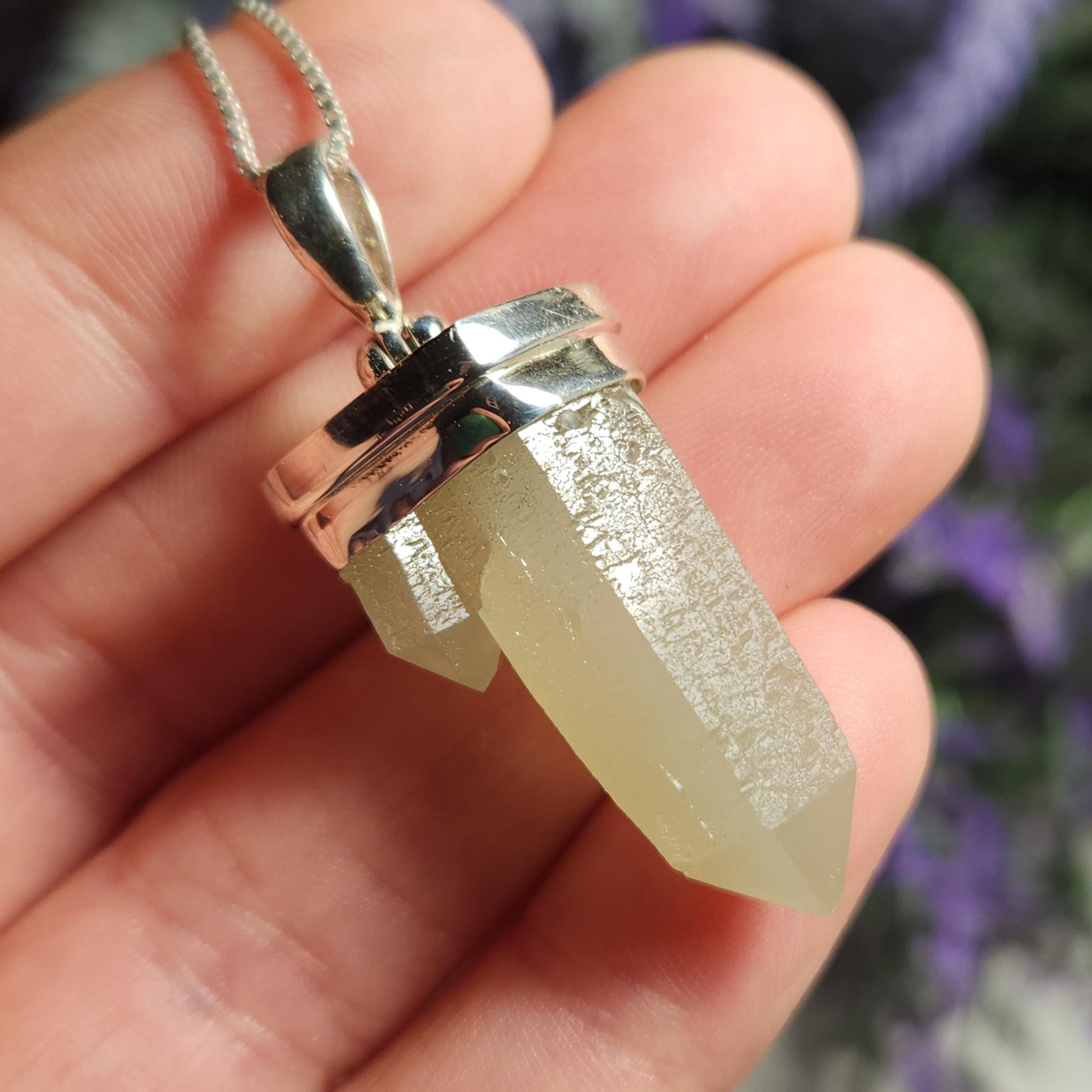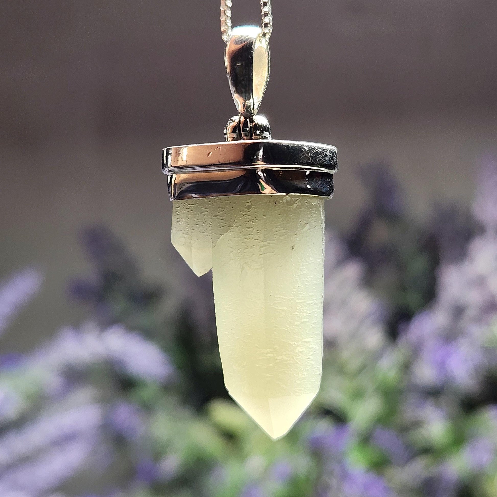 This Hedenbergite included Quartz is from a small lot from the classic Huanggong mine. This terminated crystal has a light sage green coloring with a lustrous, etched surface and is accompanied by a smaller crystal termination. This crystal has been custom created into sturdy piece of jewelry using .925 Sterling Silver. This pendant measures approximately 40mm by 15mm. The silver chain used in the photos is to help envision how this pendant will look while adorned but is not included in the listing.