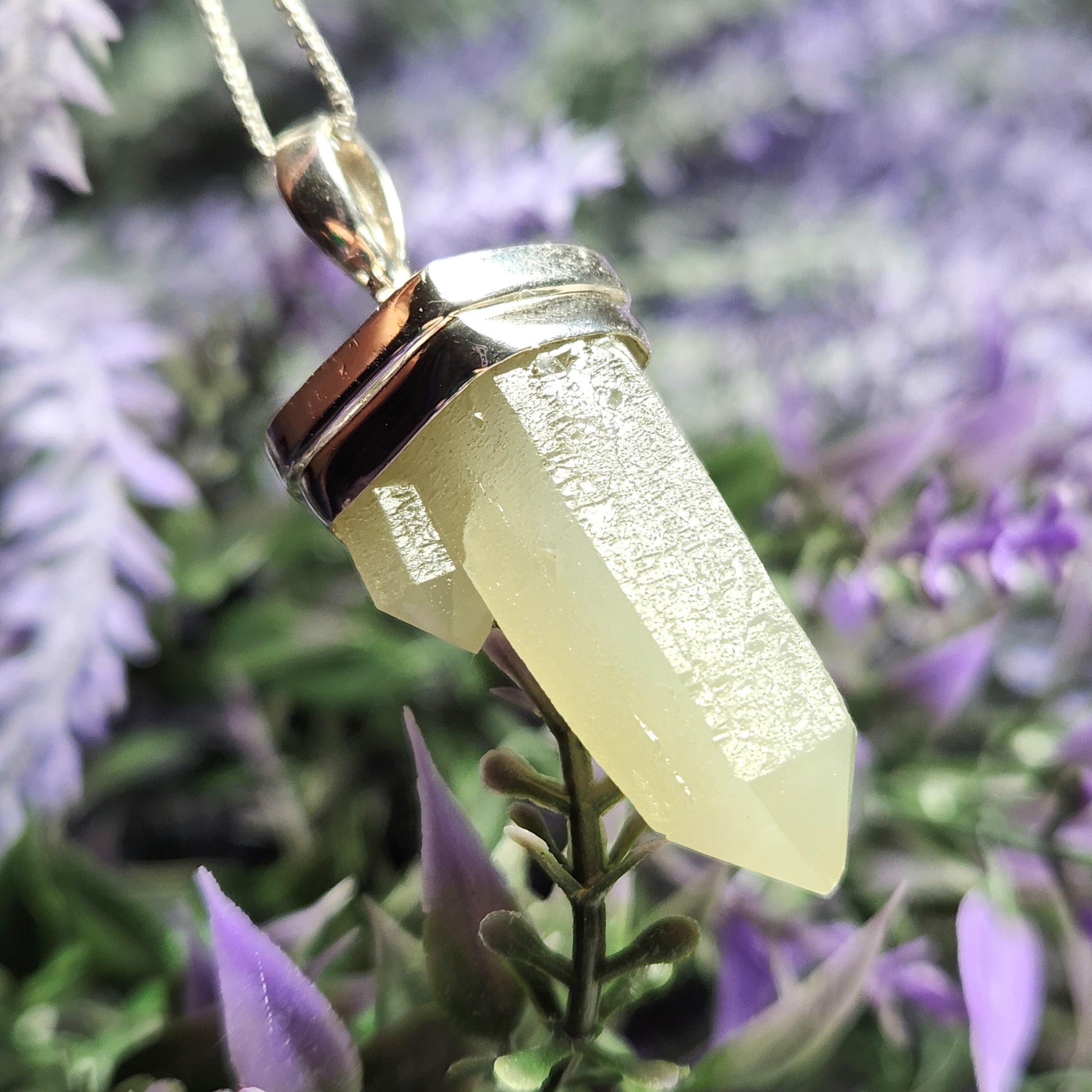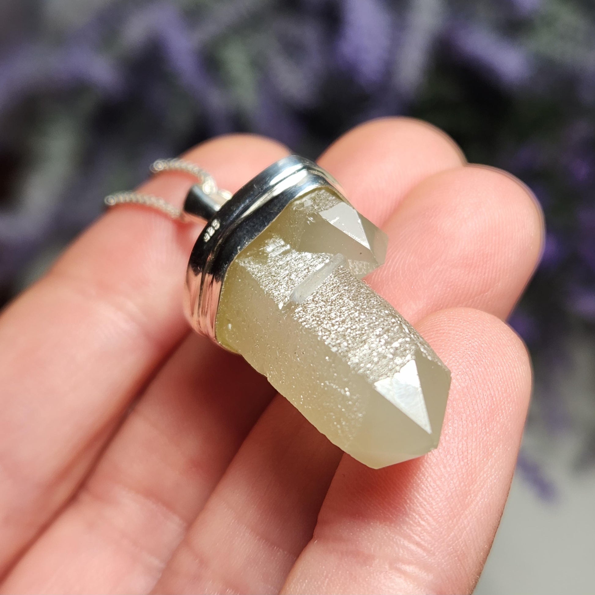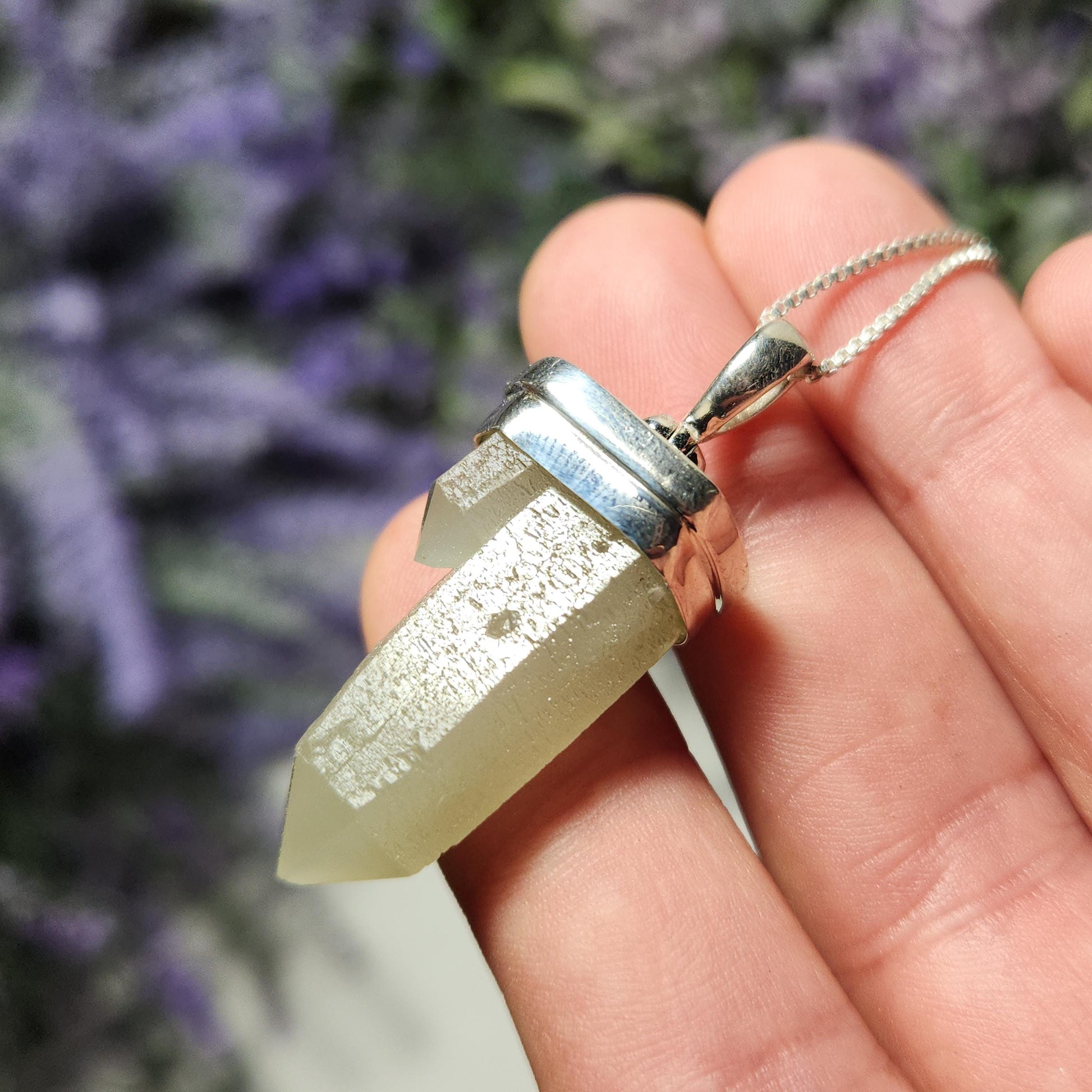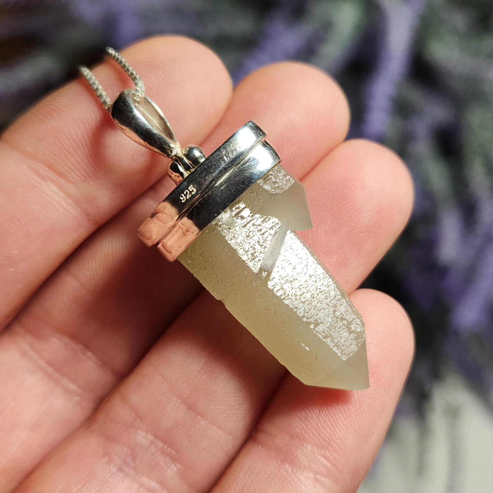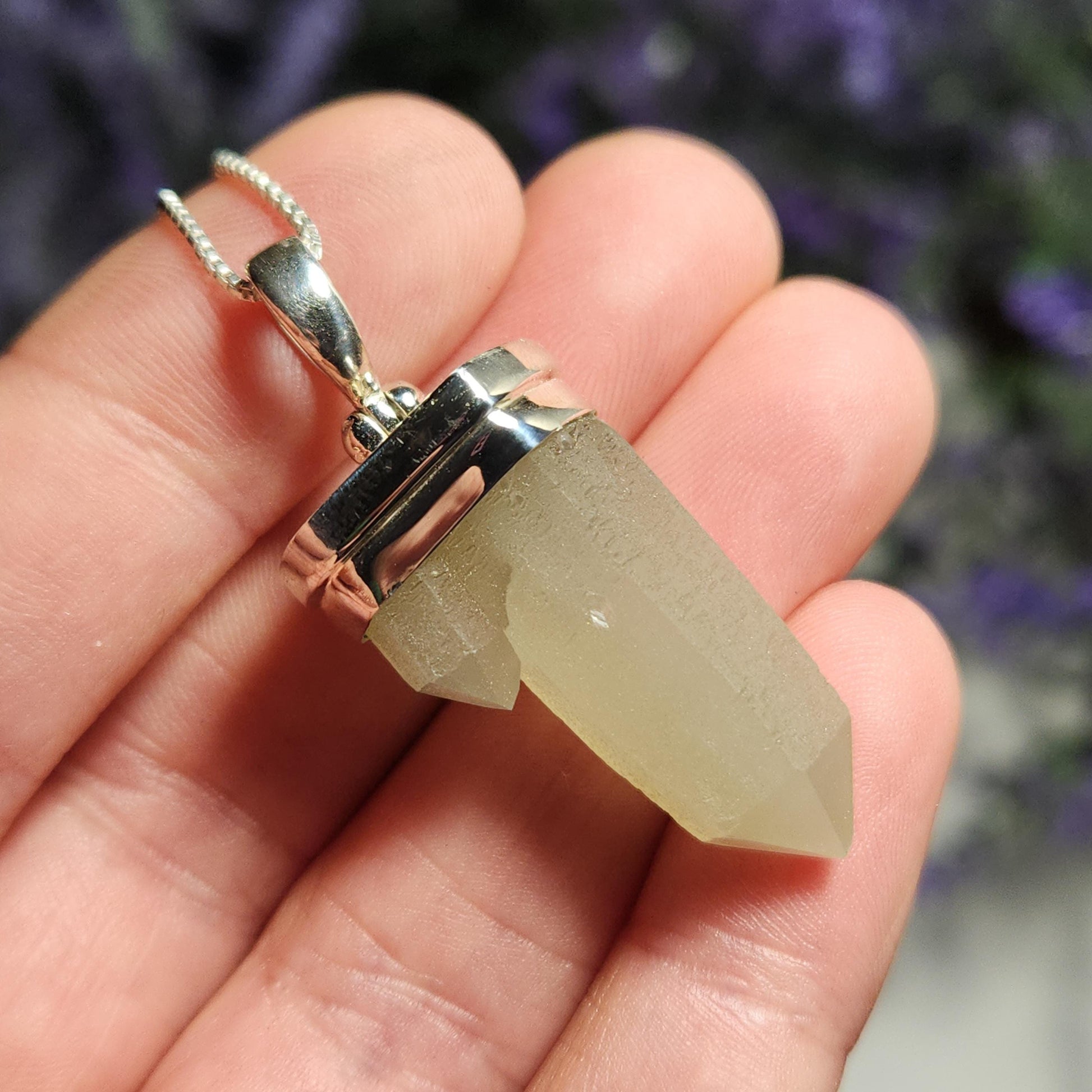 This Hedenbergite included Quartz is from a small lot from the classic Huanggong mine. This terminated crystal has a light sage green coloring with a lustrous, etched surface and is accompanied by a smaller crystal termination. This crystal has been custom created into sturdy piece of jewelry using .925 Sterling Silver. This pendant measures approximately 40mm by 15mm. The silver chain used in the photos is to help envision how this pendant will look while adorned but is not included in the listing.