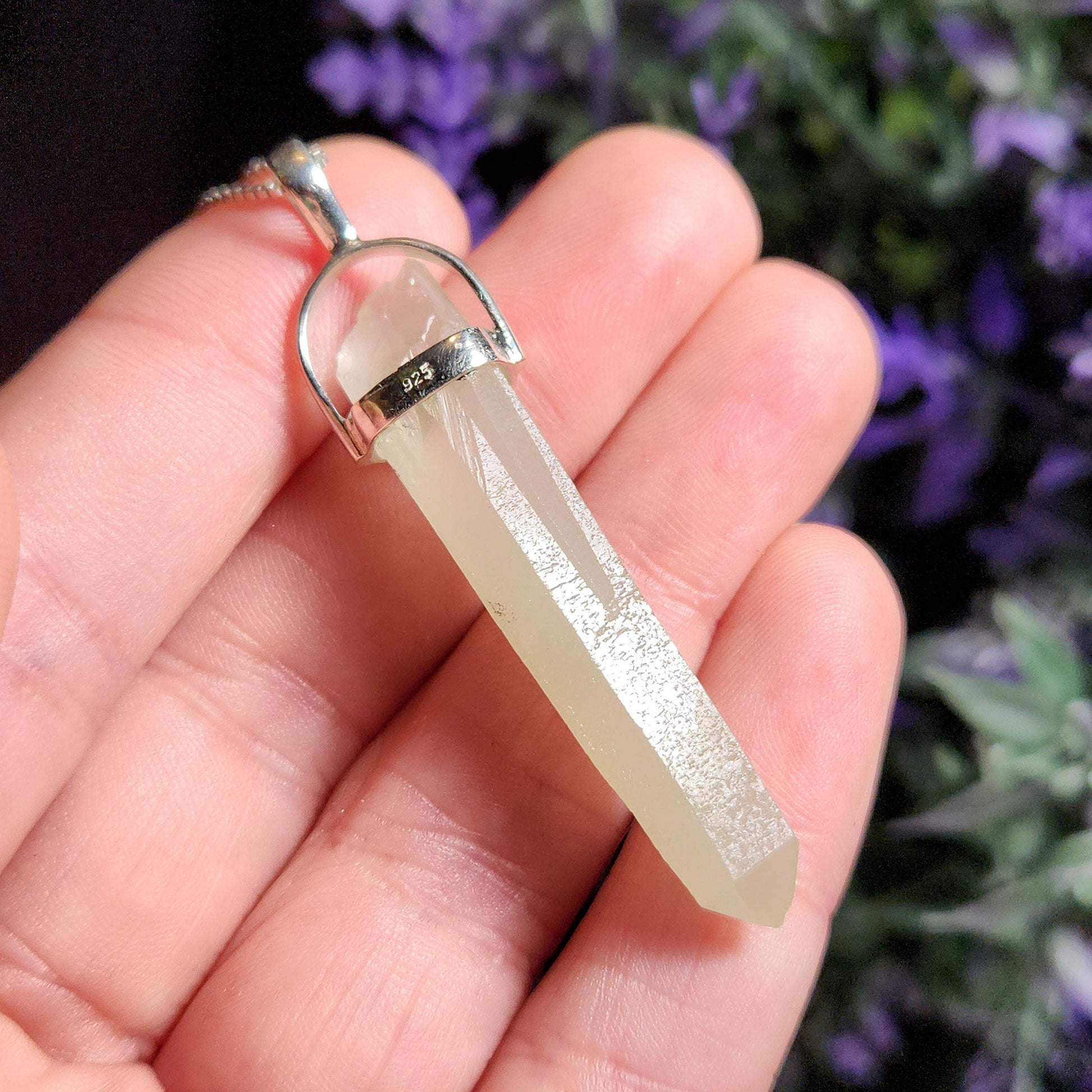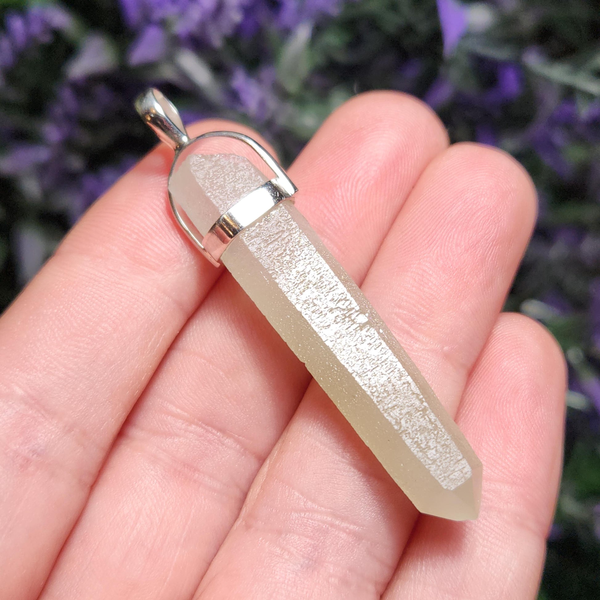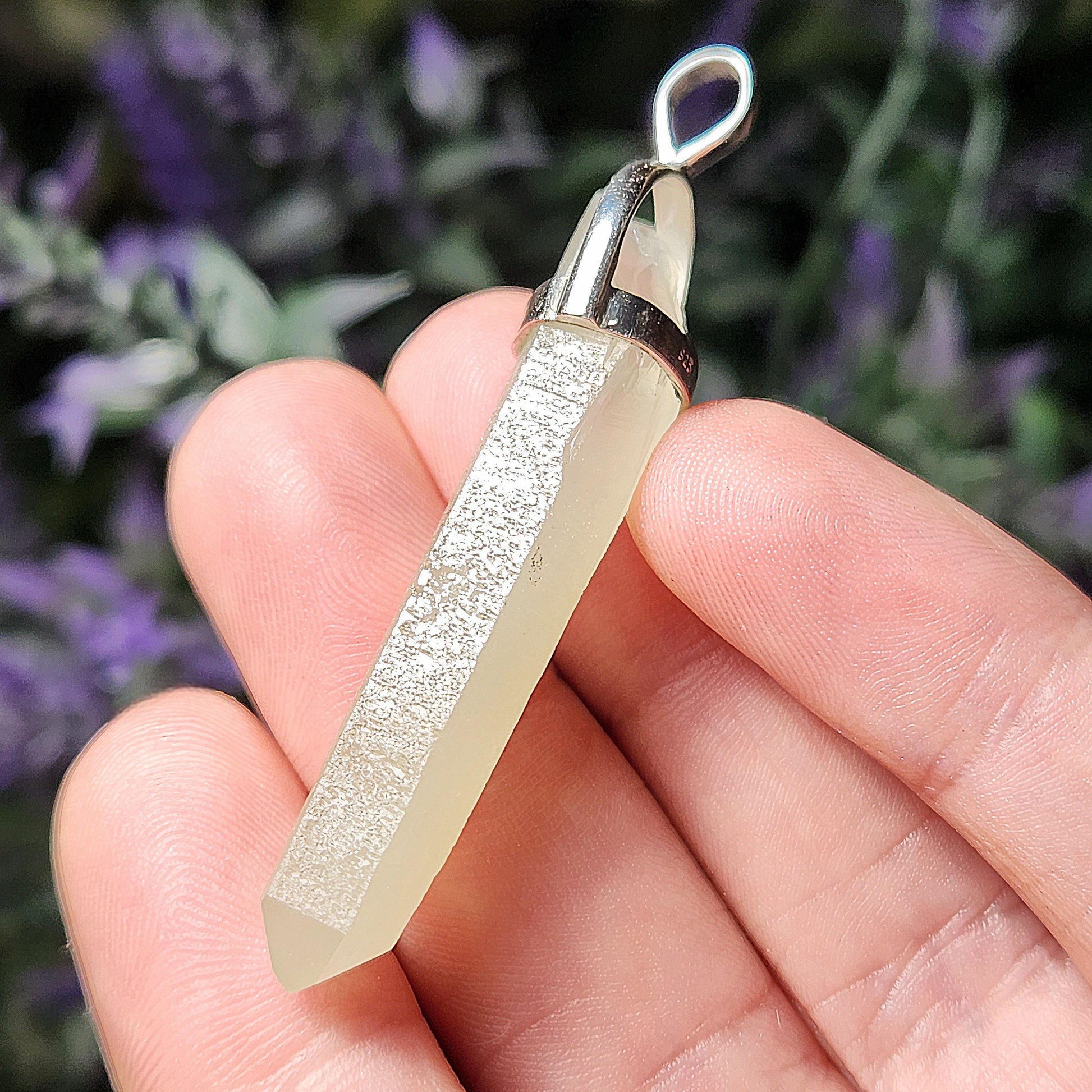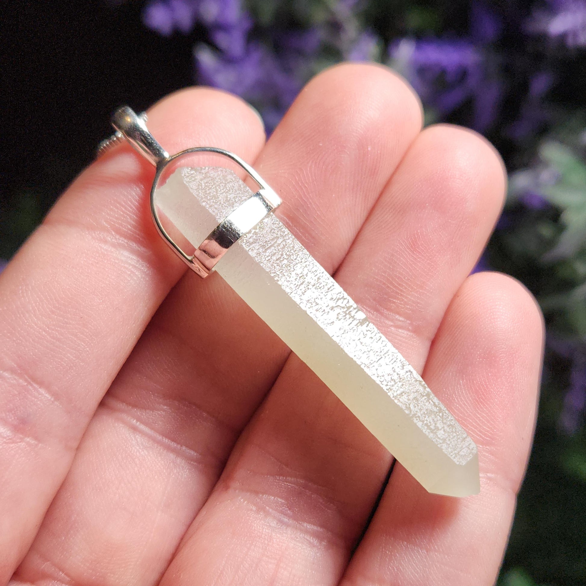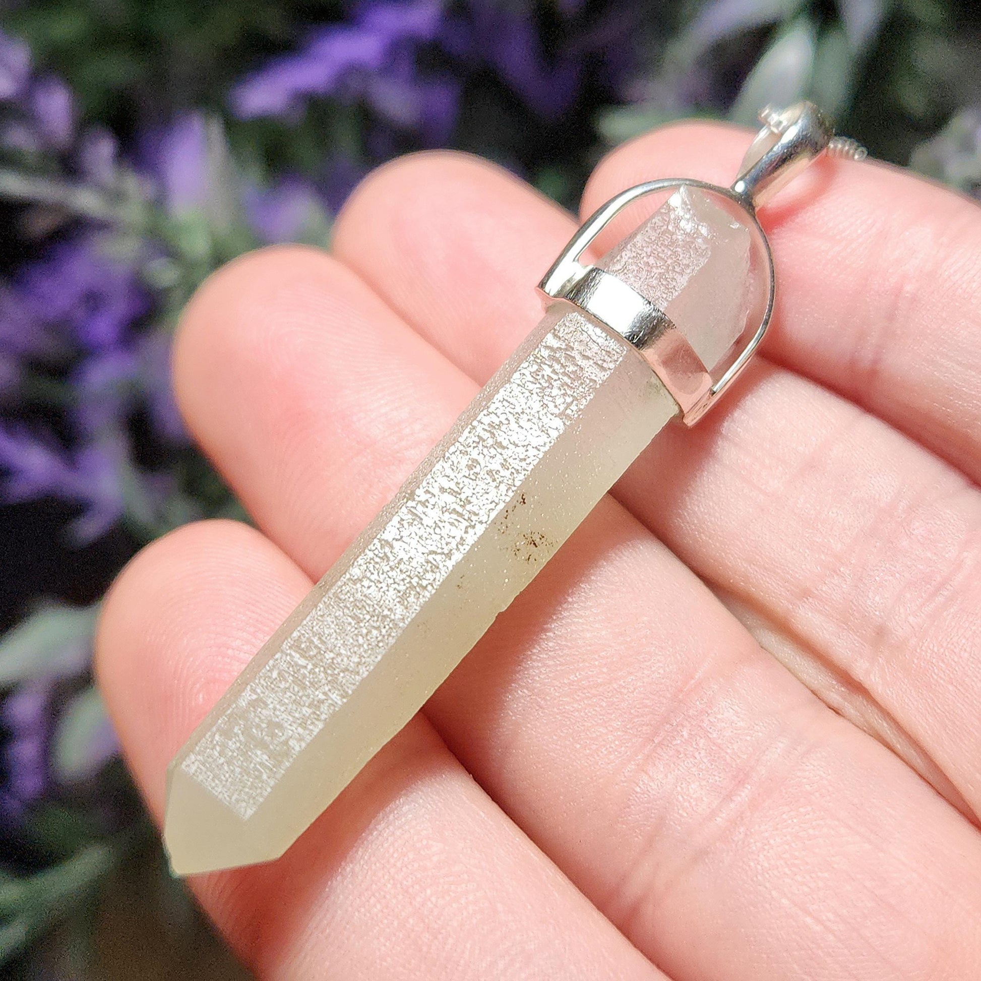 This Hedenbergite included Quartz is from a small lot from the classic Huanggong mine. This terminated crystal has a light sage green coloring with a lustrous, etched surface. This crystal has been custom created into sturdy piece of jewelry using .925 Sterling Silver. This pendant measures approximately 55mm by 11mm. The silver chain used in the photos is to help envision how this pendant will look while adorned but is not included in the listing.