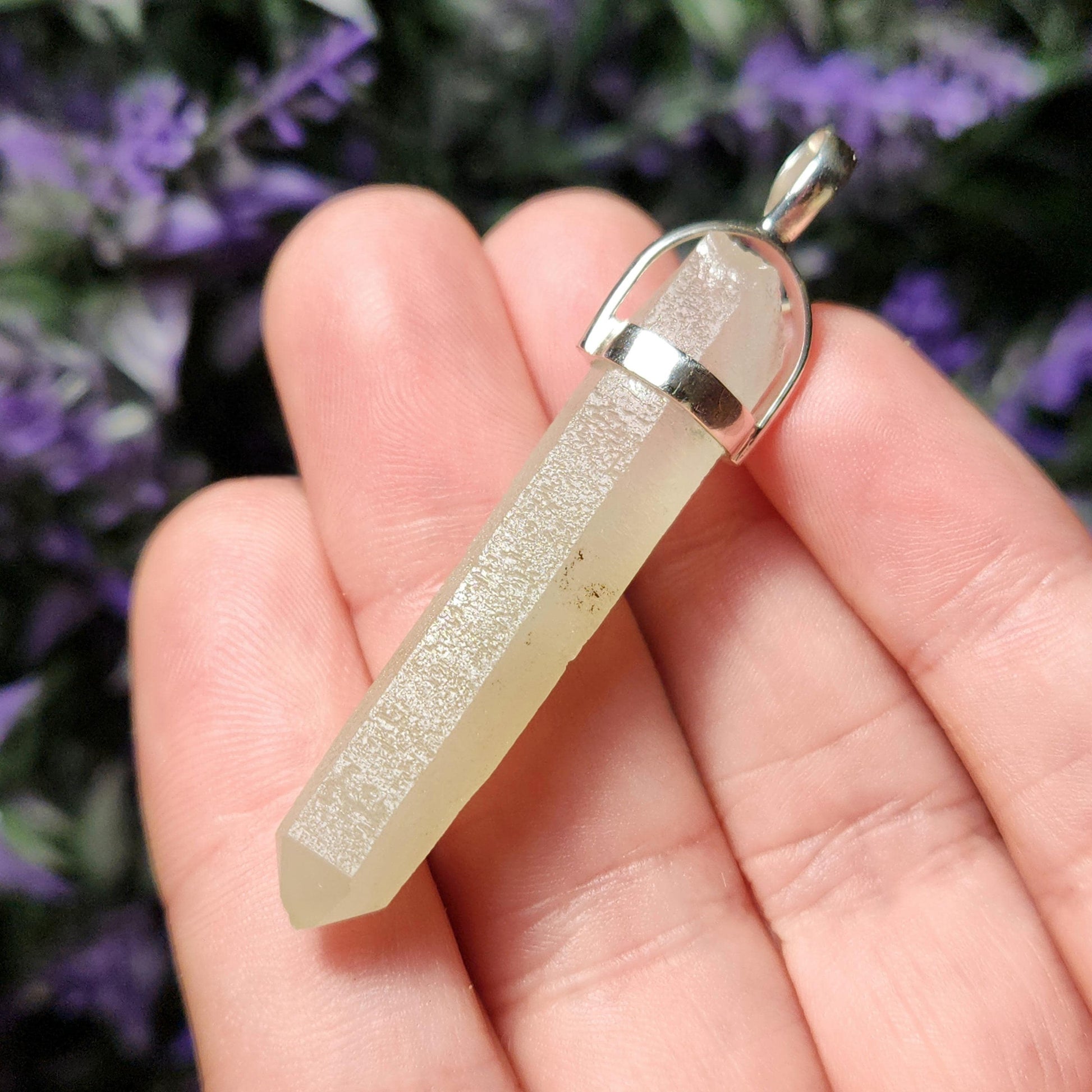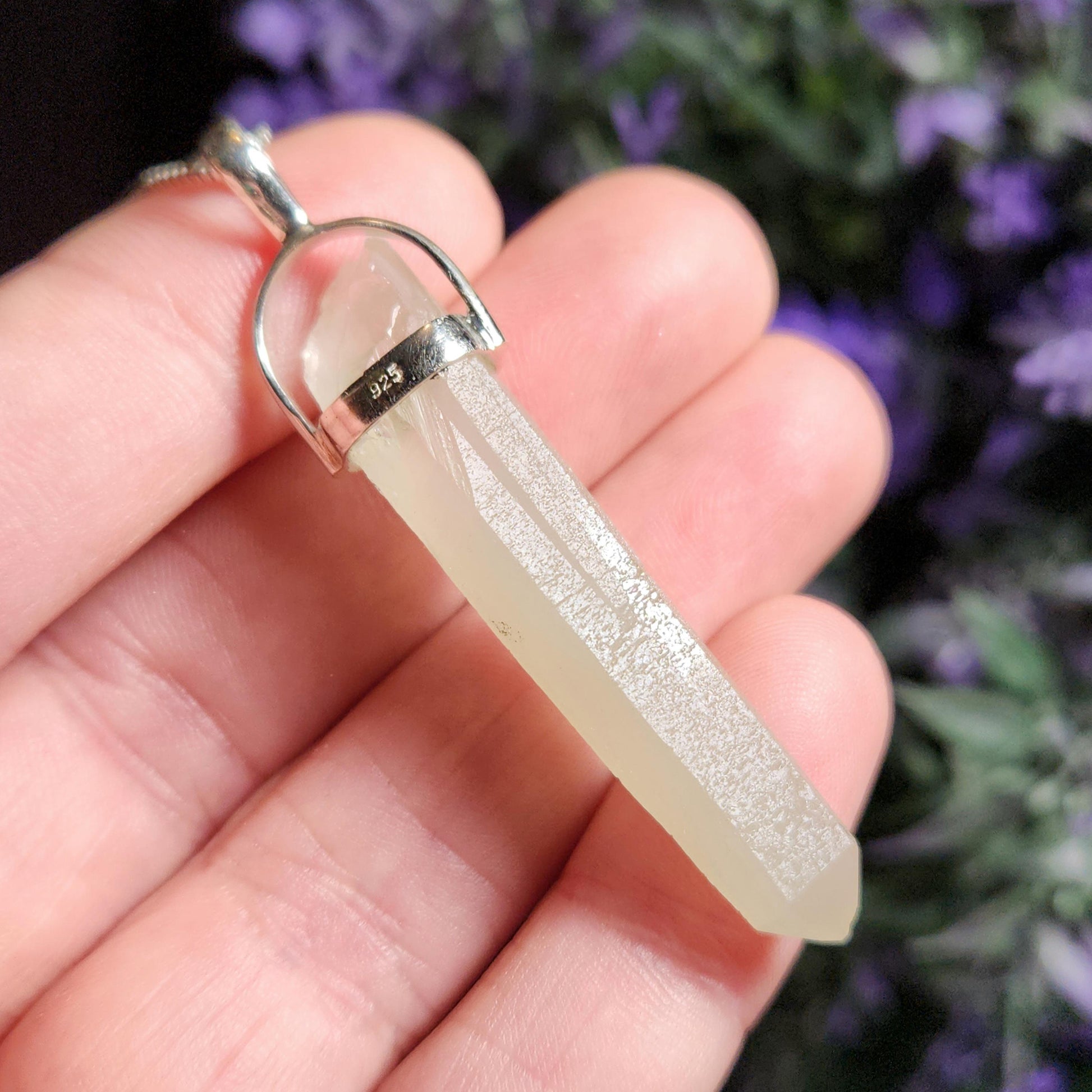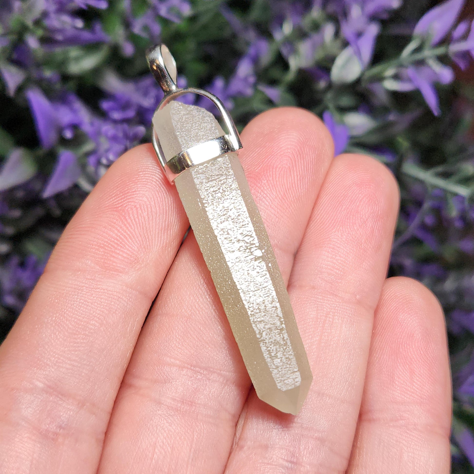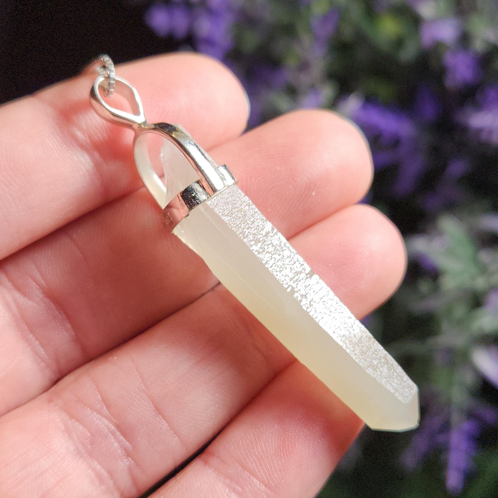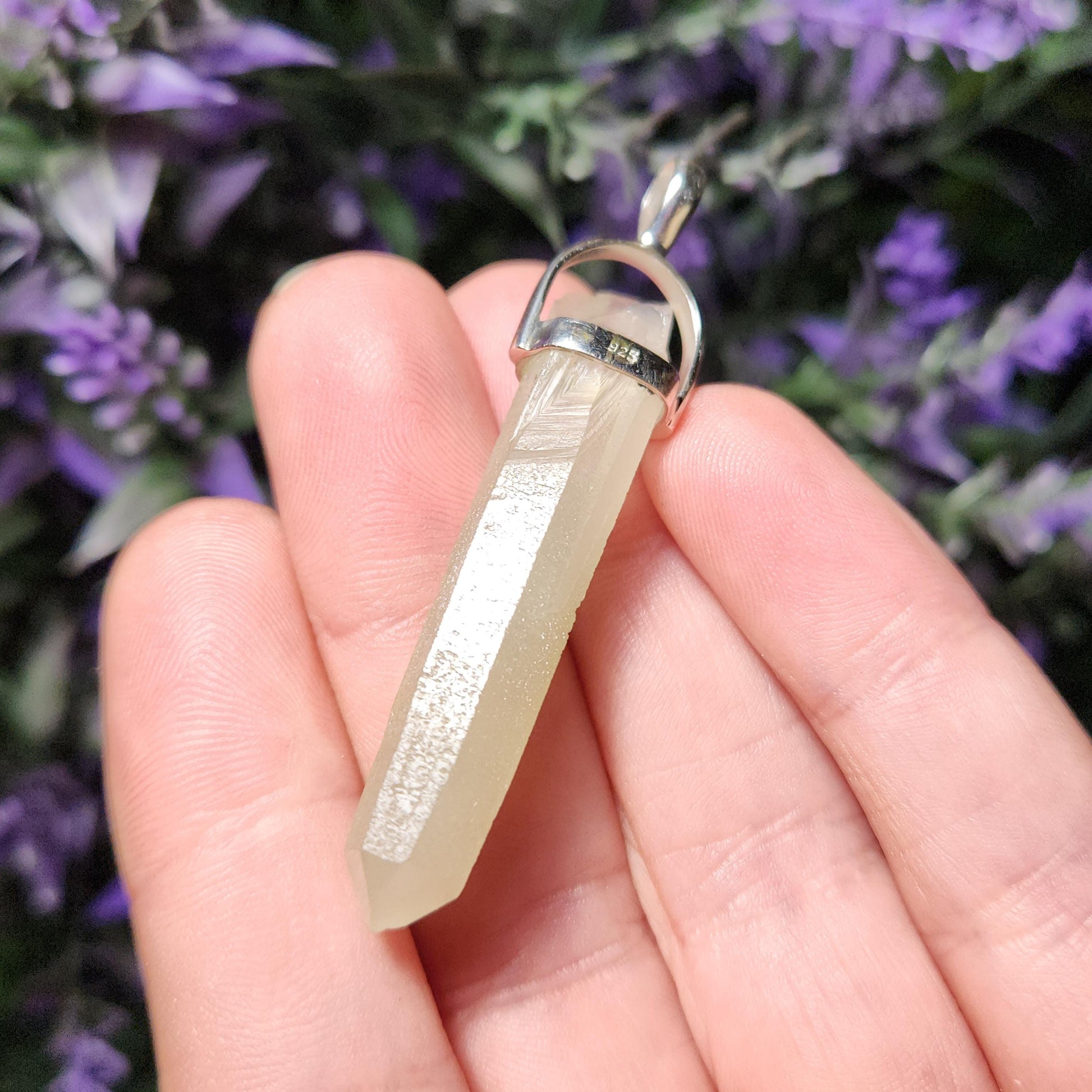 This Hedenbergite included Quartz is from a small lot from the classic Huanggong mine. This terminated crystal has a light sage green coloring with a lustrous, etched surface. This crystal has been custom created into sturdy piece of jewelry using .925 Sterling Silver. This pendant measures approximately 55mm by 11mm. The silver chain used in the photos is to help envision how this pendant will look while adorned but is not included in the listing.