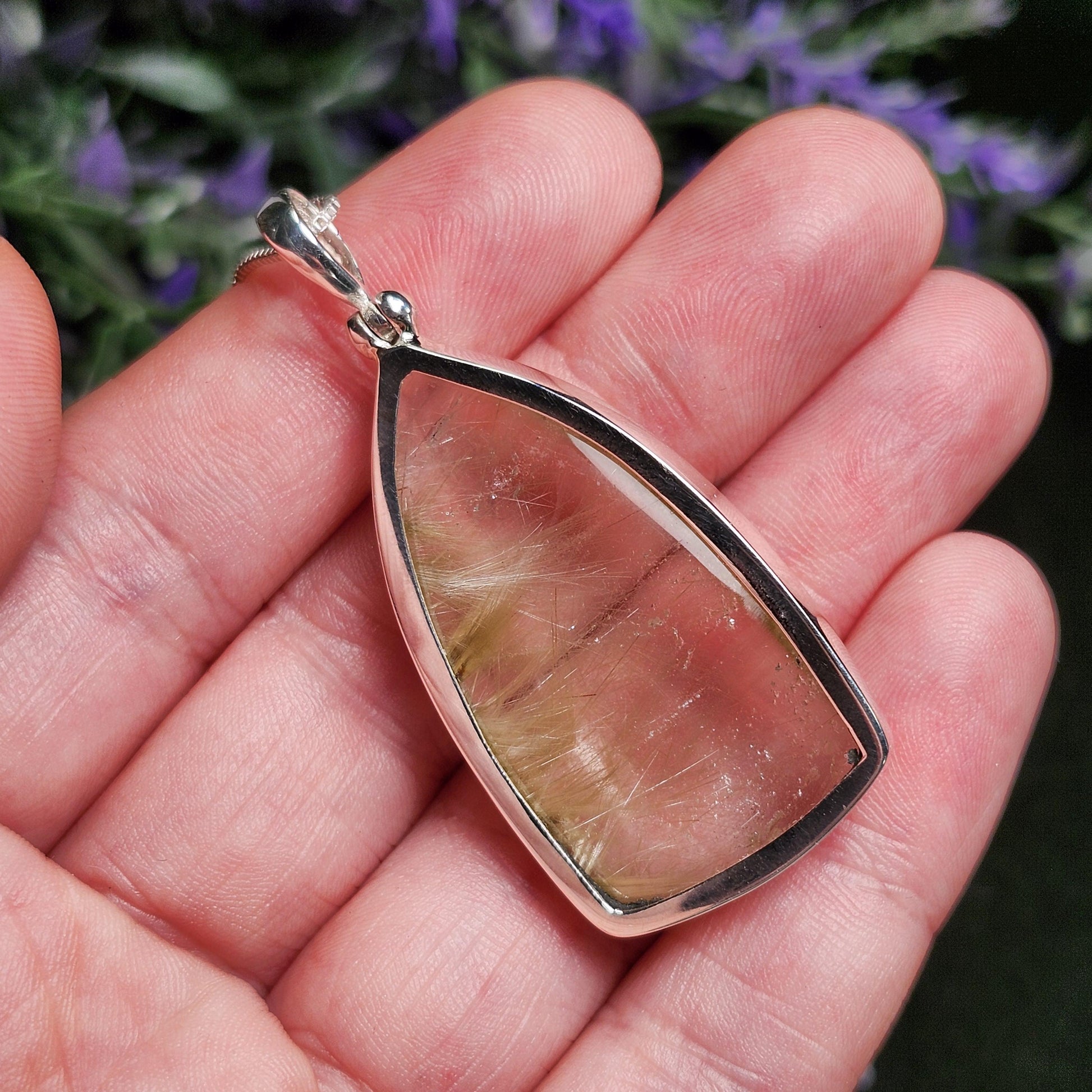 This Quartz crystal from Brazil has been cut into a cabochon and highly polished to showcase the angel hair golden Rutile and silver Hematite inclusions within its clear depths. This crystal has been handpicked and processed into an intentional piece of jewelry using .925 Sterling Silver by Lauren and her jewelers at Infinite Spiral Gems. This pendant measures approximately 50mm by 22mm. The silver chain used in the photos is to help envision how this pendant will look while adorned but is not included in the listing.