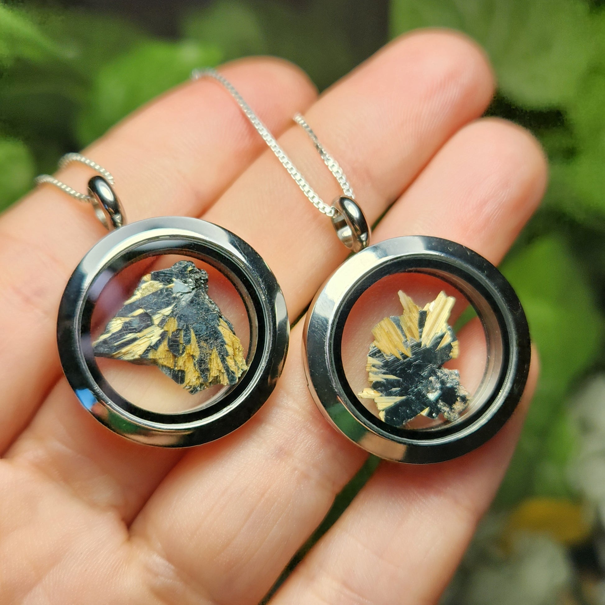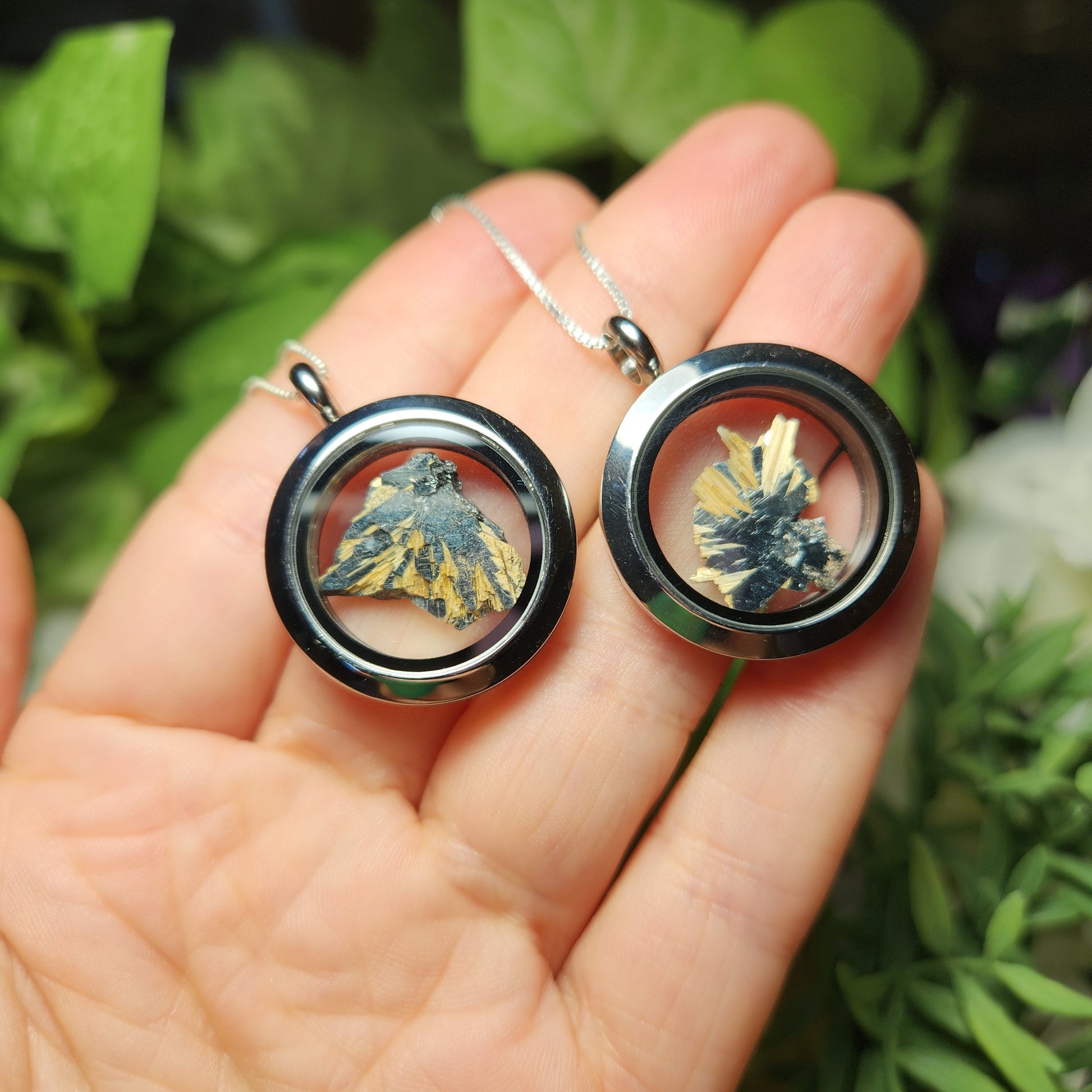These shining silver Hematite specimens showcase burst of golden Rutile. These gemstones are gently nestled inside of a high-quality, stainless-steel locket. These lockets are assembled with two pieces that connect with a threaded screw attachment. We recommend securing the attachments with a dab of epoxy for a more permanent option. Each pendant measures approximately 32mm by 25mm. The silver chain used in the photos is to help envision how this pendant will look while adorned but is not included in the listing - feel free to leave a note for us to include a complimentary cord!