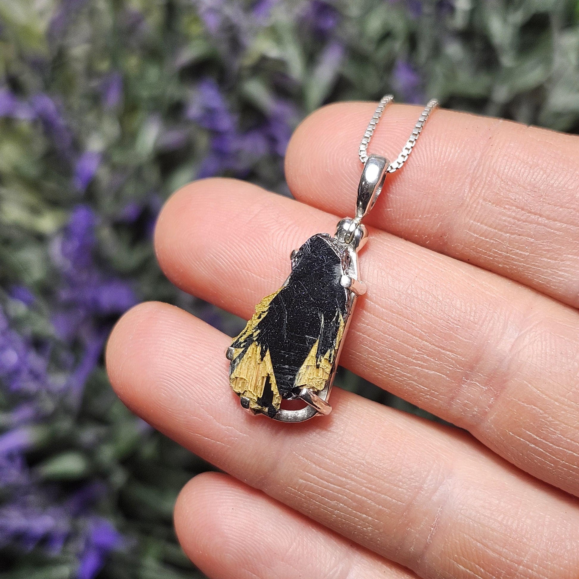 This Hematite has an incredibly high sheen and a deep black color contrasted by sparkling shards of golden Rutile. It has been custom created into sturdy jewelry using .925 Sterling Silver. This pendant measures approximately 30 millimeters by 10 millimeters. The silver chain used in the photos is to help envision how this pendant will look while adorned but is not included in the listing.