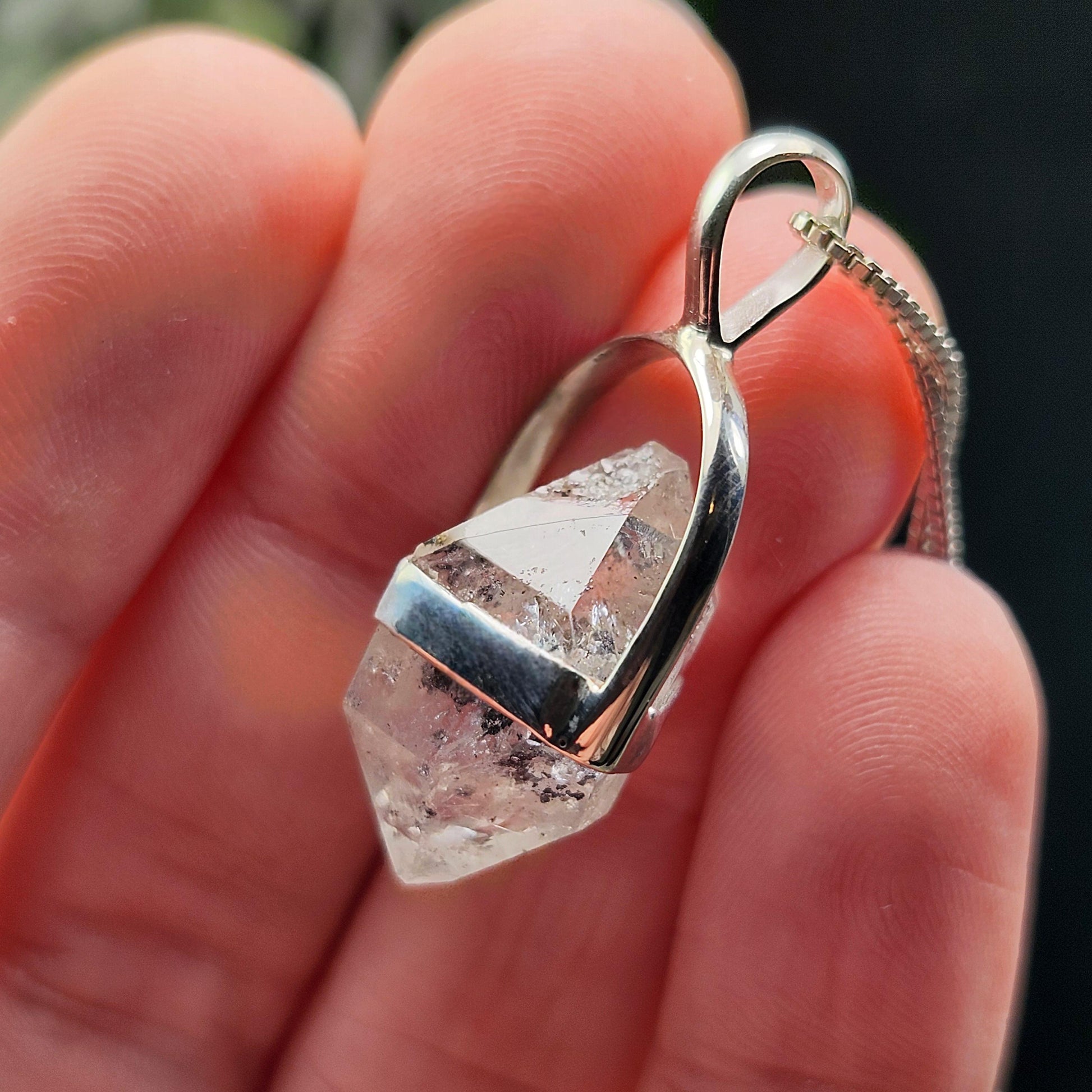 These Herkimer Diamond crystals feature shining facets with distinctly terminated points. Their clarity showcases mineral inclusions within their clear depths. Each crystal has been custom created into a sturdy piece of jewelry using .925 Sterling Silver. Each pendant measures approximately 27mm by 15mm - these measurements are meant to give a general idea of size; the actual dimensions of the pendant you receive may vary slightly. The silver chain used in the photos is to help envision how this pendant will look while adorned but is not included in the listing.