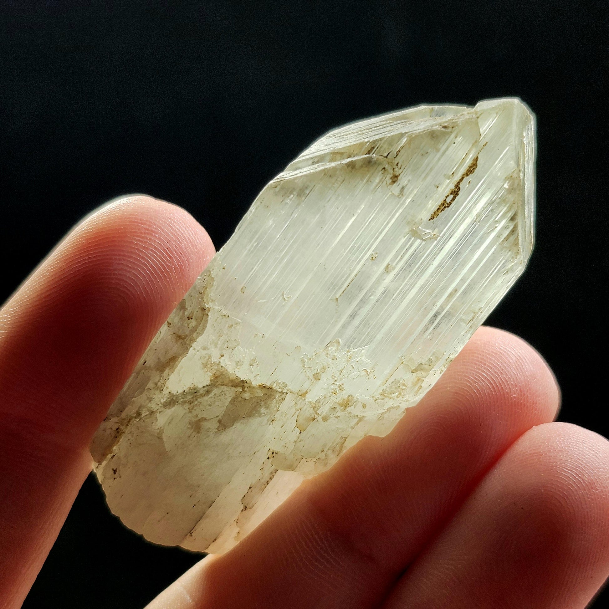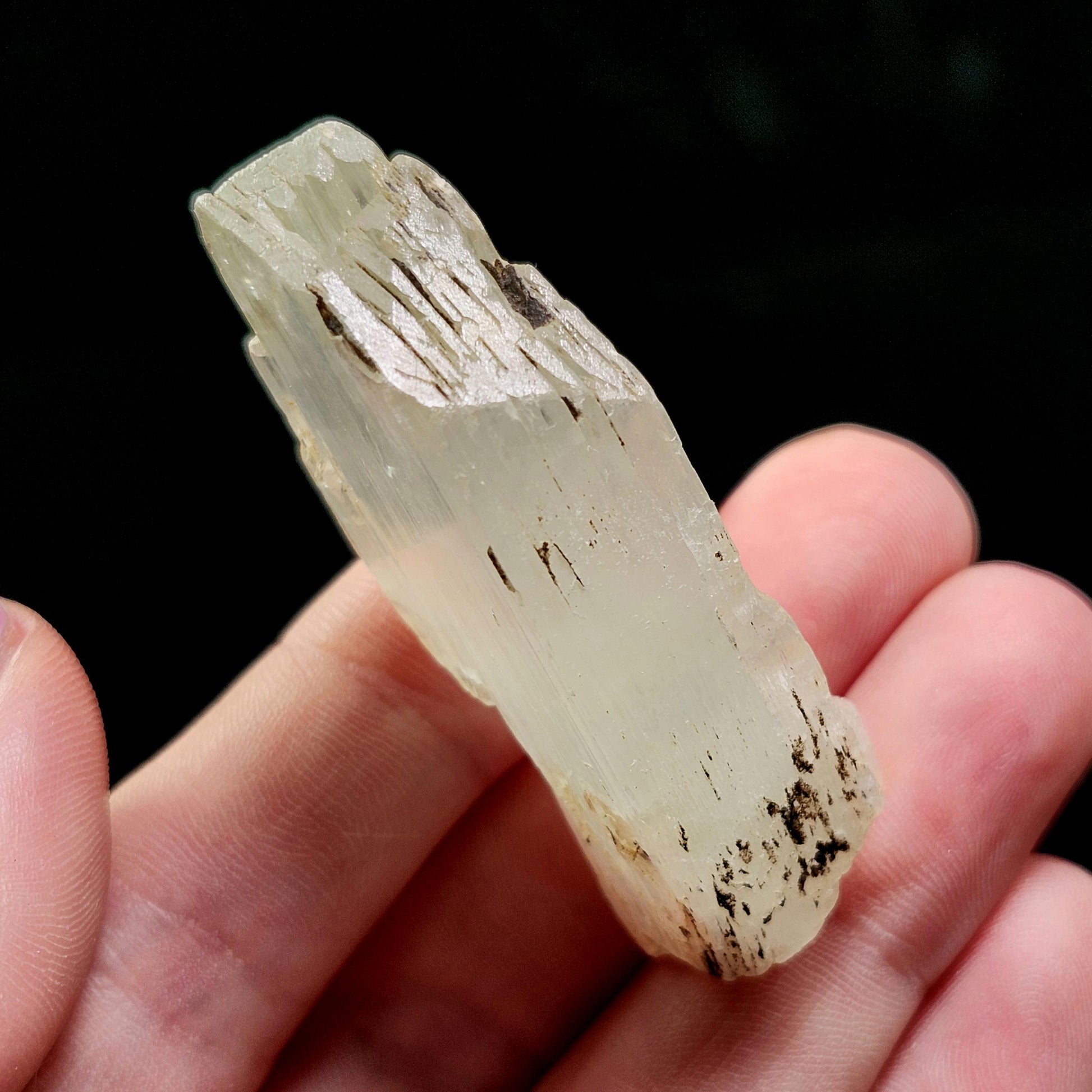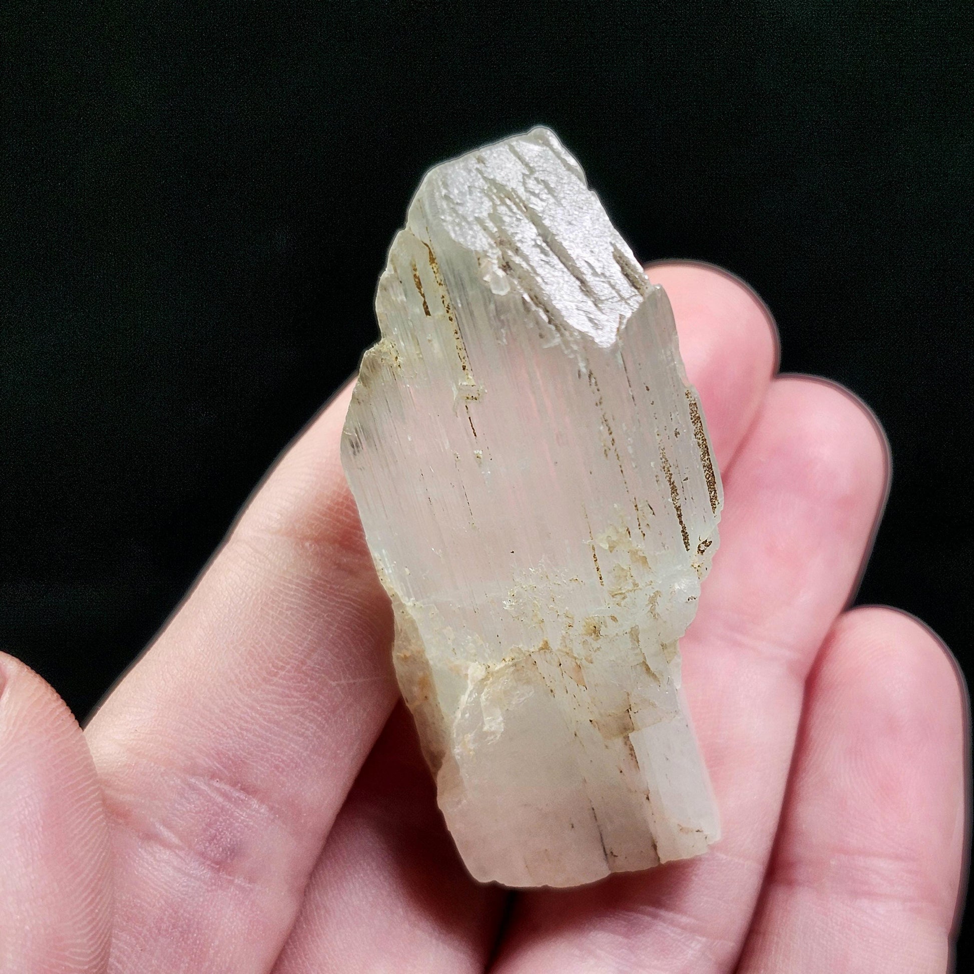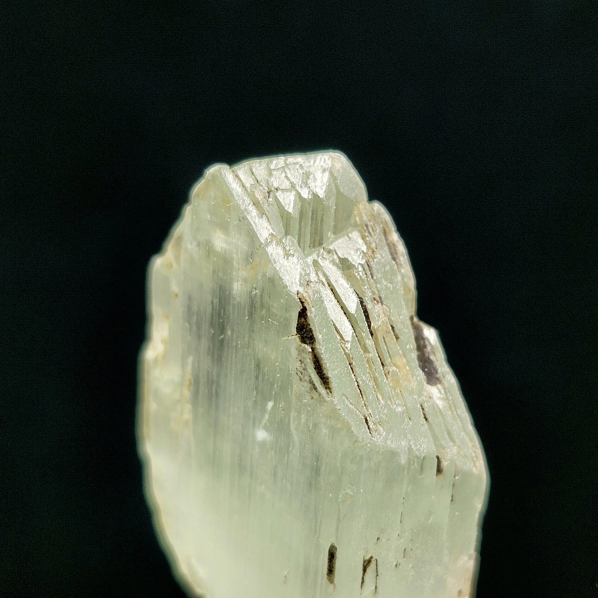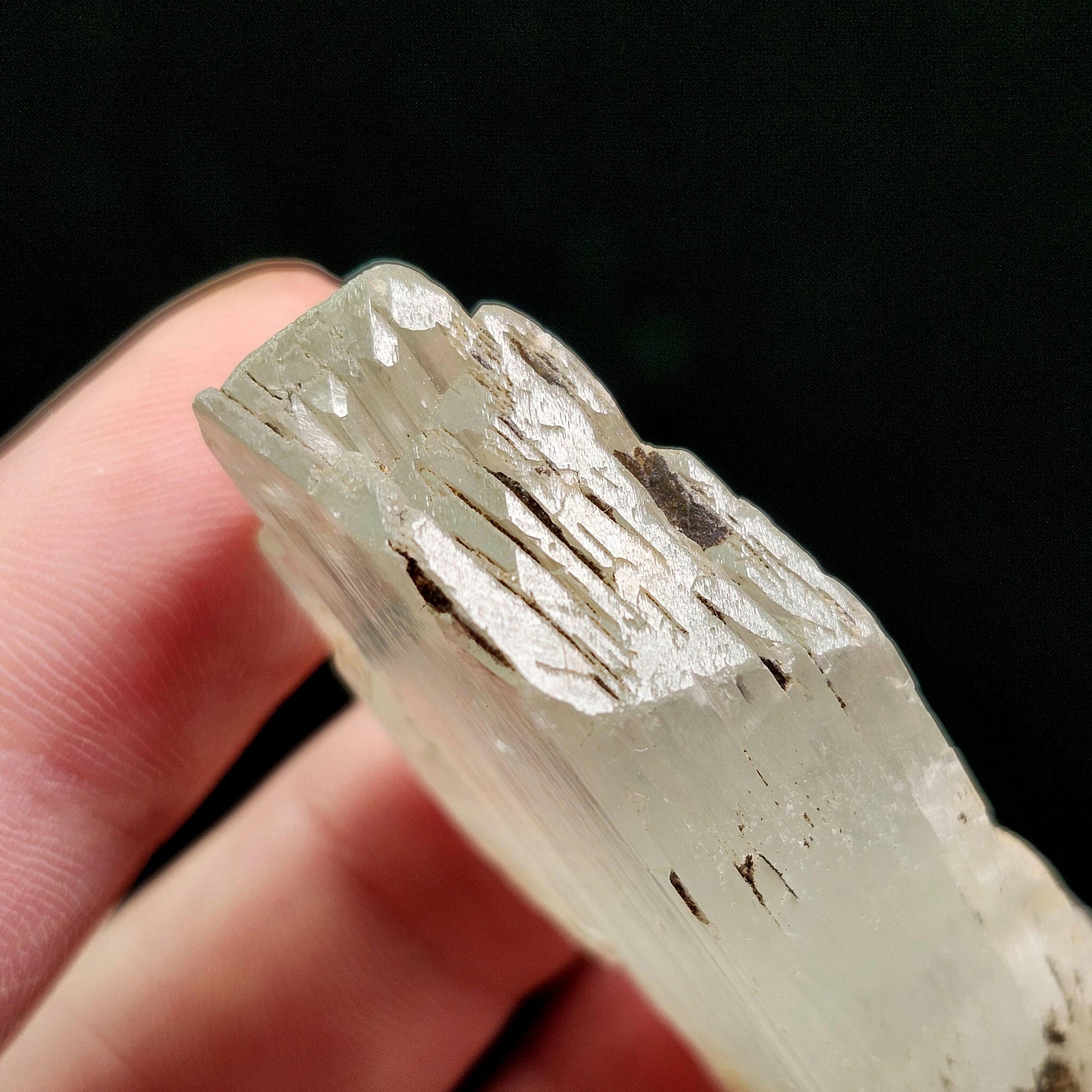 This deeply striated Hiddenite crystal has a very slight, pale green hue and a bright, glowing translucence. It exhibits etching on its naturally terminated point. This specimen measures 50mm by 21mm by 12mm and weighs 29 grams.