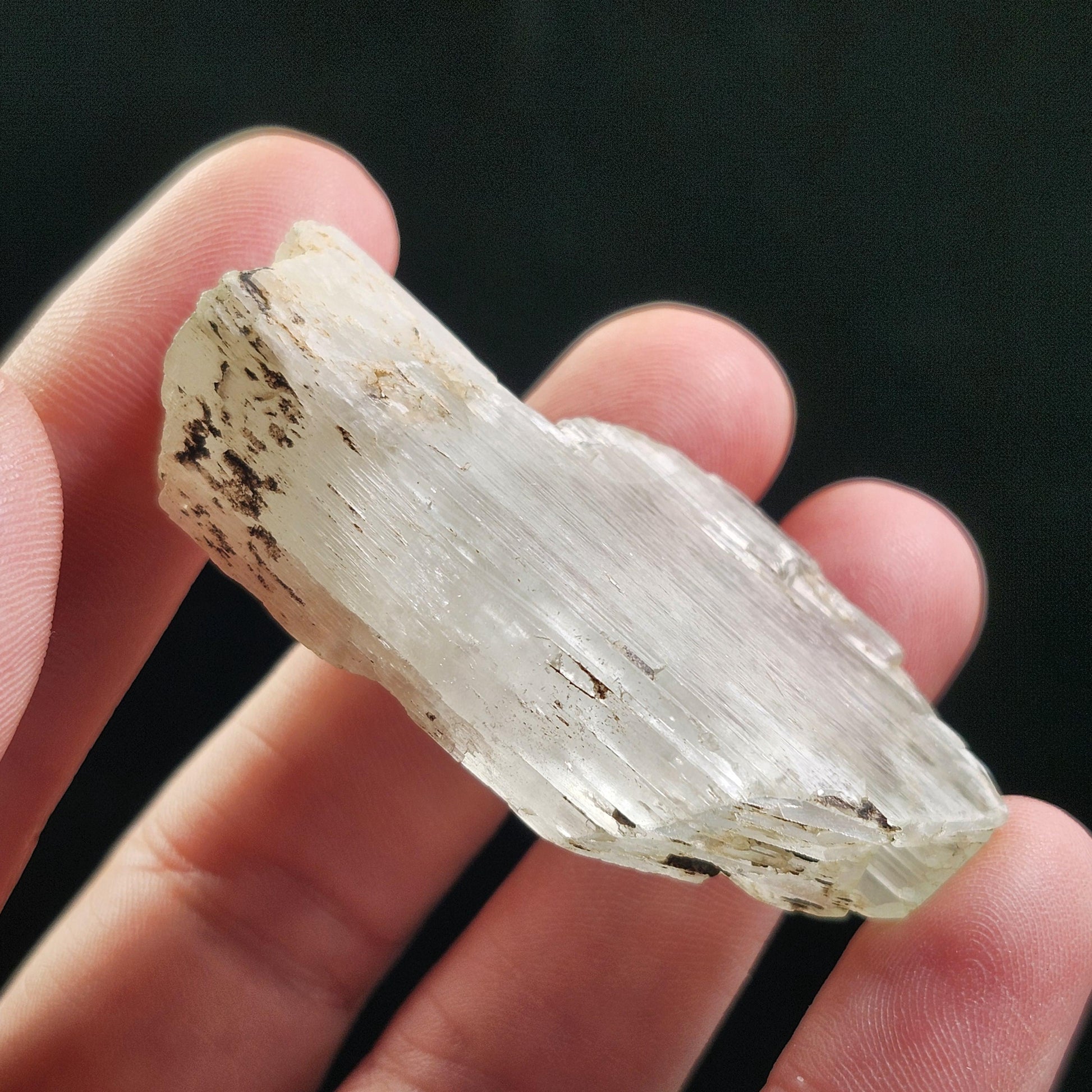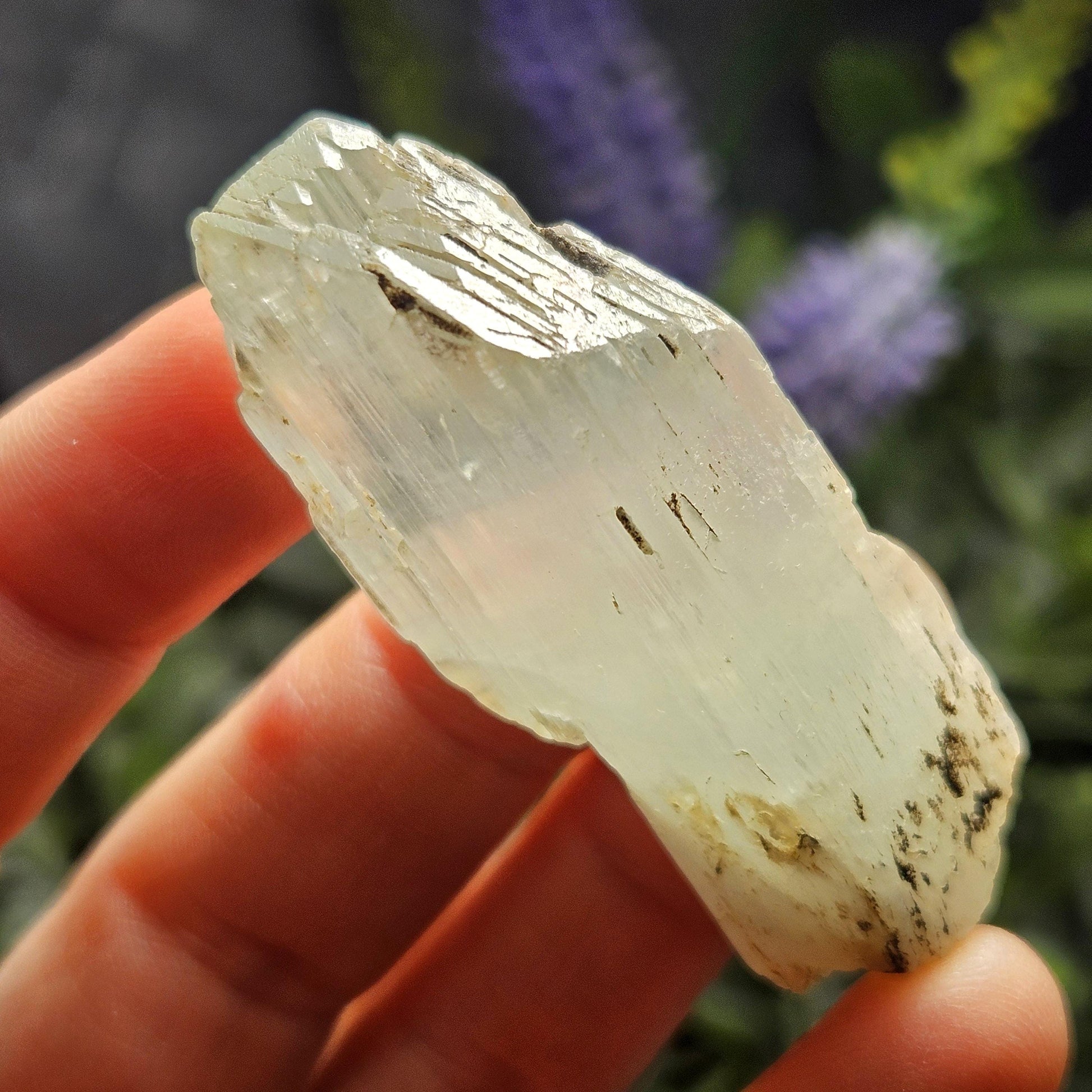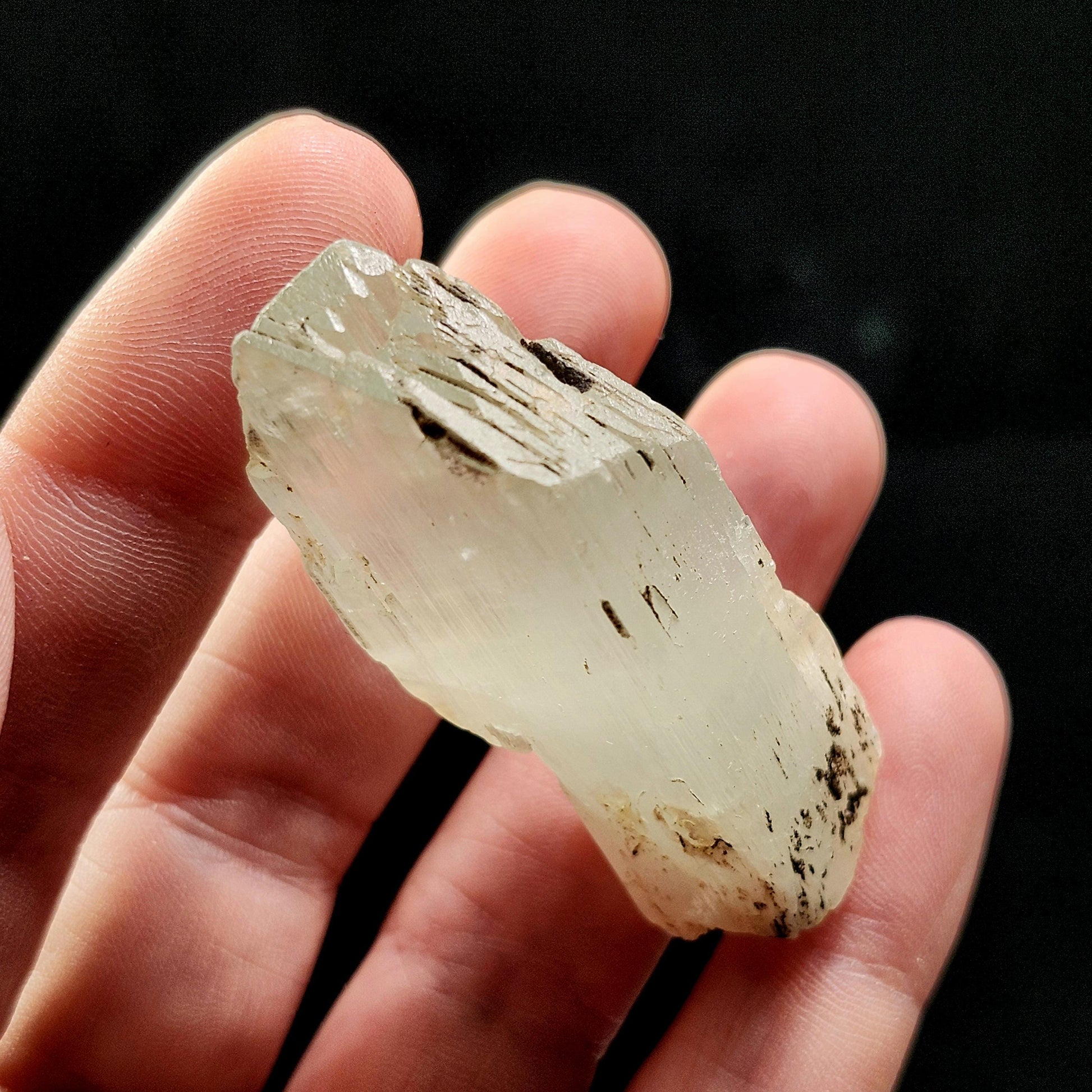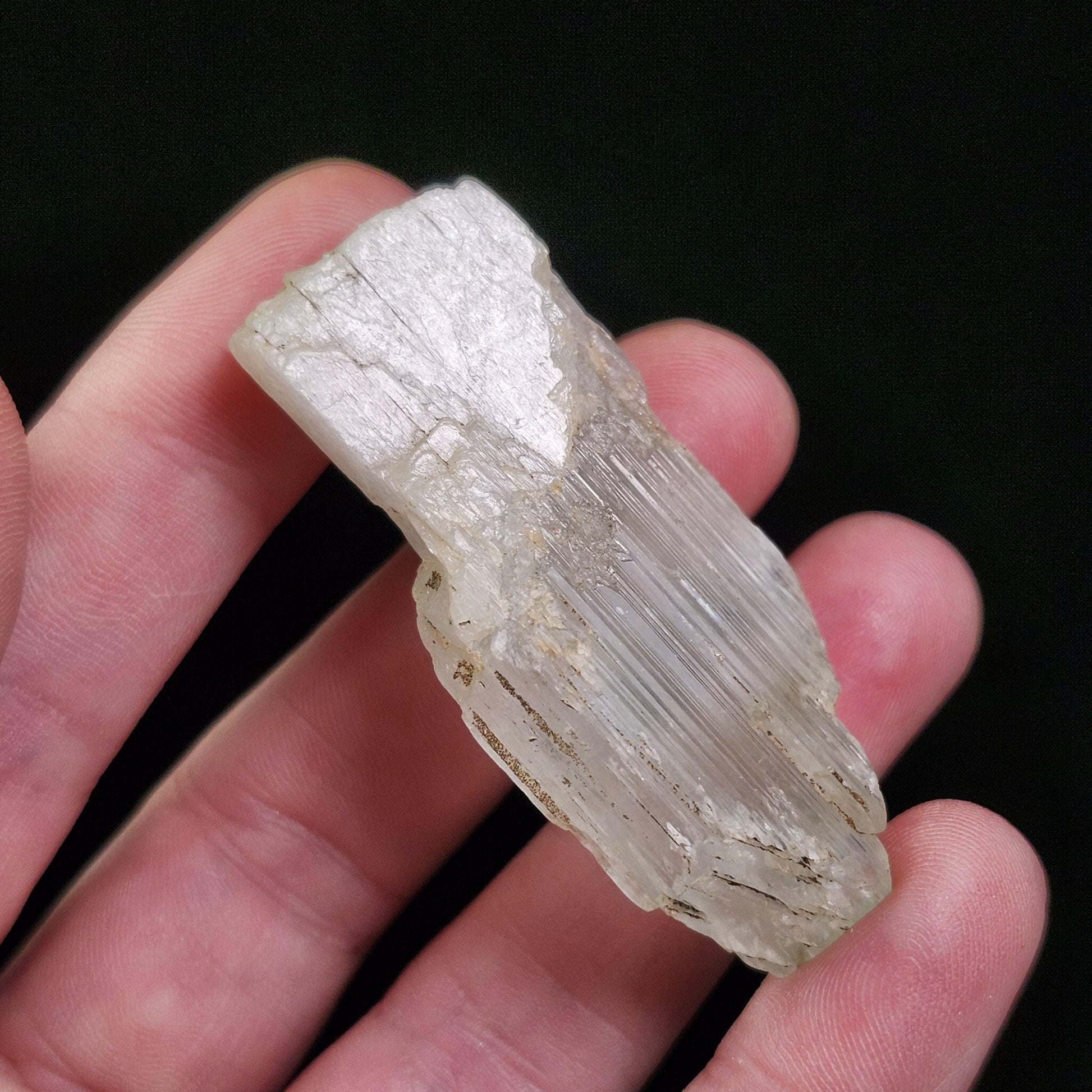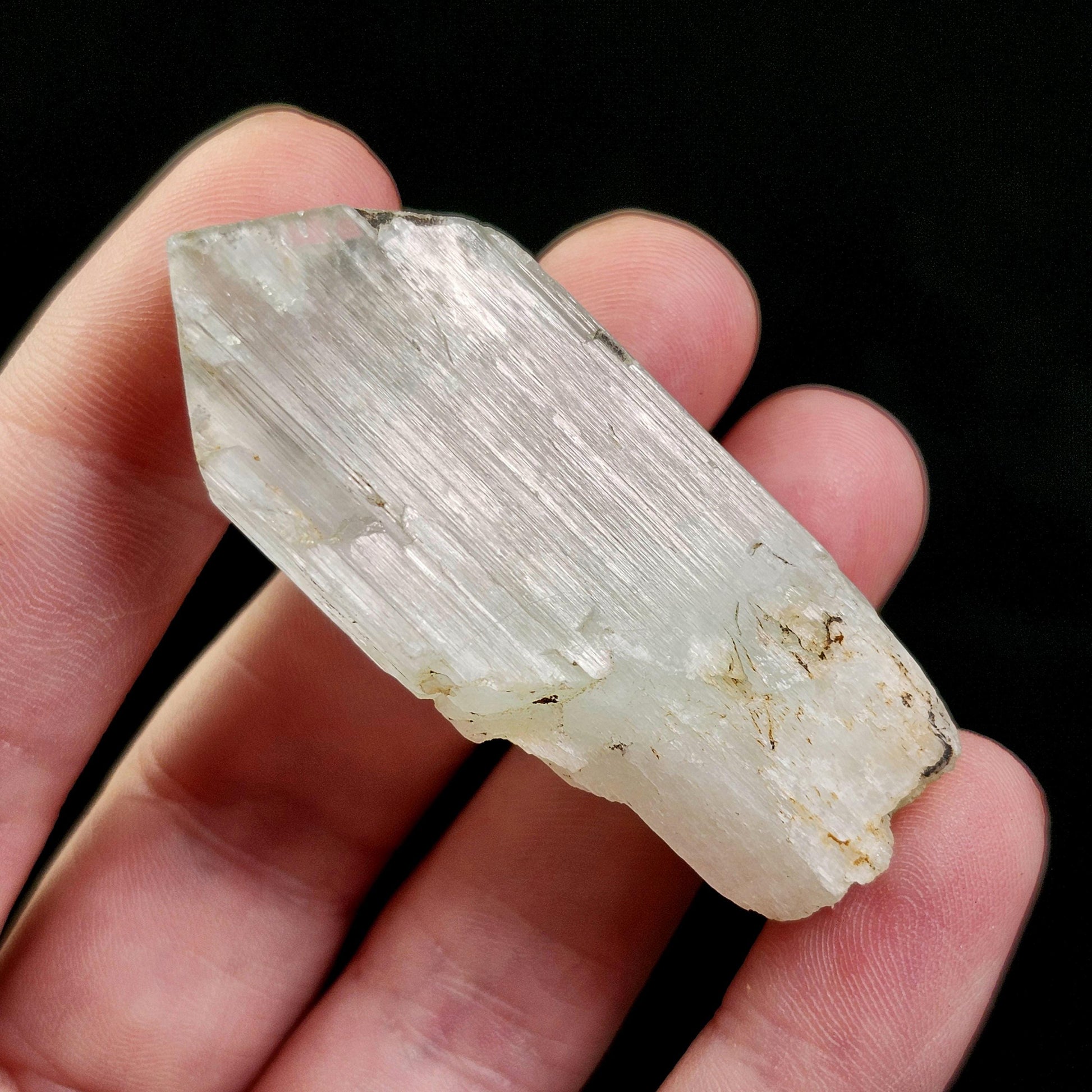 This deeply striated Hiddenite crystal has a very slight, pale green hue and a bright, glowing translucence. It exhibits etching on its naturally terminated point. This specimen measures 50mm by 21mm by 12mm and weighs 29 grams.