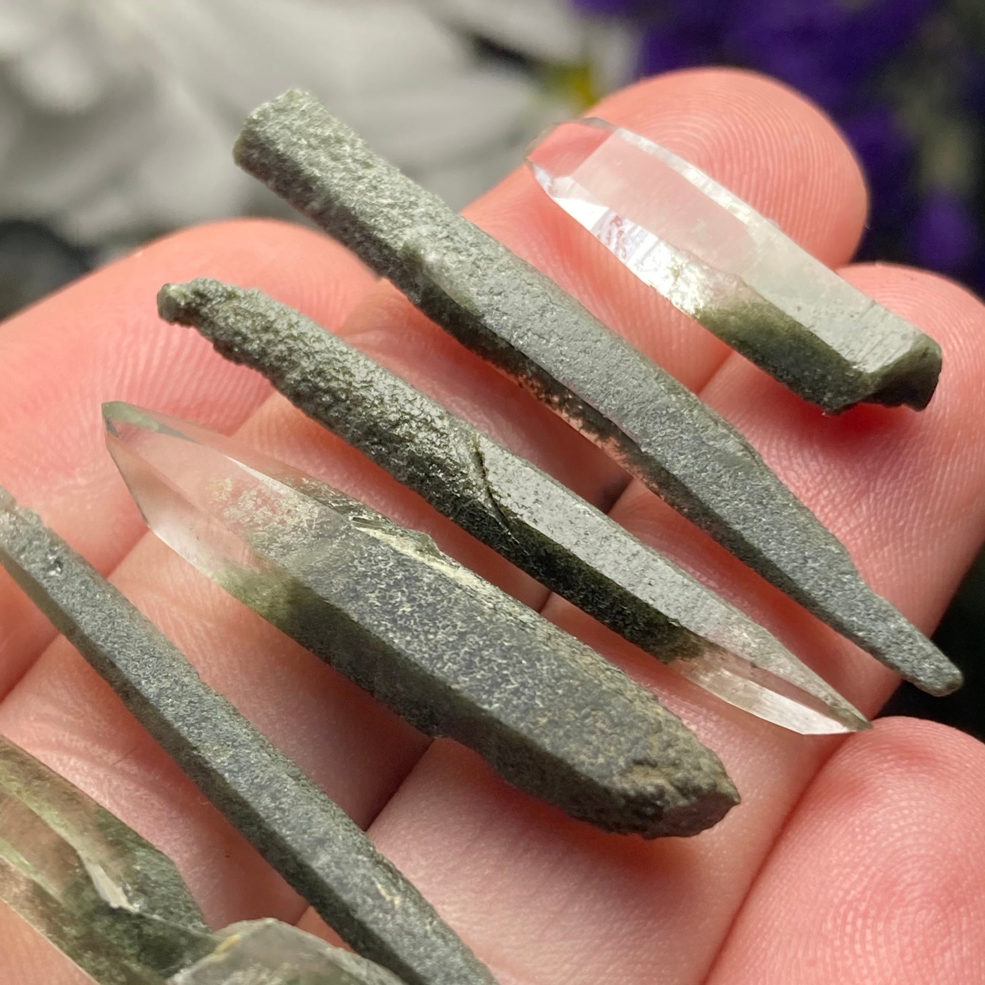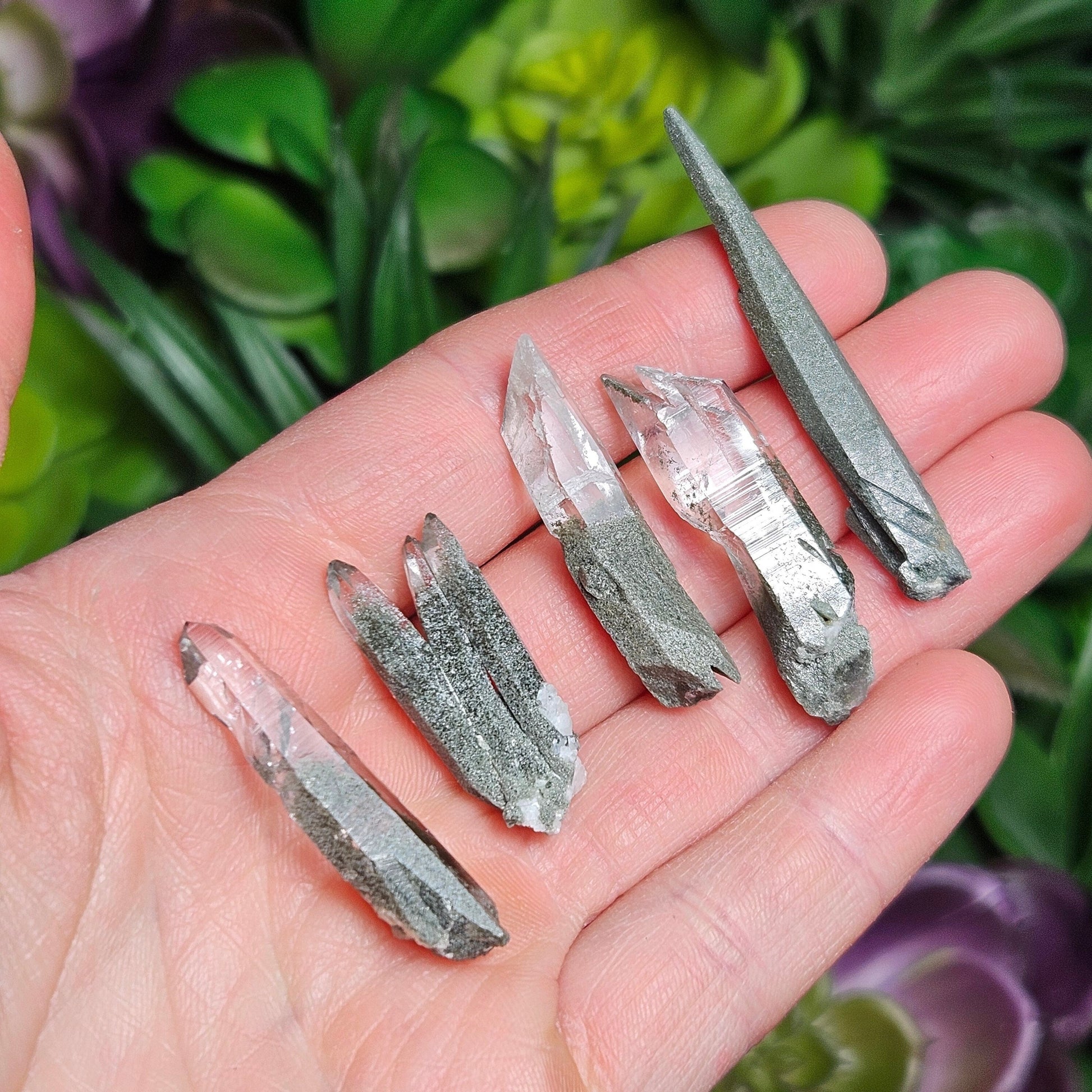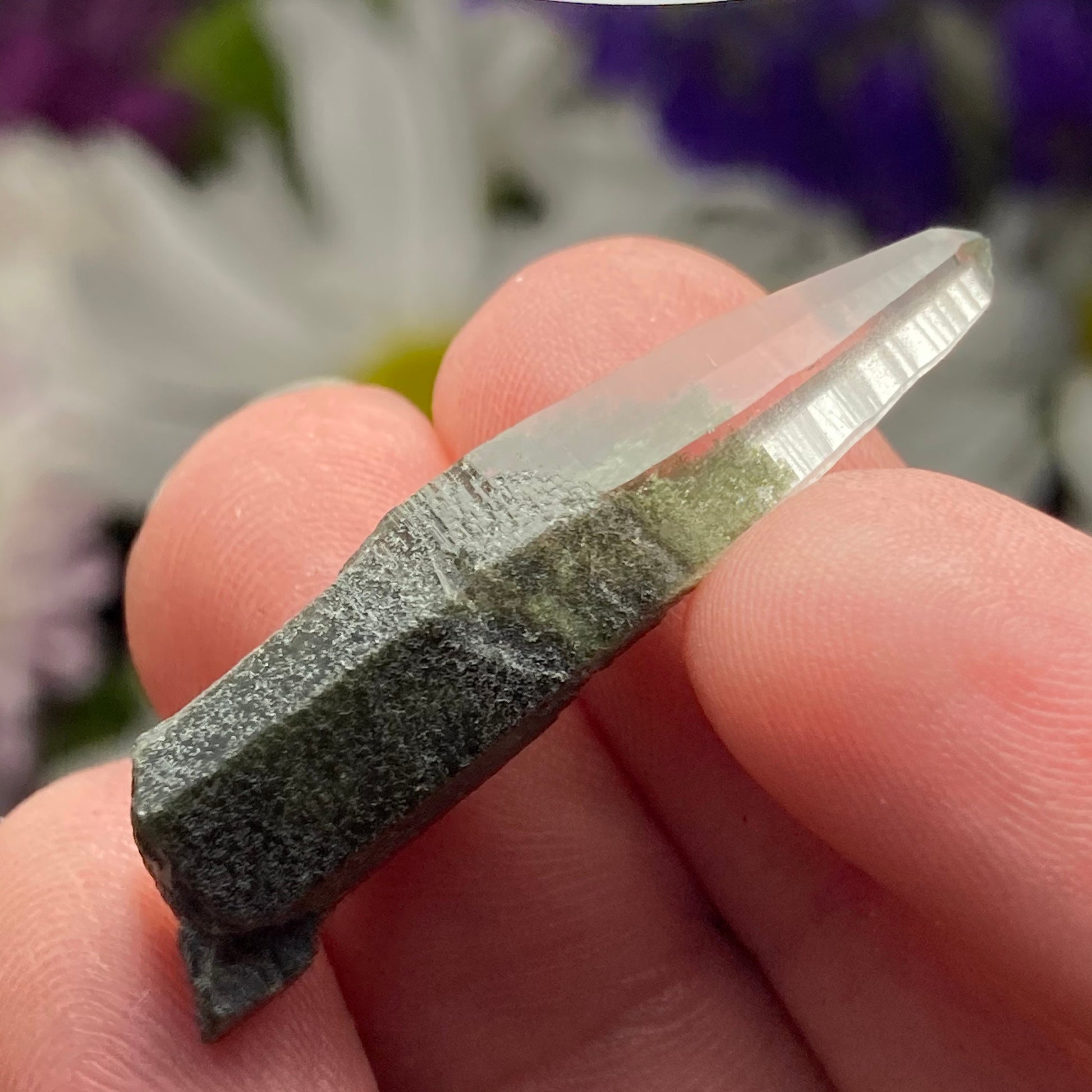 These Chlorite included Himalayan Quartz crystals come from Ganesh Himāl, a region in the Himalayan Mountain range in Nepal. Mount Ganesh is naturally shaped like an elephant and is named after the Hindu deity with an Elephant head as his own. Held sacred to the Nepalese people, these crystals are known by the Shamans of the area as the "Eyes of God", containing wisdom from the Ascended Masters of the astral plane. Each crystal is hand collected by the traveling Sherpas of the Himalayas, whose specialty is to traverse these mountain regions. With a distinct prase shaped termination and "barcode" striations often seen in Lemurian Seed crystals these high frequency Quartz crystals are filled with a variety of dark green Chlorite inclusions and have a high natural sheen. Some specimens are clusters of crystal points or have manifestation, or bridge, inclusions within them.