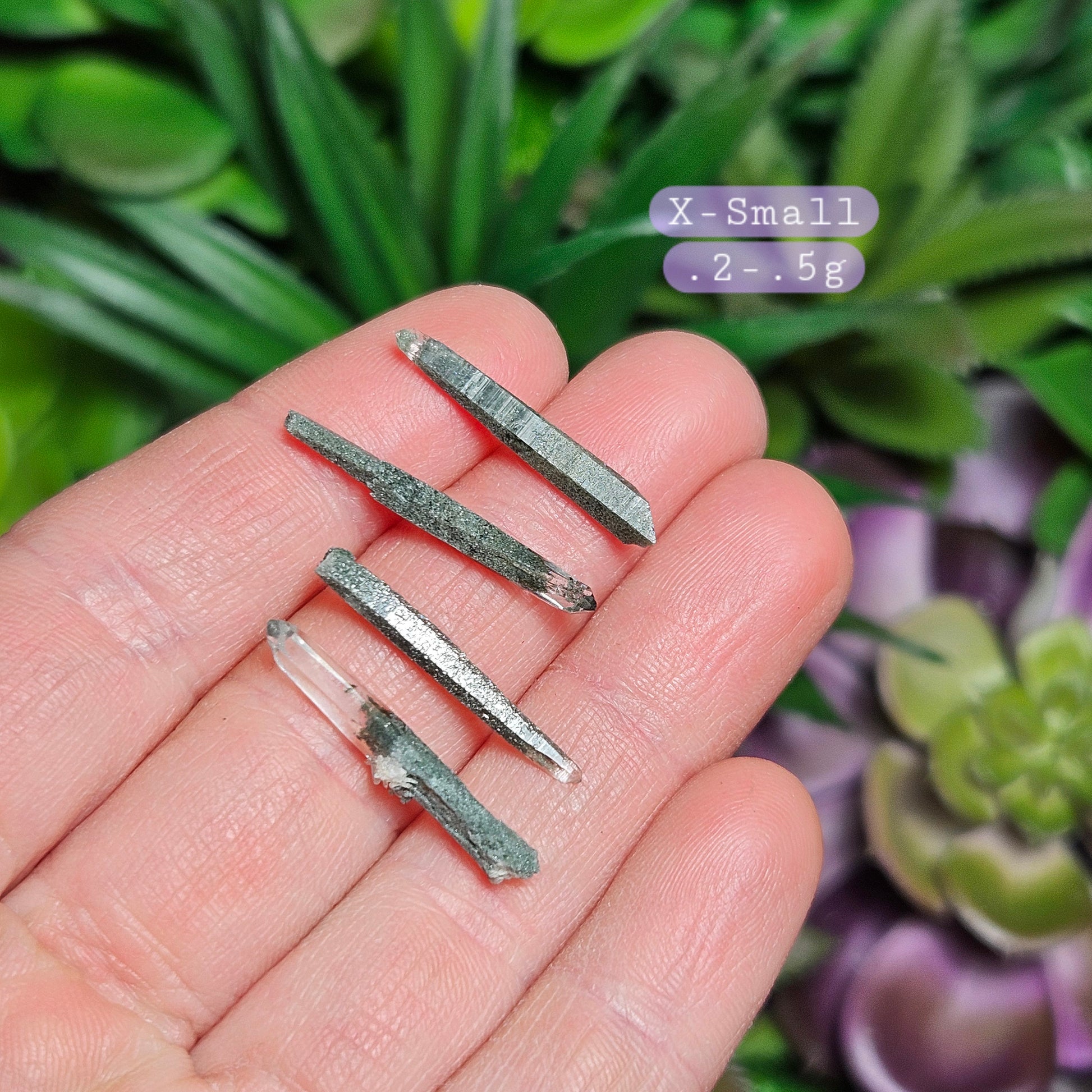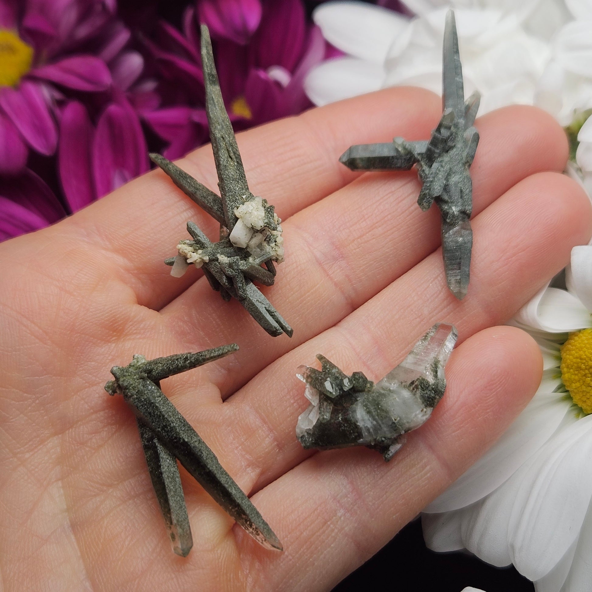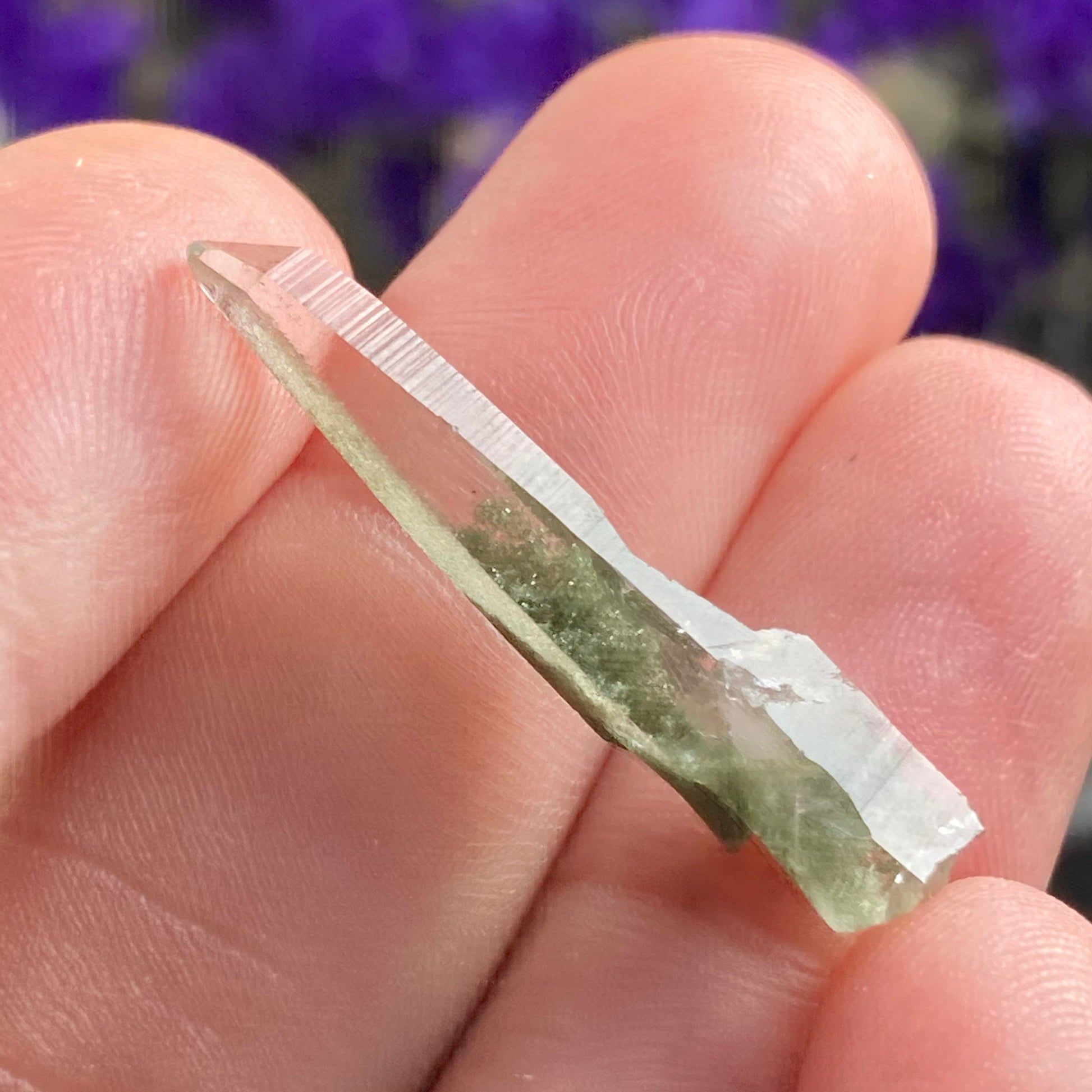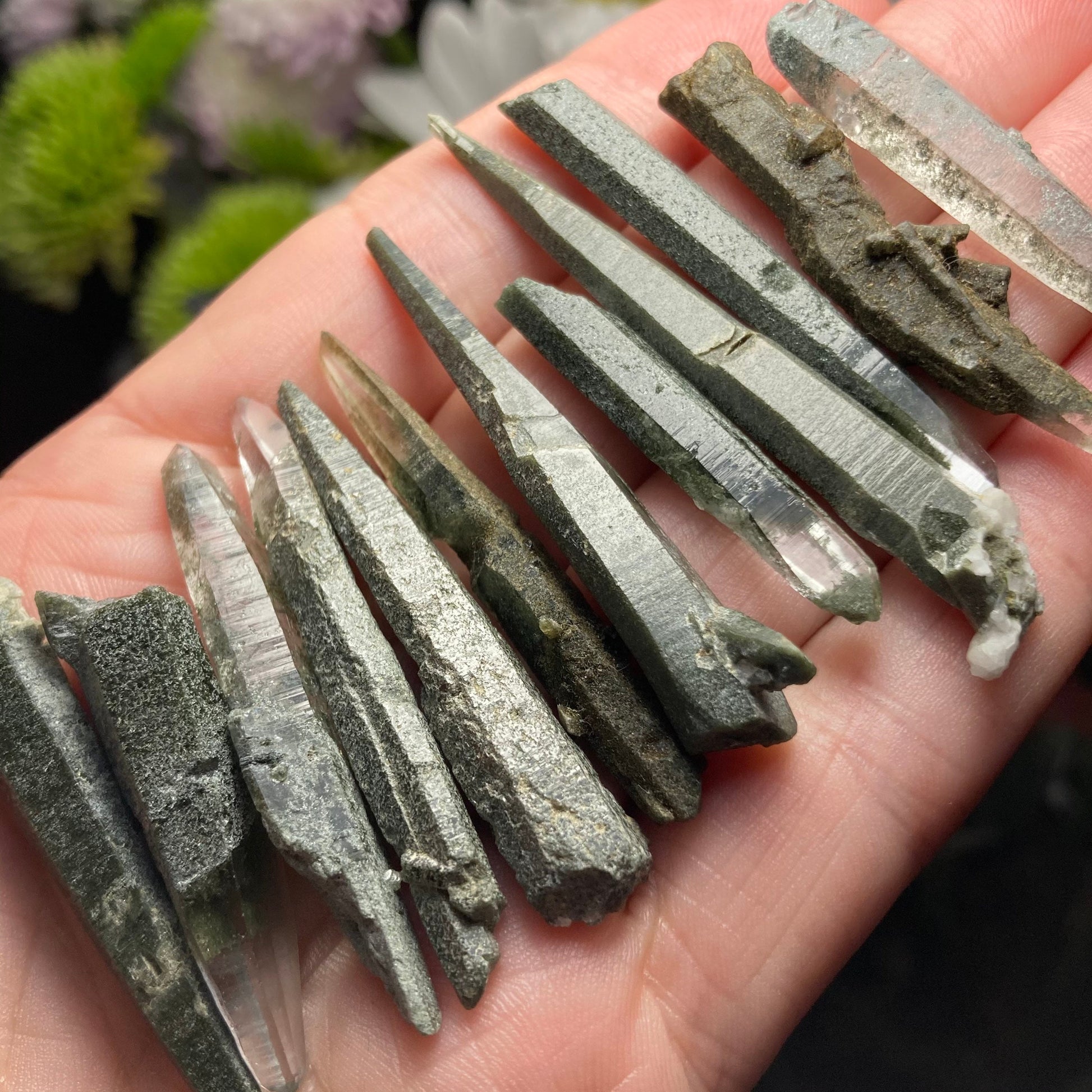 These Chlorite included Himalayan Quartz crystals come from Ganesh Himāl, a region in the Himalayan Mountain range in Nepal. Mount Ganesh is naturally shaped like an elephant and is named after the Hindu deity with an Elephant head as his own. Held sacred to the Nepalese people, these crystals are known by the Shamans of the area as the "Eyes of God", containing wisdom from the Ascended Masters of the astral plane. Each crystal is hand collected by the traveling Sherpas of the Himalayas, whose specialty is to traverse these mountain regions. With a distinct prase shaped termination and "barcode" striations often seen in Lemurian Seed crystals these high frequency Quartz crystals are filled with a variety of dark green Chlorite inclusions and have a high natural sheen. Some specimens are clusters of crystal points or have manifestation, or bridge, inclusions within them.