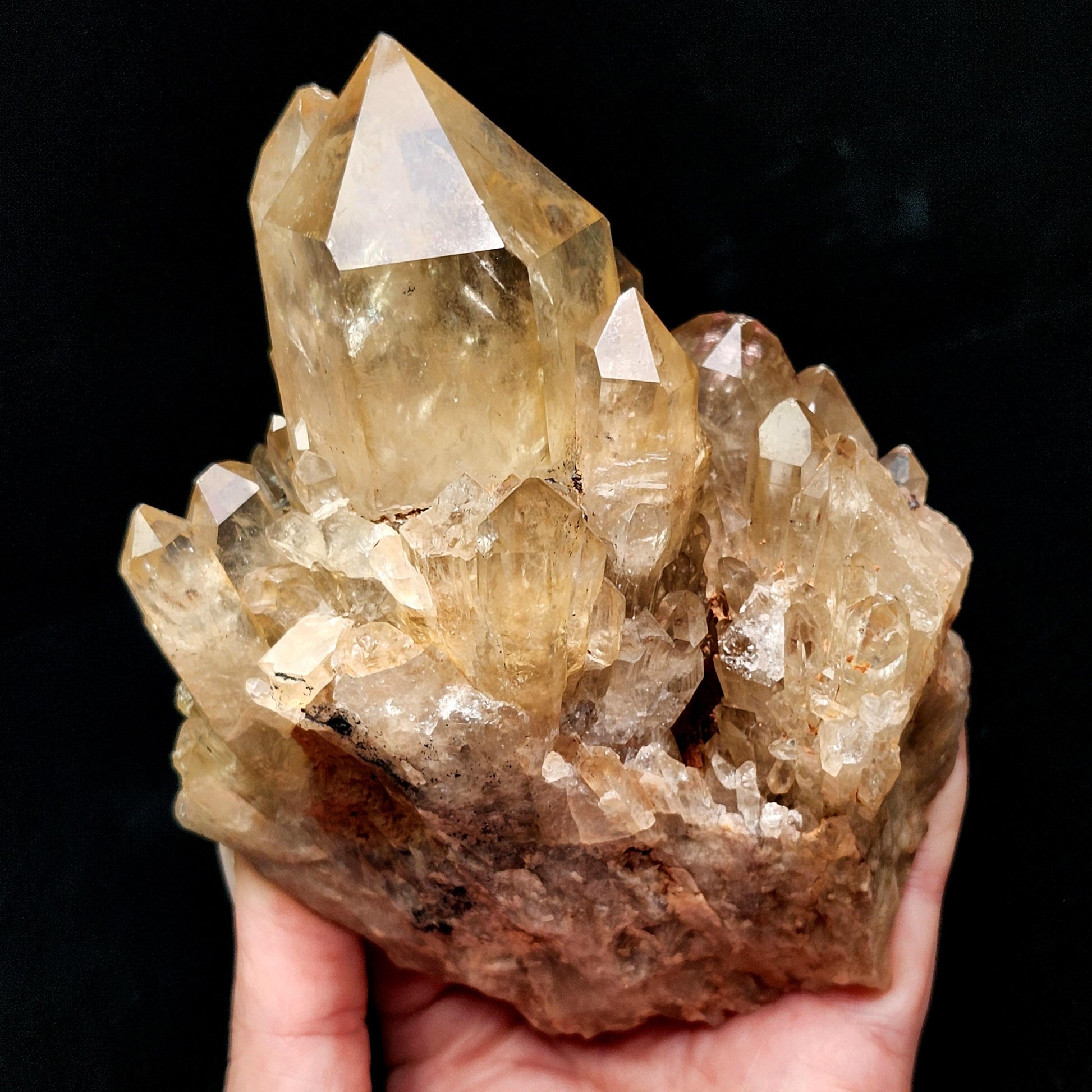 This large Kundalini Citrine crystal has a smoky coloring with a golden hue that illuminates when backlit. It exhibits cascading terminations that catch the light, causing it to shine at any angle. This specimen measures approximately 135mm by 65mm and weighs 1.6 pounds.