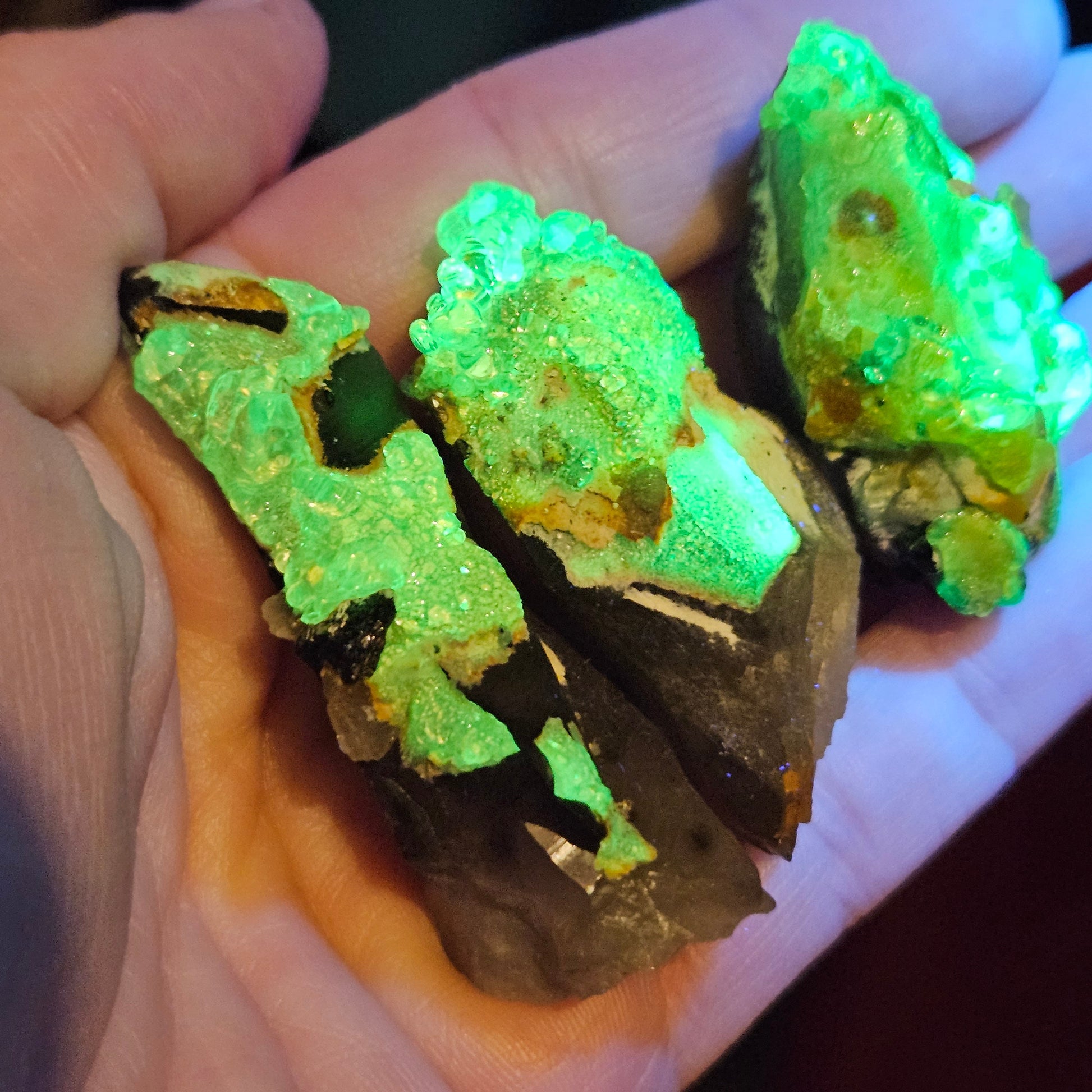 I am letting just a few more of these gorgeous Erongo Mountain region specimens from Namibia! These are a collector's dream, with VIVID inclusions of Hyalite Opal on terminated Smoky Quartz crystals. Each of these specimens have been high graded for their natural crystal faces and exhibit distinct Hyalite inclusions that will glow under an ultraviolet light.