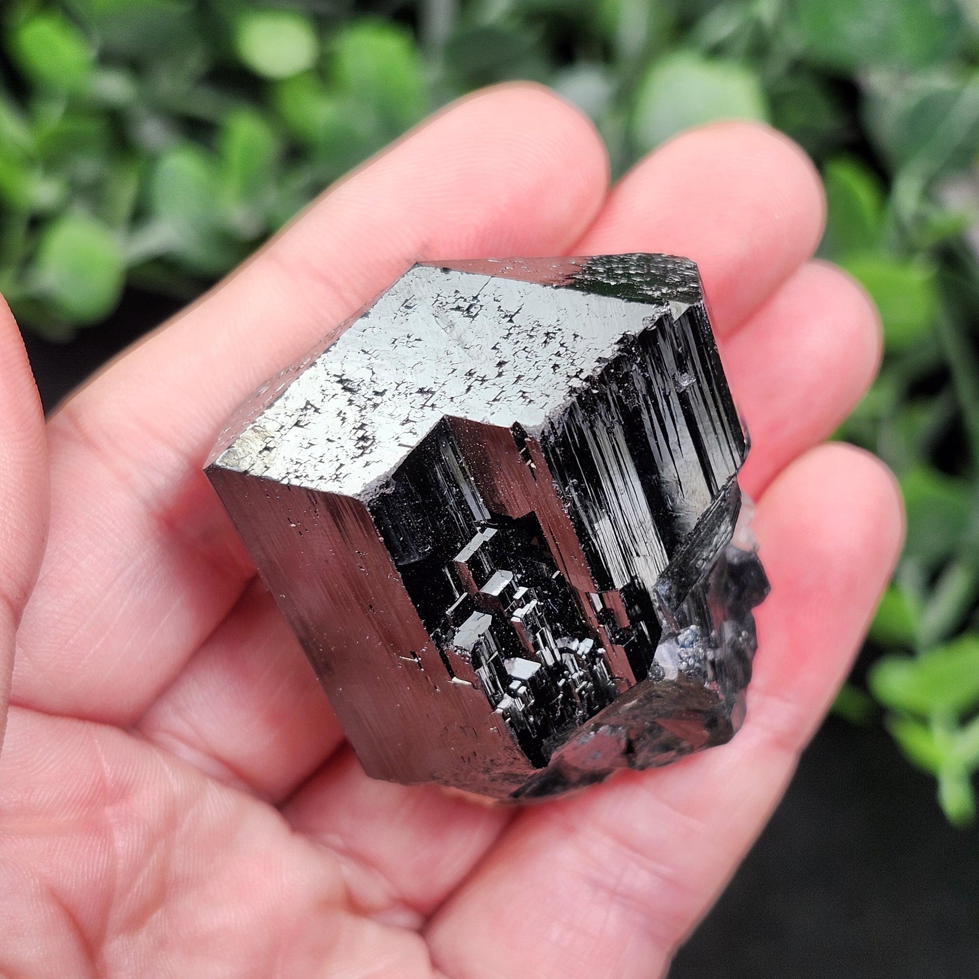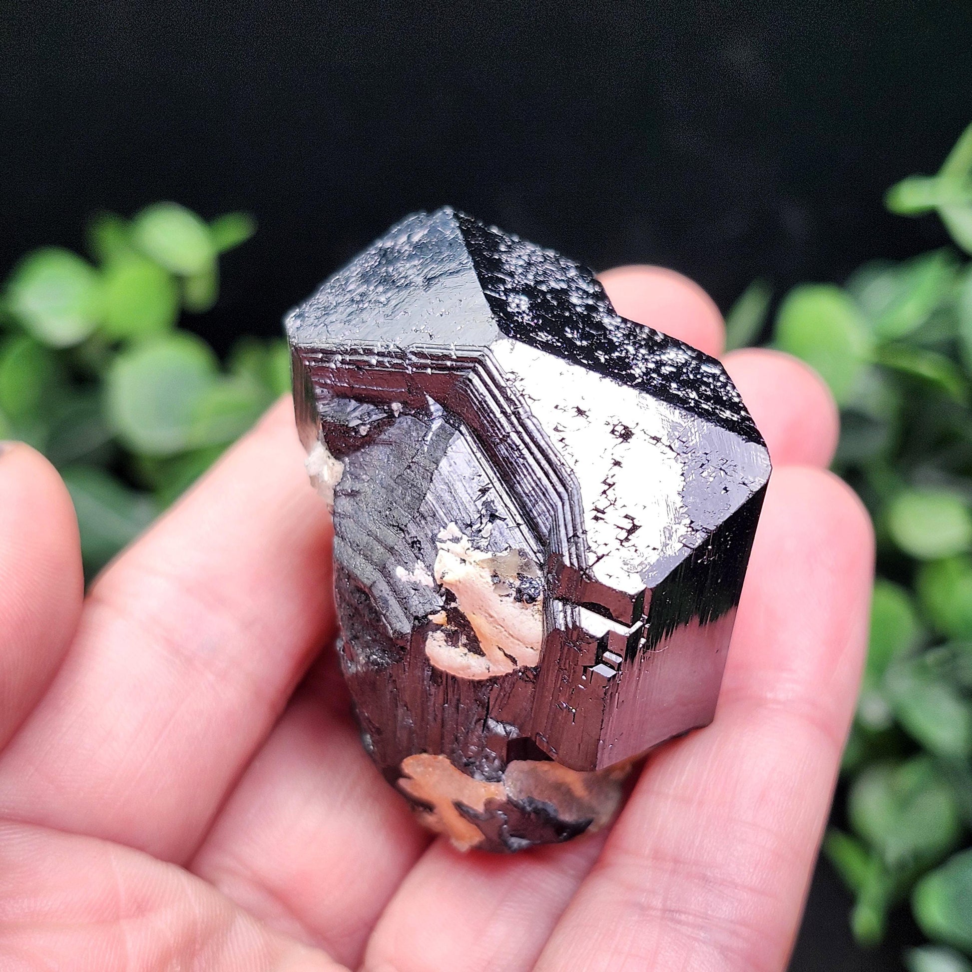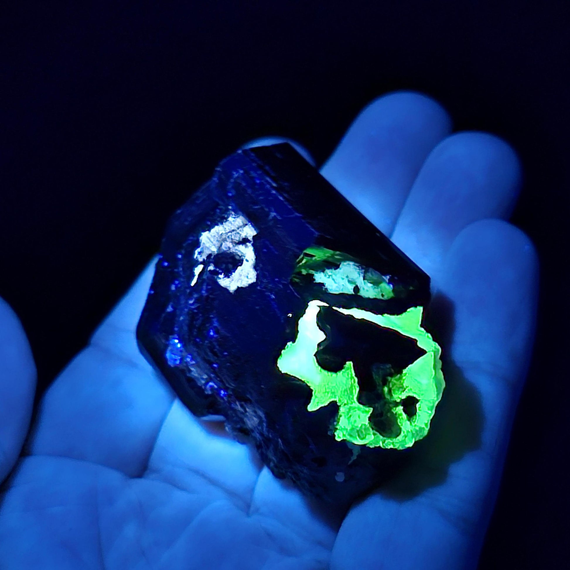 This specimen from the Erongo Mountain region of Namibia offers a special combination of gems growing together. It exhibits inclusions of fluorescent Hyalite Opal embedded within a chunky Black Tourmaline. The Hyalite Opal glows with a colorful, saturated brilliance when under a black light - a rare quality in the mineral kingdom! This specimen measures 44mm by 30mm and weighs 79.4 grams.