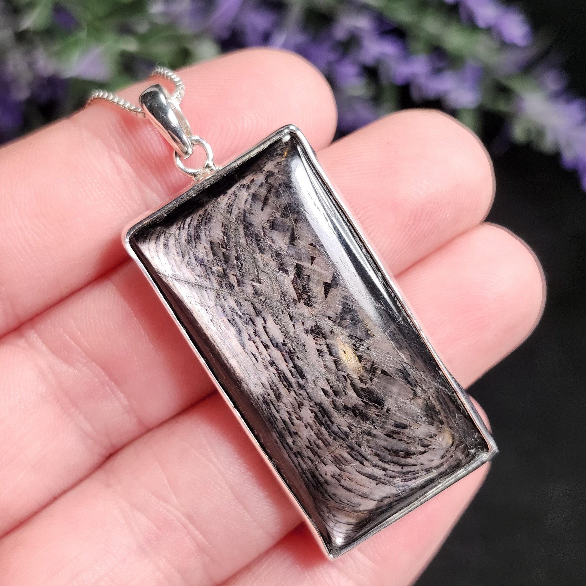This polished Hypersthene crystal has a strong chatoyancy that flashes at different angles. This crystal has been custom created into a sturdy piece of jewelry using .925 Sterling Silver. This pendant measures approximately 47mm by 20mm. The silver chain used in the photos is to help envision how this pendant will look when adorned but is not included in the listing.